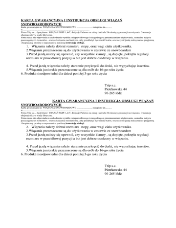 KARTA GWARANCYJNA I INSTRUKCJA OBSŁUGI WIĄZAŃ SNOWBOARODOWYCH Karta gwarancyjna na WIĄZANIA SNOWBOARDOWE .......................... zakupione dn........... w................................................................................................................. Firma Trip s.c., dystrybutor WIĄZAŃ SKIP I „44”, dziękuje Państwu za zakup i udziela 24 miesięcy gwarancji na wiązania. Gwarancja obejmuje ukryte wady fabryczne. Firma nasza nie odpowiada za uszkodzenia wynikłe z nieprawidłowego i niezgodnego z przeznaczeniem użytkowania, naturalne zużycie poszczególnych elementów, oraz uszkodzenia mechaniczne. Aby przedłużyć żywotność butów, oraz uczynić jazdę maksymalnie przyjemną i bezpieczną, prosimy o zapoznanie z poniższą instrukcją obsługi. 1. Wiązania należy dobrać rozmiaru stopy, oraz wagi ciała użytkownika. 2.Wiązania przeznaczone są do użytkowania w zestawie ze snowboardem 3.Przed jazdą należy się upewnić, czy wszystkie klamry , są dopięte, pokrętła regulacji rozmiaru w prawidłowej pozycji a but jest dobrze osadzony w wiązaniu. 4. Przed jazdą wiązania należy starannie przykręcić do deski, nie wypychając insertów. 5.Wiązania juniorskie przeznaczone są dla osób do 16-go roku życia 6. Produkt nieodpowiedni dla dzieci poniżej 3-go roku życia Trip s.c. Piotrkowska 44 90-265 łódź KARTA GWARANCYJNA I INSTRUKCJA OBSŁUGI WIĄZAŃ SNOWBOARODOWYCH Karta gwarancyjna na WIĄZANIA SNOWBOARDOWE .......................... zakupione dn........... w................................................................................................................. Firma Trip s.c., dystrybutor WIĄZAŃ SKIP I „44”, dziękuje Państwu za zakup i udziela 24 miesięcy gwarancji na wiązania. Gwarancja obejmuje ukryte wady fabryczne. Firma nasza nie odpowiada za uszkodzenia wynikłe z nieprawidłowego i niezgodnego z przeznaczeniem użytkowania, naturalne zużycie poszczególnych elementów, oraz uszkodzenia mechaniczne. Aby przedłużyć żywotność butów, oraz uczynić jazdę maksymalnie przyjemną i bezpieczną, prosimy o zapoznanie z poniższą instrukcją obsługi. 2. Wiązania należy dobrać rozmiaru stopy, oraz wagi ciała użytkownika. 2.Wiązania przeznaczone są do użytkowania w zestawie ze snowboardem 3.Przed jazdą należy się upewnić, czy wszystkie klamry , są dopięte, pokrętła regulacji rozmiaru w prawidłowej pozycji a but jest dobrze osadzony w wiązaniu. 4. Przed jazdą wiązania należy starannie przykręcić do deski, nie wypychając insertów. 5.Wiązania juniorskie przeznaczone są dla osób do 16-go roku życia 6. Produkt nieodpowiedni dla dzieci poniżej 3-go roku życia Trip s.c. Piotrkowska 44 90-265 łódź