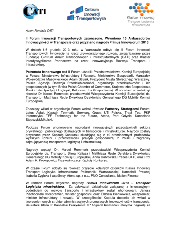 Autor: Fundacja CATI II Forum Innowacji Transportowych zakończone. Wyłoniono 15 Ambasadorów Innowacyjności w Transporcie oraz przyznano nagrody Primus Innovatorum 2013. W dniach 5-6 grudnia 2013 roku w Warszawie odbyło się II Forum Innowacji Transportowych Innowacje na rzecz zrównoważonego rozwoju, zorganizowane przez Fundację Centrum Analiz Transportowych i Infrastrukturalnych (CATI) oraz Klaster Interdyscyplinarne Partnerstwo na rzecz Innowacyjnego Rozwoju Transportu i Infrastruktury. Patronatu honorowego nad II Forum udzielili: Przedstawicielstwo Komisji Europejskiej w Polsce, Ministerstwo Infrastruktury i Rozwoju, Ministerstwo Gospodarki, Marszałek Województwa Mazowieckiego Adam Struzik, Prezydent Miasta Stołecznego Warszawy, Polska Agencja Rozwoju Przedsiębiorczości, organizacje przedsiębiorców i izb gospodarczych (w tym British Polish Chamber of Commerce, Krajowa Izba Gospodarcza, Polska Izba Spedycji i Logistyki, Północna Izba Gospodarcza). W obradach uczestniczył również Dr Marcel Rommerts przedstawiciel Wiceprezydenta Komisji Europejskiej ds. Transportu i Matthiasa Reute Dyrektora Dyrektoriatu Generalnego DG Mobility Komisji Europejskiej. Znaczący wkład w organizację Forum wnieśli również Partnerzy Strategiczni Forum: Lotos Asfalt, Kapsch Telematic Services, Grupa UTI Polska, Track Tec, PKP Informatyka, TFF Technology for the Future, Atena, Port Gdynia, Kancelaria Stopczyk&Mikulski. Podczas Forum uhonorowano nagrodami innowacyjnych przedstawicieli sektora prywatnego i publicznego działających w transporcie i infrastrukturze. Nagrody zostały przyznane przez Kapitułę Konkursu składającą się z 19 prominentnych profesorów wyższych uczelni i przedstawicieli praktyki gospodarczej z Polski i zagranicy zajmujących się transportem, logistyką i infrastrukturą. Nagrody wręczył Dr. Marcel Rommerts przedstawiciel Wiceprezydenta Komisji Europejskiej ds. Transportu Siima Kaliasa i Matthiasa Reute Dyrektora Dyrektoriatu Generalnego DG Mobility Komisji Europejskiej, Anna Dabrowska Prezes CATI, oraz Prof. Adam K. Prokopowicz Przewodniczący Kapituły Konkursu. W czasie Forum odbyło się również przyjęcie kolejnych członków Klastra Innowacji Transport Logistyka Infrastruktura: Politechniki Warszawskiej, Kancelarii Prawnej Izabella Żyglicka i wspólnicy, Atena sp. z o.o., PNO Consultants, Idalion Finanse. W ramach Forum wręczono nagrody Primus Innovatorum 2013 – Transport Logistyka Infrastruktura. Za całokształt działalności związanej z innowacyjnym podejściem do rozwoju transportu i infrastruktury zostali uhonorowani: Janusz Piechociński, wicepremier, minister gospodarki oraz Elżbieta Bieńkowska, wicepremier, minister infrastruktury i rozwoju. W szczególności Kapituła doceniła ich wkład w tworzenie nowych struktur administracyjnych promujących innowacyjność w transporcie. Sekretarz Stanu w Kancelarii Prezydenta RP Olgierd Dziekoński otrzymał nagrodę za wieloletni wkład w rozwój transportu i infrastruktury oraz stworzenie w Kancelarii Prezydenta systemu wsparcia innowacji w tych dziedzinach. Za szczególne, wieloletnie osiągnięcia i wsparcie innowacji transportowych, logistycznych i infrastrukturalnych nagrodą uhonorowani zostali Mieczysław Struk, marszałek woj. pomorskiego oraz Roman Ciepiela, wicemarszałek woj. małopolskiego. Nagrode otrzymali także prezydenci miast: Rzeszowa – Tadeusz Ferenc, Katowic – Piotr Uszok, Gdyni – Wojciech Szczurek, Gdańska – Paweł Adamowicz. Za wieloletnią działalność oraz inicjatywy społeczne na rzecz rozwoju transportu wyróżniony nagrodą został Józef Marek Kowalczyk – Prezes Stowarzyszenia Ekspertów i Menedżerów Transportu Szynowego oraz Przewodniczący Komitetu Infrastruktury Krajowej Izby Gospodarczej KIG. Za wybitne osiągnięcia i innowacyjność w transporcie, w sektorze prywatnym, w tym wprowadzenie spółki Newag na Giełdę Papierów Wartościowych, nagrodę otrzymał Zbigniew Jakubas. Kapituła przyznała także międzynarodową nagrodę Primus Innovatorum 2013, której odbiorcą został Port w Nowym Orleanie (USA). Laureatami nagrody Primus Innovatorum 2013 zostały także dwie uczelnie wyższe: Akademia Morska w Gdyni oraz Akademia Leona Koźmińskiego. Za innowacyjne przedsięwzięcia Nagrodą Innowacyjności w Transporcie i tytułem Ambasadorów Innowacyjności w Transporcie uhonorowano: • • • • • • • • • • • • • Bamaar sp. z o.o. Kolejowe Zakłady Nawierzchniowe „Bieżanów”, Laude Smart Intermodal S.A. Warszawska Kolej Dojazdowa, Zakłady Automatyki Kombud, Przedsiębiorstwo Wdrożeniowo-Produkcyjne „Neel” sp z o.o. ERS Railways B.V. Lotos Asfalt sp. z o.o. Zarząd Dróg Miejskich w Gliwicach. SSM spółka z o.o. Orange Polska. Rafał Setlak, Marcin Fice z Politechniki Śląskiej w Gliwicach. CallFreedom Sp. z o.o., Instytut Logistyki i Magazynowania