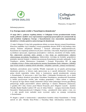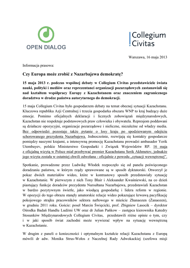 Warszawa, 16 maja 2013 Informacja prasowa: Czy Europa może zrobić z Nazarbajewa demokratę? 15 maja 2013 r. podczas wspólnej debaty w Collegium Civitas przedstawiciele świata nauki, polityki i mediów oraz reprezentanci organizacji pozarządowych zastanawiali się nad kształtem współpracy Europy z Kazachstanem oraz znaczeniem zagranicznego doradztwa w drodze państwa autorytarnego do demokracji. 15 maja Collegium Civitas było gospodarzem debaty na temat obecnej sytuacji Kazachstanu. Kluczowa republika Azji Centralnej i trzecia gospodarka obszaru WNP to kraj budzący duże emocje. Pomimo oficjalnych deklaracji i licznych zobowiązań międzynarodowych, Kazachstan nie respektuje podstawowych praw człowieka i obywatela. Represjom poddawani są działacze opozycyjni, organizacje pozarządowe i nieliczne, niezależne od władzy media. Bez odpowiedzi pozostaje także pytanie o losy kraju po spodziewanym odejściu schorowanego prezydenta Nazarbajewa. Jednocześnie, rozwijają się kontakty gospodarcze pomiędzy naszymi krajami, a intensywną promocję Kazachstanu prowadzi ambasador Yerik Utembayev, polskie Ministerstwo Gospodarki i Związek Województw RP. 16 maja z oficjalną wizytą w Polsce miał przebywać premier Kazachstanu Serik Akhmetov, jednakże jego wizyta została w ostatniej chwili odwołana - oficjalnie z powodu „sytuacji wewnętrznej”. Spotkanie, prowadzone przez Ludwikę Włodek rozpoczęło się od panelu poświęconego doradzaniu państwu, w którym rządy sprawowane są w sposób dyktatorski. Otworzył je pokaz dwóch materiałów wideo, które w kontrastowy sposób przedstawiały sytuację w Kazachstanie. W pierwszym z nich Tony Blair i Aleksander Kwaśniewski, na co dzień piastujący funkcje doradców prezydenta Nursułtana Nazarbajewa, przedstawiali Kazachstan w bardzo pozytywnym świetle, jako wiodącą gospodarkę i lidera reform w regionie. W opozycji do tego obrazu stanęły amatorskie relacje wideo pokazujące krwawą pacyfikację pokojowego strajku pracowników sektora naftowego w mieście Zhanaozen (Żanaozen), w grudniu 2011 roku. Goście: poseł Marcin Święcicki, prof. Zbigniew Lasocik – dyrektor Ośrodka Badań Handlu Ludźmi UW oraz dr Julian Pańkow – zastępca kierownika Katedry Stosunków Międzynarodowych Collegium Civitas, przedstawili różne opinie o tym, czy i w jaki sposób świat zachodni może wywierać wpływ na sytuację wewnętrzną w Kazachstanie. W drugim z paneli o konieczności i optymalnym kształcie relacji Kazachstanu z Europą mówili dr adw. Monika Strus-Wołos z Naczelnej Rady Adwokackiej (szefowa misji obserwacyjnej NRA w Kazachstanie), Lyudmyla Kozlovska, Prezes Fundacji Otwarty Dialog, Muratbek Ketebayev, działacz obywatelski z Kazachstanu, założyciel fundacji Civic Activity, członek kierownictwa zdelegalizowanej partii Alga! oraz Michał Potocki z Dziennika Gazety Prawnej. Paneliści zgodzili się, że kluczowym czynnikiem poprawiającym swobody obywatelskie, a jednocześnie długofalowo wzmacniającym biznes, w tym inwestycje zagraniczne, jest wprowadzanie rządów prawa w miejsce obecnego systemu opartego na korupcji, nepotyzmie i prymacie arbitralnie formułowanej woli politycznej ponad prawem. Debata spotkała się z żywym zainteresowaniem środowiska akademickiego, reprezentantów środowiska prawniczego, a także studentów, w tym licznego grona kazachskiej młodzieży studiującej w Polsce. Współorganizatorem wydarzenia była Fundacja Otwarty Dialog, która prowadzi działania na rzecz praw człowieka, demokratyzacji i rządów prawa w krajach dawnego bloku wschodniego, dla której Kazachstan pozostaje jednym z głównych obszarów zainteresowania i działalności. Mimo zaproszenia i potwierdzenia udziału w debacie, nie przybyli na nią dr Irenusz Bil, dyrektor fundacji Aleksandra Kwaśniewskiego Amicus Europae oraz przedstawiciel OBWE. ### Dalszych informacji udzielają Biura Prasowe: - Collegium Civitas, tel. 22 656 71 80, email: [email protected] - Fundacji Otwarty Dialog: tel: +48 534 670 800 email: [email protected] www.odfoundation.eu