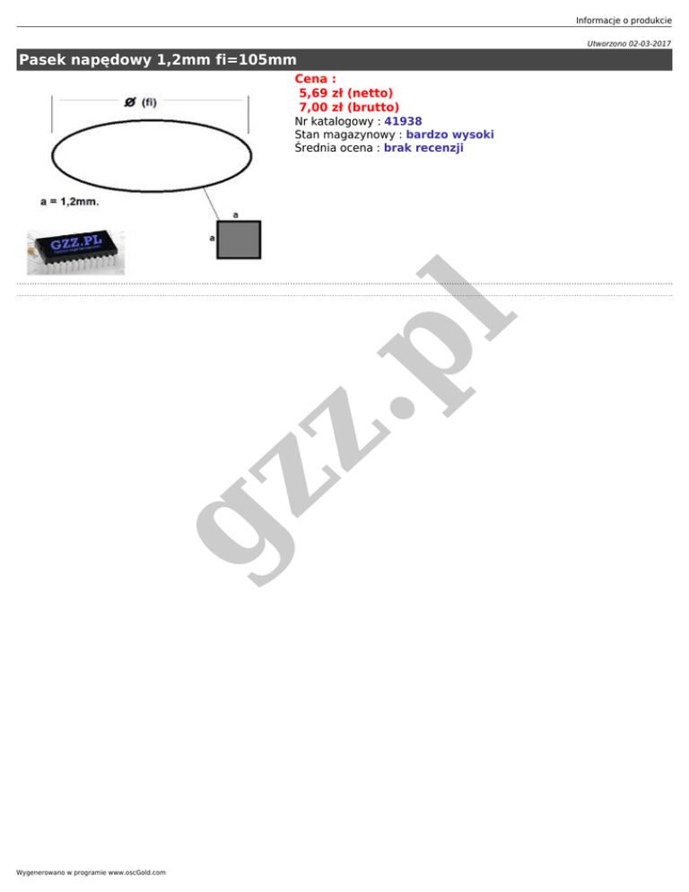 Informacje o produkcie Utworzono 02-03-2017 Pasek napędowy 1,2mm fi=105mm Cena : 5,69 zł (netto) 7,00 zł (brutto) gz z .p l Nr katalogowy : 41938 Stan magazynowy : bardzo wysoki Średnia ocena : brak recenzji Wygenerowano w programie www.oscGold.com