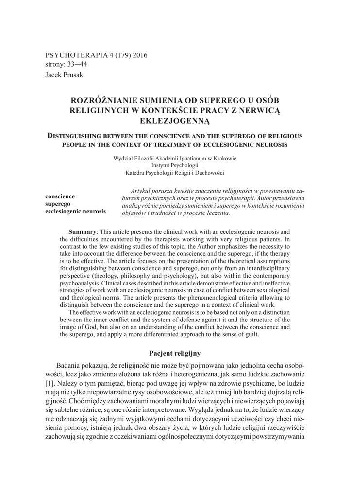 Psychoterapia 4 (179) 2016 strony: 33─44 Jacek Prusak Rozróżnianie sumienia od superego u osób religijnych w kontekście pracy z nerwicą eklezjogenną Distinguishing between the conscience and the superego of religious people in the context of treatment of ecclesiogenic neurosis Wydział Filozofii Akademii Ignatianum w Krakowie Instytut Psychologii Katedra Psychologii Religii i Duchowości conscience superego ecclesiogenic neurosis Artykuł porusza kwestie znaczenia religijności w powstawaniu zaburzeń psychicznych oraz w procesie psychoterapii. Autor przedstawia analizę różnic pomiędzy sumieniem i superego w kontekście rozumienia objawów i trudności w procesie leczenia. Summary: This article presents the clinical work with an ecclesiogenic neurosis and the difficulties encountered by the therapists working with very religious patients. In contrast to the few existing studies of this topic, the Author emphasizes the necessity to take into account the difference between the conscience and the superego, if the therapy is to be effective. The article focuses on the presentation of the theoretical assumptions for distinguishing between conscience and superego, not only from an interdisciplinary perspective (theology, philosophy and psychology), but also within the contemporary psychoanalysis. Clinical cases described in this article demonstrate effective and ineffective strategies of work with an ecclesiogenic neurosis in case of conflict between sexuological and theological norms. The article presents the phenomenological criteria allowing to distinguish between the conscience and the superego in a context of clinical work. The effective work with an ecclesiogenic neurosis is to be based not only on a distinction between the inner conflict and the system of defense against it and the structure of the image of God, but also on an understanding of the conflict between the conscience and the superego, and apply a more differentiated approach to the sense of guilt. Pacjent religijny Badania pokazują, że religijność nie może być pojmowana jako jednolita cecha osobowości, lecz jako zmienna złożona tak różna i heterogeniczna, jak samo ludzkie zachowanie [1]. Należy o tym pamiętać, biorąc pod uwagę jej wpływ na zdrowie psychiczne, bo ludzie mają nie tylko niepowtarzalne rysy osobowościowe, ale też mniej lub bardziej dojrzałą religijność. Choć między zachowaniami moralnymi ludzi wierzących i niewierzących pojawiają się subtelne różnice, są one różnie interpretowane. Wygląda jednak na to, że ludzie wierzący nie odznaczają się żadnymi wyjątkowymi cechami dotyczącymi uczciwości czy chęci niesienia pomocy, istnieją jednak dwa obszary życia, w których ludzie religijni rzeczywiście zachowują się zgodnie z oczekiwaniami ogólnospołecznymi dotyczącymi powstrzymywania 34 Jacek Prusak się przed seksem poza małżeństwem czy trwałym związkiem i unikania narkotyków. Mamy tutaj jednak do czynienia z zależnościami krzywoliniowymi, tak więc religijne myślenie, przeżywanie i zachowanie ludzi wierzących różni się w zależności od tego, w jakim stopniu są świadomi odpowiedzialności za podejmowane czyny oraz czy ta świadomość skłania ich ku lękowi czy jest zrównoważona emocjonalnie. W niektórych badaniach dotyczących stopnia lub rodzaju religijności najwięcej wspólnych cech występowało w grupach ekstremalnie różnych: „u niewierzących” i „wysoce religijnych” — obie zaś wyraźnie odróżniały się od wielkiej masy mniej wierzących, zwłaszcza w kwestii tolerancyjności i uprzedzeń wobec inaczej myślących [2]. Stąd też pacjent religijny określa osobę oceniającą świat z perspektywy swojej wiary w oparciu o trzy podstawowe wartości: (a) autorytet przyznawany religijnym liderom, (b) Biblię — bądź inną świętą księgę, (c) identyfikację z własną grupą religijną. Im większą wagę będzie nadawała tym wartościom w swoim życiu, tym bardziej według niego jest religijna. Takie osoby bywają określane jako „silnie zaangażowane religijnie”, „żarliwie wierzące” czy „głęboko religijne” [3]. Wśród specyficznych tematów, jakie pojawiają się w tej grupie pacjentów/klientów wymieniane są takie kwestie moralne, jak: poczucie wpływu (sprawczości), wina i neurotyczne poczucie winy, emocje i odpowiedzialność moralna, wolność i odpowiedzialność, wolna wola, głos sumienia, wartości religijne [4]. W przypadku wspomnianej grupy psychoterapeuci natrafiają na różne trudności, które w pośredni i bezpośredni sposób wpływają na podejmowane przez nich decyzje kliniczne. Badania pokazują bowiem, że osoby bardzo religijne postrzegają świat inaczej niż jednostki niereligijne, mają inne schematy poznawcze, w związku z tym inaczej postrzegają i psychoterapię. Niektóre grupy (wspólnoty) religijne mogą charakteryzować się wyższymi wskaźnikami problemów emocjonalnych, ale mogą opierać się szukaniu pomocy ze względu na swoje religijne przekonania dotyczące uzdrawiania i cierpienia i podejrzliwość wobec psychologii [5]. Bardzo religijne osoby — zwłaszcza kobiety — preferują terapeutów podzielających ich system wartości i oczekują interwencji religijnych (duchowych) w ramach psychoterapii. Mogą one unikać pomocy psychologicznej, jeśli w jej trakcie ich wartości i przekonania religijne stawiane są pod znakiem zapytania czy wręcz dyskredytowane [6]. Na podstawie badań nad związkiem oczekiwań osób bardzo religijnych z postawą psychoterapeutów (ich samookreśleniem się względem religii czy duchowości przed rozpoczęciem terapii) ustalono, że ważniejsza w ocenie psychoterapii pacjentów/klientów bardzo religijnych zdaje się akceptacja przez terapeutę ich religijnego systemu wartości niż przekonań [7]. Zdania są jednak podzielone, jeśli chodzi o ocenę, na ile kluczowe znaczenie dla udanej psychoterapii takich pacjentów 