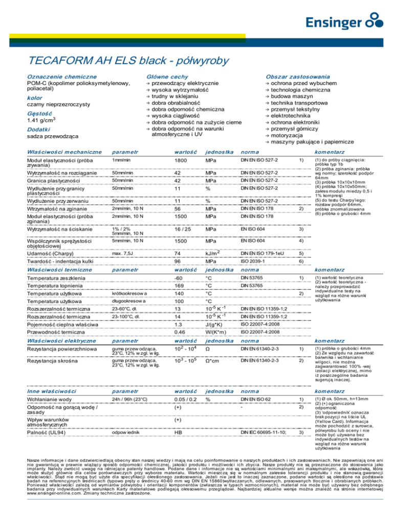 TECAFORM AH ELS black - półwyroby Oz nac z enie c hemic z ne POM-C (kopolimer polioksymetylenowy, poliacetal) k olor czarny nieprzezroczysty Gęs t oś ć 1.41 g/cm3 Dodat k i sadza przewodząca Wł a ś ci w o ś ci m e ch a n i czn e p a ra m e tr Moduł elastyczności (próba zrywania) 1mm/min Wytrzymałość na rozciąganie Granica plastyczności Główne c ec hy przewodzący elektrycznie wysoka wytrzymałość trudny w sklejaniu dobra obrabialność dobra odporność chemiczna wysoka ciągliwość dobra odporność na zużycie cierne dobra odporność na warunki atmosferyczne i UV j e d n o s tka n o rm a 1800 MPa DIN EN ISO 527-2 50mm/min 42 MPa DIN EN ISO 527-2 50mm/min 42 MPa DIN EN ISO 527-2 Wydłużenie przy granicy plastyczności 50mm/min 11 % DIN EN ISO 527-2 Wydłużenie przy zerwaniu 50mm/min 11 % DIN EN ISO 527-2 Wtrzymałość na zginanie 2mm/min, 10 N 56 MPa DIN EN ISO 178 Moduł elastyczności (próba zginania) 2mm/min, 10 N 1500 MPa DIN EN ISO 178 Wytrzymałość na ściskanie 1% / 2% 5mm/min, 10 N 16 / 25 MPa EN ISO 604 3) Współczynnik sprężystości objętościowej 5mm/min, 10 N 1500 MPa EN ISO 604 4) Udarność (Charpy) max. 7,5J 74 kJ/m 2 DIN EN ISO 179-1eU 5) 96 MPa ISO 2039-1 6) w a rto ś ć j e d n o s tka n o rm a -60 °C DIN 53765 DIN 53765 Twardość - indentacja kulki Wł a ś ci w o ś ci te rm i czn e p a ra m e tr Temperatura zeszklenia Temperatura topnienia w a rto ś ć Obs z ar z as t os owania ochrona przed wybuchem technologia chemiczna budowa maszyn technika transportowa przemysł tekstylny elektrotechnika ochrona elektroniki przemysł górniczy motoryzacja maszyny pakujące i papiernicze 169 °C Temperatura użytkowa krótkookresow a 140 °C Temperatura użytkowa długookresow a 100 °C Rozszerzalność termiczna 23-60°C, dł. 13 10 -5 K -1 DIN EN ISO 11359-1;2 Rozszerzalność termiczna 23-100°C, dł. 14 10 -5 K -1 DIN EN ISO 11359-1;2 1.3 J/(g*K) ISO 22007-4:2008 Pojemność cieplna właściwa ko m e n ta rz 1) 2) ko m e n ta rz 1) 2) 0.46 W/(K*m) ISO 22007-4:2008 Wł a ś ci w o ś ci e l e ktryczn e p a ra m e tr w a rto ś ć j e d n o s tka n o rm a Rezystancja powierzchniowa guma przew odząca, 23°C, 12% w zgl. w ilg. 10 2 - 10 4 Ω DIN EN 61340-2-3 1) Rezystancja skrośna guma przew odząca, 23°C, 12% w zgl. w ilg. 10 3 - 10 5 Ω*cm DIN EN 61340-2-3 2) In n e w ł a ś ci w o ś ci p a ra m e tr w a rto ś ć j e d n o s tka n o rm a Wchłanianie wody 24h / 96h (23°C) % DIN EN ISO 62 1) - 2) DIN IEC 60695-11-10; 3) Przewodność termiczna 0.05 / 0.2 Odporność na gorącą wodę / zasady (+) Wpływ warunków atmosferycznych (+) Palność (UL94) odpow iednik HB (1) do próby c iągnięc ia: próbka typ 1b (2) próba zginania: próbka wg normy; szerokość podpór 64mm (3) próbka 10x10x10mm (4) próbka 10x10x50mm; zakres modułu miedzy 0,5 i 1% kompresji (5) do testu Charpy’iego: rozstaw podpór 64mm, próbka znormalizowana (6) próbka o grubośc i 4mm (1) wartość teoretyc zna (2) wartość teoretyc zna należy przeprowadzić indywidualne testy na wzgląd na różne warunki użytkowania ko m e n ta rz (1) próbka o grubośc i 4mm (2) Ze względu na zawartość barwnika i wc hłanianie wilgoc i, nie można zagwarantować 100% -wej izolac ji elektryc znej, mimo iż poszc zególne badania sugerują inac zej. ko m e n ta rz (1) Ø ok. 50mm, h=13mm (2) (+) ogranic zona odporność (3) ‘odpowiednik’ oznac za brak pozyc ji na liśc ie UL (Yellow Card). Informac ja może poc hodzić z surowc a, półwyrobu lub oc eny i nie może być używana bez indywidualnyc h testów na wzgląd na różne warunki użytkowania Nasze informac je i dane odzwierc iedlają obec ny stan naszej wiedzy i mają na c elu poinformowanie o naszyc h produktac h i ic h zastosowaniac h. Nie zapewniają one ani nie gwarantują w prawnie wiążąc y sposób odpornośc i c hemic znej, jakośc i produktu i możliwośc i ic h zbyc ia. Nasze produkty nie są przeznac zone do stosowania jako implanty. Należy zwróc ić uwagę na istniejąc e patenty handlowe. Podane dane i informac je nie są wartośc iami minimalnymi ani maksymalnymi, ale wskazówką, która może służyć głównie dla c elów porównawc zyc h przy wyborze materiału. Wartośc i mieszc zą się w normalnym zakresie toleranc ji produktu i nie stanowią gwaranc ji właśc iwośc i. Stąd nie mogą być użyte dla spec yfikac ji określonego zastosowania. Jeżeli nie jest to inac zej zaznac zone, podane wartośc i są określone na podstawie badań na referenc yjnyc h średnic ac h (typowo pręty o średnic y 40-60 mm wg DIN EN 15860)wytłac zanyc h, odlewanyc h, prasowanyc h tłoc znie i obrabianyc h próbkac h. Ponieważ właśc iwośc i zależą od wymiarów półwyrobu i orientac ji komponentów (zwłaszc za w typac h wzmoc nionyc h), materiał nie może być używany bez odrębnego badania przy indywidualnyc h warunkac h Karty materiałowe podlegają okresowemu przeglądowi. Najbardziej aktualne wersje można znaleźć na stronie internetowej www.ensinger-online.c om. Zmiany tec hnic zne zastrzeżone. Ensinger Polska Sp.z o.o. ul. Geodetów 2 64-100 Leszno Tel +48 65 529 5810 Fax +48 65 529 5811 w w w .ensinger.pl Data: 2015/04/14 Wersja: AB