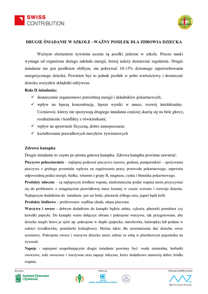 DRUGIE ŚNIADANIE W SZKOLE –WAŻNY POSIŁEK DLA ZDROWIA DZIECKA Ważnym elementem żywienia ucznia są posiłki jedzone w szkole. Proces nauki wymaga od organizmu dużego nakładu energii, której należy dostarczać regularnie. Drugie śniadanie nie jest posiłkiem obfitym, ma pokrywać 10-15% dziennego zapotrzebowania energetycznego dziecka. Powinien być to jednak posiłek w pełni wartościowy i dostarczać dziecku wszystkie składniki odżywcze. Rola II śniadania: dostarczenie organizmowi potrzebnej energii i składników pokarmowych; wpływ na lepszą koncentrację, lepsze wyniki w nauce, rozwój intelektualny. Uczniowie, którzy nie spożywają drugiego śniadania częściej skarżą się na bóle głowy, rozdrażnienie i konflikty z rówieśnikami; wpływ na sprawność fizyczną, dobre samopoczucie; kształtowanie prawidłowych nawyków żywieniowych Zdrowa kanapka Drugie śniadanie to często po prostu gotowa kanapka. Zdrowa kanapka powinna zawierać: Pieczywo pełnoziarniste – najlepiej podawać pieczywo razowe, graham, pumpernikiel – spożywanie pieczywa z grubego przemiału wpływa na regulowanie pracy przewodu pokarmowego, zapewnia odpowiednią podaż energii, białka, witamin z grupy B, magnezu, cynku i błonnika pokarmowego. Produkty mleczne – są najlepszym źródłem wapnia, niedostateczna podaż wapnia może przyczyniać się do problemów z osiągnięciem prawidłowej masy kostnej w czasie wzrostu i rozwoju dziecka. Najlepszym dodatkiem do śniadania jest ser biały, plasterek żółtego sera, jogurt bądź kefir. Produkty białkowe – preferowane: wędlina chuda, mięsa pieczone. Warzywa i owoce - dobrym dodatkiem do kanapki będzie sałata, cykoria, plasterki pomidora czy kawałki papryki. Do kanapki warto dołączyć obrane i pokrojone warzywa, tak przygotowane, aby dziecko mogło łatwo je zjeść np. pokrojone w słupki (papryka, marchewka, kalarepka) lub podane w całości (rzodkiewka, pomidorki koktajlowe). Można także dla urozmaicenia dać dziecku owoc sezonowy. Pokrojone owoce i warzywa dziecko może zabrać ze sobą w plastikowym pojemniku na żywność. Napoje - napojami uzupełniającymi drugie śniadanie powinny być: woda mineralna, herbatki owocowe, soki owocowe i warzywne oraz napoje mleczne, które dodatkowo stanowią dobre źródło wapnia. Drugie śniadanie zamiast chipsów Zjedzenie przez ucznia pełnowartościowego drugiego śniadania może w dużym stopniu ograniczyć sięganie po niekorzystne dla zdrowia przekąski takie jak: chipsy, batoniki, żelki, cukierki, słodkie bułki czy słone paluszki. Dzieci preferują słodycze oraz słone przekąski nie zawsze zdając sobie sprawę ze skutków nadmiernego spożycia tych produktów. Produkty te jedynie tłumią uczucie głodu nie dostarczając organizmowi odpowiedniej ilości składników odżywczych. To samo dotyczy słodkich napojów, których picie wypiera spożycie korzystnych dla zdrowia soków czy napojów mlecznych (mleko, kefiry, jogurty). Słodkie napoje mają ponadto duże ilości kalorii i niską wartość odżywczą. Posiłek dla całej rodziny! Bez czynnego udziału rodziców dziecko nie nauczy się jak racjonalnie przygotować drugie śniadanie. Dzieci uczą się przez naśladownictwo. Jeśli rodzice nie jedzą rano śniadania, w pospiechu wybiegają z domu do codziennych obowiązków, trudno będzie przekonać dziecko aby spożywało ten posiłek. Dobrym pomysłem jest uczenie dziecka przygotowywania drugiego śniadania od pierwszych dni nauki w szkole. Dzieci młodsze mogą razem z rodzicami przygotowywać kanapkę lub uczestniczyć w zakupach podczas których ustalamy z dzieckiem co chciałoby zabrać do szkoły na drugie śniadanie. W przypadku starszych dzieci możemy umówić się, że każdy członek rodziny raz w tygodniu przygotuje drugie śniadanie dla wszystkich. Ważne jest abyśmy pamiętali, że zdrowe drugie śniadanie nie wymaga dużych nakładów finansowych ani organizacyjnych. Dobre nawyki żywieniowe zaprocentują w przyszłości i przygotowanie śniadania nie będzie problemem. Urozmaicajmy! Nawet najlepsze kanapki mogą się znudzić. Kanapkę możemy zastąpić inną pełnowartościową potrawą np. ciastem warzywnym, sałatką z kaszy jaglanej czy gryczanej. Warto potrawę przygotować razem z dzieckiem co dodatkowo sprawi, że nasza pociecha z chęcią zje drugie śniadanie w szkole. Sałatkę lub surówkę najlepiej zapakować w plastykowy pojemnik (nie zapomnijmy o łyżeczce). Powodzenia!