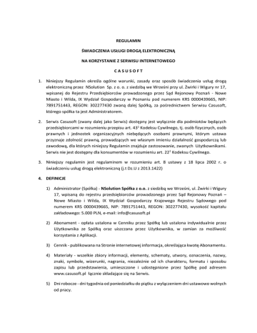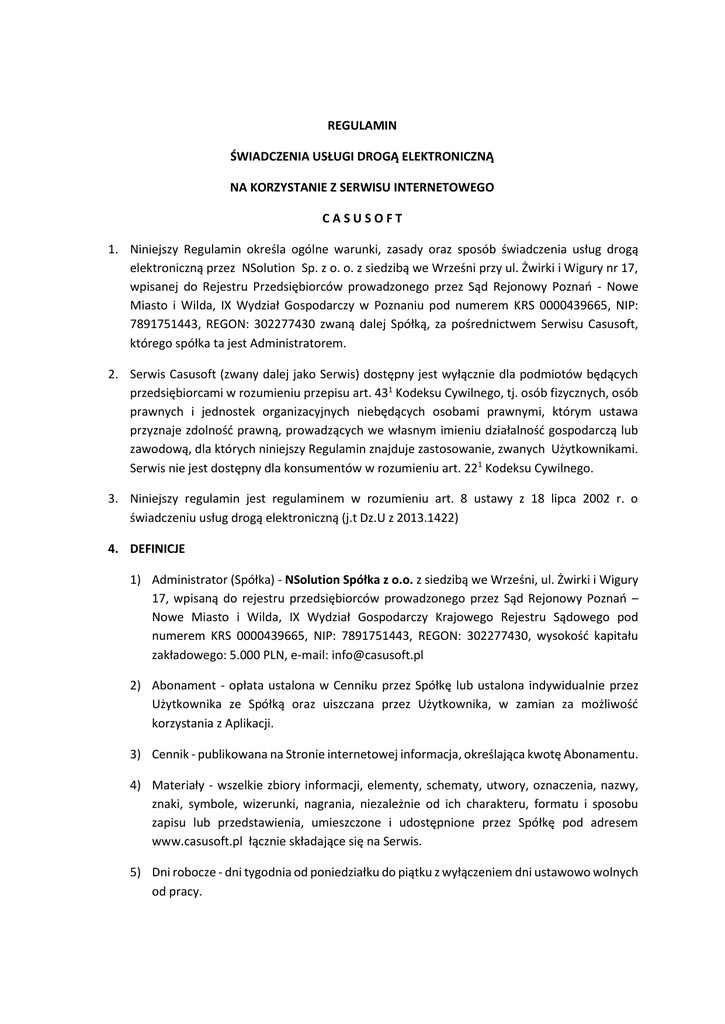 REGULAMIN ŚWIADCZENIA USŁUGI DROGĄ ELEKTRONICZNĄ NA KORZYSTANIE Z SERWISU INTERNETOWEGO CASUSOFT 1. Niniejszy Regulamin określa ogólne warunki, zasady oraz sposób świadczenia usług drogą elektroniczną przez NSolution Sp. z o. o. z siedzibą we Wrześni przy ul. Żwirki i Wigury nr 17, wpisanej do Rejestru Przedsiębiorców prowadzonego przez Sąd Rejonowy Poznań - Nowe Miasto i Wilda, IX Wydział Gospodarczy w Poznaniu pod numerem KRS 0000439665, NIP: 7891751443, REGON: 302277430 zwaną dalej Spółką, za pośrednictwem Serwisu Casusoft, którego spółka ta jest Administratorem. 2. Serwis Casusoft (zwany dalej jako Serwis) dostępny jest wyłącznie dla podmiotów będących przedsiębiorcami w rozumieniu przepisu art. 431 Kodeksu Cywilnego, tj. osób fizycznych, osób prawnych i jednostek organizacyjnych niebędących osobami prawnymi, którym ustawa przyznaje zdolność prawną, prowadzących we własnym imieniu działalność gospodarczą lub zawodową, dla których niniejszy Regulamin znajduje zastosowanie, zwanych Użytkownikami. Serwis nie jest dostępny dla konsumentów w rozumieniu art. 221 Kodeksu Cywilnego. 3. Niniejszy regulamin jest regulaminem w rozumieniu art. 8 ustawy z 18 lipca 2002 r. o świadczeniu usług drogą elektroniczną (j.t Dz.U z 2013.1422) 4. DEFINICJE 1) Administrator (Spółka) - NSolution Spółka z o.o. z siedzibą we Wrześni, ul. Żwirki i Wigury 17, wpisaną do rejestru przedsiębiorców prowadzonego przez Sąd Rejonowy Poznań – Nowe Miasto i Wilda, IX Wydział Gospodarczy Krajowego Rejestru Sądowego pod numerem KRS 0000439665, NIP: 7891751443, REGON: 302277430, wysokość kapitału zakładowego: 5.000 PLN, e-mail: [email protected] 2) Abonament - opłata ustalona w Cenniku przez Spółkę lub ustalona indywidualnie przez Użytkownika ze Spółką oraz uiszczana przez Użytkownika, w zamian za możliwość korzystania z Aplikacji. 3) Cennik - publikowana na Stronie internetowej informacja, określająca kwotę Abonamentu. 4) Materiały - wszelkie zbiory informacji, elementy, schematy, utwory, oznaczenia, nazwy, znaki, symbole, wizerunki, nagrania, niezależnie od ich charakteru, formatu i sposobu zapisu lub przedstawienia, umieszczone i udostępnione przez Spółkę pod adresem www.casusoft.pl łącznie składające się na Serwis. 5) Dni robocze - dni tygodnia od poniedziałku do piątku z wyłączeniem dni ustawowo wolnych od pracy. 6) Hasło - ciąg znaków spełniających warunki określone przez Spółkę, wybranych przez Użytkownika po dokonaniu Rejestracji, a przed pierwszym logowaniem do Serwisu, w celu zabezpieczenia dostępu do Serwisu. 7) Login - adres poczty elektronicznej Użytkownika, którym Użytkownik posługuje się w celu korzystania z Serwisu. 8) Okres Rozliczeniowy - okres korzystania z Serwisu, za który pobierany jest Abonament i wystawiana faktura VAT. 9) Serwis - Serwis internetowy wspierający pracę Użytkownika w ramach prowadzonej przez niego działalności. Serwis dostępny jest zarówno w wersji przez przeglądarkę internetową, jak również poprzez dedykowaną aplikację na platformy mobilne Android oraz iOS. 10) Regulamin - niniejszy regulamin, określający m.in. warunki i zasady korzystania z Serwisu, rejestracji, świadczenia usług drogą elektroniczną przez Spółkę oraz procedury reklamacyjnej, stanowiący regulamin w rozumieniu art. 8 ustawy z 18 lipca 2002 r. o świadczeniu usług drogą elektroniczną. 11) Usługi - aplikacje i narzędzia udostępnione drogą elektroniczną przez Spółkę pośrednictwem Serwisu, na zasadach określonych w Regulaminie. za 12) Użytkownik - Podmiot będący przedsiębiorcą w rozumieniu art. 431 Kodeksu Cywilnego, który dokonał Rejestracji Serwisu zgodnie z Regulaminem, zawarł Umowę ze Spółką i zobowiązany jest do opłacania Abonamentu. 13) Zablokowanie dostępu do Serwisu - stan, w którym Użytkownik nie może, z przyczyn określonych w Regulaminie, korzystać z Serwisu. 14) Stanowiska - dostęp dla takiej liczby użytkowników Serwisu, która została wskazana przez Użytkownika. 15) Strona internetowa - strona internetowa www.casusoft.pl Serwisu znajdująca się pod adresem: 16) Wersja Demonstracyjna – bezpłatna wersja serwisu umożliwiająca Użytkownikowi zapoznanie się z funkcjonalnościami Serwisu 5. POSTANOWIENIA OGÓLNE 1) Wszelkie prawa do Serwisu, w tym majątkowe prawa autorskie, prawa własności intelektualnej do jego nazwy, domeny internetowej i materiałów, należą do Spółki, a korzystanie z nich może następować wyłącznie w sposób określony i zgodny z Regulaminem. 2) Serwis jest udostępniany przez Spółkę za pośrednictwem sieci Internet i pod adresem app.casusoft.pl jako zasób systemu teleinformatycznego oraz informatycznego. 3) Użytkownik nie jest uprawniony do publicznego udostępniania lub rozpowszechniania w jakiejkolwiek formie i w jakikolwiek sposób lub zezwalania jakimkolwiek osobom trzecim na publiczne udostępnianie lub rozpowszechnianie Materiałów, w tym w szczególności przez publiczne udostępnianie w taki sposób, aby każdy mógł mieć do nich dostęp w miejscu i czasie przez siebie wybranym, zarówno odpłatnie, jak i nieodpłatnie. 4) Opłacanie Abonamentu przez Użytkownika nie jest równoznaczne z nabyciem przez Użytkownika jakichkolwiek praw na dobrach niematerialnych, w tym w szczególności autorskich praw majątkowych, do Materiałów i treści zamieszczonych w Serwisie. 6. KORZYSTANIE Z SERWISU 1) Korzystanie z Serwisu oznacza każdą czynność, która prowadzi do zapoznania się lub skorzystania przez Użytkownika z Materiałów w Serwisie. 2) Korzystanie z Serwisu odbywać może się wyłącznie na zasadach i w zakresie wskazanym w niniejszym Regulaminie. 3) Spółka dołoży starań, aby korzystanie z Serwisu było możliwe dla Użytkowników z użyciem wszystkich popularnych przeglądarek internetowych. 4) Minimalne wymagania techniczne umożliwiające korzystanie z Serwisu, z z