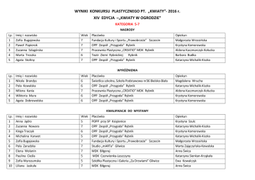 WYNIKI KONKURSU PLASTYCZNEGO PT. „KWIATY”- 2016 r. XIV EDYCJA –„KWIATY W OGRODZIE” KATEGORIA 5-7 NAGRODY Lp. 1 2 3 4 5 Imię i nazwisko Zofia Bugajewska Paweł Papierok Zuzanna Szlagórska Marta Troszka Agata Stoltny Wiek 7 7 7 6 7 Placówka Fundacja Kultury i Sportu „Prawobrzeże” Szczecin OPP Zespół „Przygoda” Rybnik Pracownia Plastyczna „CREATIO” MDK Rybnik Teatr Ziemi Rybnickiej Rybnik OPP Zespół „Przygoda” Rybnik Opiekun Małgorzata Wrzosińska Krystyna Komorowska Aldona Kaczmarczyk-Kołucka Barbara Budka Katarzyna Michalik-Kiszka WYRÓŻNIENIA Lp. 1 2 3 4 5 Imię i nazwisko Nikola Brandys Pola Kowalska Milena Kania Wiktoria Mura Agata Dobrowolska Wiek 6 6 7 6 6 Placówka Świetlica szkolna, Szkoła Podstawowa nr36 Bielsko-Biała OPP Zespół „Przygoda” Rybnik Pracownia Plastyczna „CREATIO” MDK Rybnik OPP Zespół „Przygoda” Rybnik OPP Zespół „Przygoda” Rybnik Opiekun Magdalena Wrucha Katarzyna Michalik-Kiszka Aldona Kaczmarczyk-Kołucka Krystyna Komorowska Krystyna Komorowska KWALIFIKACJE DO WYSTAWY Lp. 1 2 3 4 5 6 7 8 9 10 Imię i nazwisko Anna Jądro Zuzanna Nowara Kinga Traczyk Michalina Karwot Zofia Bugajewska Pola Zarudzka Elena Wolanin Paulina Cieśla Zofia Wyrozumska Liliana Jaskuła Wiek 5 7 6 5 7 7 7 5 5 7 Placówka POPP przy SP Książenice OPP Zespół „Przygoda” Rybnik OPP Zespół „Przygoda” Rybnik OPP Zespół „Przygoda” Rybnik Fundacja Kultury i Sportu „Prawobrzeże” Szczecin Studio „mARTa” Gliwice MDK Biłgoraj MDK Czerwionka-Leszczyny Szkółka Plastyczna i Galeria „Za Drzwiami” Gliwice MDK Biłgoraj Opiekun Krystyna Szulc Katarzyna Michalik-Kiszka Krystyna Komorowska Katarzyna Michalik-Kiszka Małgorzata Wrzosińska Marta Zajączyńska-Kowalska Anna Świca Katarzyna Sienkan-Krząkała Ewa Kowalczyk Anna Świca KATEGORIA 8-10 NAGRODY Lp. 1 2 3 4 5 6 Imię i nazwisko Natalia Kowalczyk Maja Maksimowska Emilia Piecha Antonina Otto Nina Polnik Antonina Zimończyk Wiek 7 8 9 9 10 10 Placówka Szkółka Plastyczna i Galeria „Za Drzwiami” Gliwice Studio „mARTa” Gliwice OPP Zespół „Przygoda” Rybnik OPP Zespół „Przygoda” Rybnik OPP Zespół „Przygoda” Rybnik OPP Zespół „Przygoda” Rybnik Opiekun Ewa Kowalczyk Marta Zajączyńska-Kowalska Katarzyna Michalik-Kiszka Krystyna Komorowska Katarzyna Michalik-Kiszka Katarzyna Michalik-Kiszka WYRÓŻNIENIA Lp. 1 2 3 4 5 6 Imię i nazwisko Milena Widerska Magdalena Rugor Marta Piszczek Julia Kuzemczak Patrycja Słowik Blanka Dubak Wiek 10 9 8 9 8 8 Placówka Ostrzeszowskie Centrum Kultury Ostrzeszów Pracownia Plastyczna „CREATIO” MDK Rybnik OPP Zespół „Przygoda” Rybnik Pracownia Plastyczna „CREATIO” MDK Rybnik MOK Czerwionka-Leszczyny Fundacja Kultury i Sportu „Prawobrzeże” Szczecin Opiekun Elżbieta Lubińska Aldona Kaczmarczyk-Kołucka Katarzyna Michalik-Kiszka Aldona Kaczmarczyk-Kołucka Katarzyna Sienkan-Krząkała Małgorzata Wrzosińska KWALIFIKACJE DO WYSTAWY Lp. 1 2 3 4 5 6 7 8 9 10 11 Imię i nazwisko Izabela Pogorzelec Amelia Figura Alicja Iwanowska Sonia Siedlecka Dominik Makoś Zuzanna Rynkiewicz Alicja Skowrońska Maja Ogińska Hanna Kulpa Milena Iwańczyk Nikola Ożóg Wiek 8 8 10 9 10 8 10 9 8 8 8 Placówka Fundacja Kultury i Sportu „Prawobrzeże” Szczecin OPP Zespół „Przygoda” Rybnik MDK im. Króla Maciusia Pierwszego Płock Ostrzeszowskie Centrum Kultury Ostrzeszów POPP przy ZSP im.Z.Biernackiego OPP Zespół „Przygoda” Rybnik POPP przy SP Książenice MDK im. Króla Maciusia Pierwszego Płock ZSP nr 11, SP im. M.Basisty Rybnik MDK Biłgoraj OPP Zespół „Przygoda” Rybnik Opiekun Małgorzata Wrzosińska Katarzyna Michalik-Kiszka Małgorzata Ćwikińska Elżbieta Lubińska Marek Granieczny Katarzyna Michalik-Kiszka Krystyna Szulc Małgorzata Ćwiklińska Katarzyna Michalik-Kiszka Anna Świca Katarzyna Michalik-Kiszka 12 13 Rozalia Kula Justyna Ładziak 9 8 OPP Zespół „Przygoda” Rybnik MOK Czerwionka-Leszczyny Krystyna Komorowska Katarzyna Sienkan-Krząkała KATEGORIA 11-13 NAGRODY Lp. 1 2 3 4 Imię i nazwisko Ala Borowy Małgorzata Padoł Martyna Szymiczek Iga Siatka Wiek 13 11 12 12 Placówka Szkółka Plastyczna i Galeria „Za Drzwiami” Gliwice Pracownia Plastyczna „GiR-a” MDK Rybnik POPP przy ZSP im.Z.Biernackiego OPP Zespół „Przygoda” Rybnik Opiekun Ewa Kowalczyk Milada Więckowska Marek Granieczny Katarzyna Michalik-Kiszka WYRÓŻNIENIA Lp. 1 2 3 4 5 Imię i nazwisko Mateusz Pawela Anna Dorobis Karolina Materna Amelia Skiba Małgorzata Brząkała Wiek 13 12 12 11 12 Placówka Pracownia Plastyczna „GiR-a” MDK Rybnik Pracownia Plastyczna „CREATIO” MDK Rybnik OPP Zespół „Przygoda” Rybnik Ostrzeszowskie Centrum Kultury Ostrzeszów Ostrzeszowskie Centrum Kultury Ostrzeszów Opiekun Milada Więckowska Aldona Kaczmarczyk-Kołucka Katarzyna Michalik-Kiszka Elżbieta Lubińska Elżbieta Lubińska KWALIFIKACJE DO WYSTAWY Lp. 1 2 3 4 5 6 7 8 9 Imię i nazwisko Martyna Kniaziowska Konstancja Nawrocka Marta Skowron Anna Pędziwiatr Michał Przygoda Maja Król Klaudia Konik Sylwia Kubica Kinga Gałązka Wiek 11 11 12 13 11 11 13 11 13 Placówka MDK Biłgoraj ZSP nr 10 Rybnik OPP Zespół „Przygoda” Rybnik MDK Biłgoraj Pracownia Plastyczna „GiR-a” MDK Rybnik Fundacja Kultury i Sportu „Prawobrzeże” Szczecin POPP przy SP Książenice OPP nr 1 Wodzisław Śląski Szkółka Plastyczna i Galeria „Za Drzwiami” Gliwice Opiekun Anna Świca Jolanta Pastuszka Katarzyna Michalik-Kiszka Anna Świca Milada Więckowska Małgorzata Wrzosińska Krystyna Szulc Natalia Sternik-Poparda Ewa Kowalczyk KATEGORIA 14-16 NAGRODY Lp. Imię i nazwisko 1 Julia Kudełka 2 Wiktoria Antoniewicz Wiek 15 14 Placówka MDK Biłgoraj Ostrzeszowskie Centrum Kultury Ostrzeszów Opiekun Anna Świca Elżbieta Lubińska WYRÓŻNIENIA Lp. 1 2 3 Imię i nazwisko Weronika Wróbel Barbara Bugdol Julia Szreder Wiek 16 16 16 Placówka Ostrzeszowskie Centrum Kultury Ostrzeszów OPP Zesp