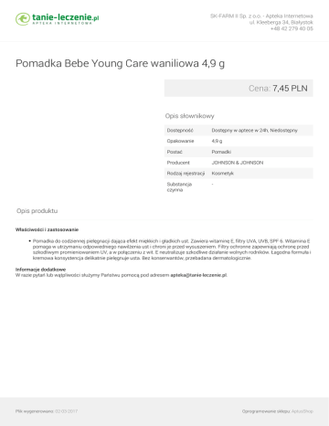 SK-FARM II Sp. z o.o. - Apteka Internetowa ul. Kleeberga 34, Białystok +48 42 279 40 05 Pomadka Bebe Young Care waniliowa 4,9 g Cena: 7,45 PLN Opis słownikowy Dostępność Dostępny w aptece w 24h, Niedostępny Opakowanie 4,9 g Postać Pomadki Producent JOHNSON & JOHNSON Rodzaj rejestracji Kosmetyk Substancja czynna - Opis produktu Właściwości i zastosowanie Pomadka do codziennej pielęgnacji dająca efekt miękkich i gładkich ust. Zawiera witaminę E, filtry UVA, UVB, SPF 6. Witamina E pomaga w utrzymaniu odpowiedniego nawilżenia ust i chroni je przed wysuszeniem. Filtry ochronne zapewniają ochronę przed szkodliwym promieniowaniem UV, a w połączeniu z wit. E neutralizuje szkodliwe działanie wolnych rodników. Łagodna formuła i kremowa konsystencja delikatnie pielęgnuje usta. Bez konserwantów, przebadana dermatologicznie. Informacje dodatkowe W razie pytań lub wątpliwości służymy Państwu pomocą pod adresem [email protected]. Plik wygenerowano: 02-03-2017 Powered by TCPDF (www.tcpdf.org) Oprogramowanie sklepu: AptusShop