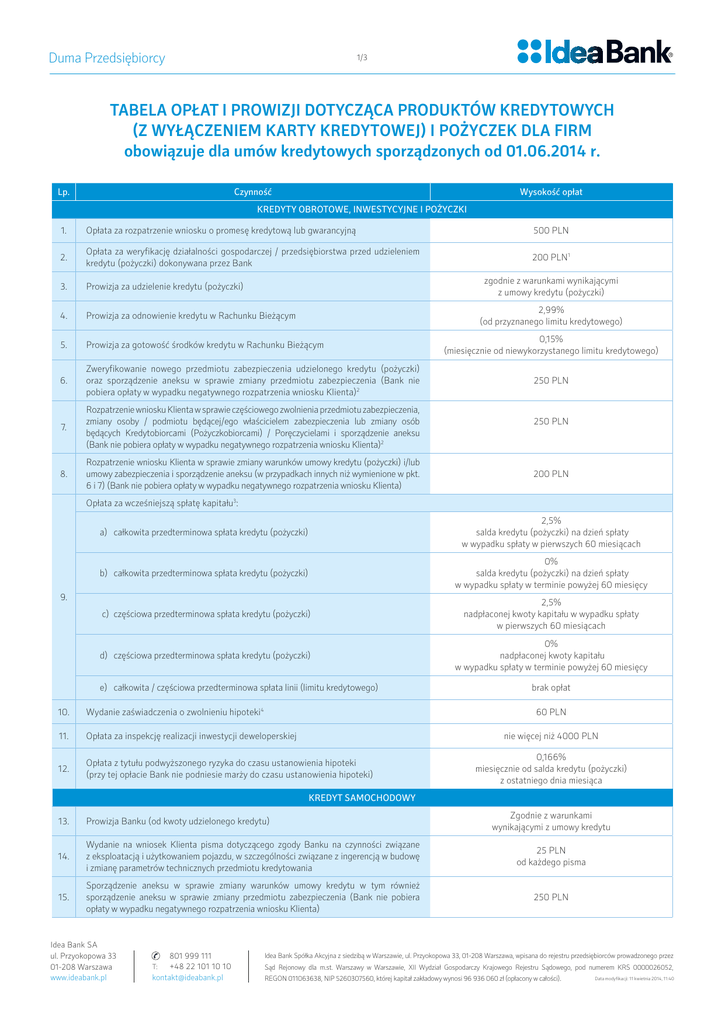 Duma Przedsiębiorcy 1/3 TABELA OPŁAT I PROWIZJI dOTycZącA PROdukTóW kREdyTOWych (Z WyŁącZEnIEm kARTy kREdyTOWEJ) I POŻycZEk dLA FIRm obowiązuje dla umów kredytowych sporządzonych od 01.06.2014 r. Lp. Czynność Wysokość opłat KREDYTY OBROTOWE, INWESTYCYJNE I POŻYCZKI 1. Opłata za rozpatrzenie wniosku o promesę kredytową lub gwarancyjną 500 PLN 2. Opłata za weryfikację działalności gospodarczej / przedsiębiorstwa przed udzieleniem kredytu (pożyczki) dokonywana przez Bank 200 PLN1 3. Prowizja za udzielenie kredytu (pożyczki) 4. Prowizja za odnowienie kredytu w Rachunku Bieżącym 5. Prowizja za gotowość środków kredytu w Rachunku Bieżącym 6. Zweryfikowanie nowego przedmiotu zabezpieczenia udzielonego kredytu (pożyczki) oraz sporządzenie aneksu w sprawie zmiany przedmiotu zabezpieczenia (Bank nie pobiera opłaty w wypadku negatywnego rozpatrzenia wniosku Klienta)2 7. Rozpatrzenie wniosku Klienta w sprawie częściowego zwolnienia przedmiotu zabezpieczenia, zmiany osoby / podmiotu będącej/ego właścicielem zabezpieczenia lub zmiany osób będących Kredytobiorcami (Pożyczkobiorcami) / Poręczycielami i sporządzenie aneksu (Bank nie pobiera opłaty w wypadku negatywnego rozpatrzenia wniosku Klienta)2 8. Rozpatrzenie wniosku Klienta w sprawie zmiany warunków umowy kredytu (pożyczki) i/lub umowy zabezpieczenia i sporządzenie aneksu (w przypadkach innych niż wymienione w pkt. 6 i 7) (Bank nie pobiera opłaty w wypadku negatywnego rozpatrzenia wniosku Klienta) zgodnie z warunkami wynikającymi z umowy kredytu (pożyczki) 2,99% (od przyznanego limitu kredytowego) 0,15% (miesięcznie od niewykorzystanego limitu kredytowego) 250 PLN 250 PLN 200 PLN Opłata za wcześniejszą spłatę kapitału3: a) całkowita przedterminowa spłata kredytu (pożyczki) 2,5% salda kredytu (pożyczki) na dzień spłaty w wypadku spłaty w pierwszych 60 miesiącach b) całkowita przedterminowa spłata kredytu (pożyczki) 0% salda kredytu (pożyczki) na dzień spłaty w wypadku spłaty w terminie powyżej 60 miesięcy c) częściowa przedterminowa spłata kredytu (pożyczki) 2,5% nadpłaconej kwoty kapitału w wypadku spłaty w pierwszych 60 miesiącach d) częściowa przedterminowa spłata kredytu (pożyczki) 0% nadpłaconej kwoty kapitału w wypadku spłaty w terminie powyżej 60 miesięcy 9. e) całkowita / częściowa przedterminowa spłata linii (limitu kredytowego) 10. Wydanie zaświadczenia o zwolnieniu hipoteki4 11. Opłata za inspekcję realizacji inwestycji deweloperskiej 12. Opłata z tytułu podwyższonego ryzyka do czasu ustanowienia hipoteki (przy tej opłacie Bank nie podniesie marży do czasu ustanowienia hipoteki) brak opłat 60 PLN nie więcej niż 4000 PLN 0,166% miesięcznie od salda kredytu (pożyczki) z ostatniego dnia miesiąca KREDYT SAMOCHODOWY Zgodnie z warunkami wynikającymi z umowy kredytu 13. Prowizja Banku (od kwoty udzielonego kredytu) 14. Wydanie na wniosek Klienta pisma dotyczącego zgody Banku na czynności związane z eksploatacją i użytkowaniem pojazdu, w szczególności związane z ingerencją w budowę i zmianę parametrów technicznych przedmiotu kredytowania 25 PLN od każdego pisma 15. Sporządzenie aneksu w sprawie zmiany warunków umowy kredytu w tym również sporządzenie aneksu w sprawie zmiany przedmiotu zabezpieczenia (Bank nie pobiera opłaty w wypadku negatywnego rozpatrzenia wniosku Klienta) 250 PLN Idea Bank SA ul. Przyokopowa 33 01-208 Warszawa www.ideabank.pl 801 999 111 +48 22 101 10 10 [email protected] T: Idea Bank Spółka Akcyjna z siedzibą w Warszawie, ul. Przyokopowa 33, 01-208 Warszawa, wpisana do rejestru przedsiębiorców prowadzonego przez Sąd Rejonowy dla m.st. Warszawy w Warszawie, XII Wydział Gospodarczy Krajowego Rejestru Sądowego, pod numerem KRS 0000026052, REGON 011063638, NIP 5260307560, której kapitał zakładowy wynosi 96 936 060 zł (opłacony w całości). Data modyfikacji: 11 kwietnia 2014, 11:40 Duma Przedsiębiorcy 2/3 Opłata za wcześniejszą spłatę kapitału: 3% w wypadku spłaty w pierwszych 12 miesiącach a) całkowita przedterminowa spłata kredytu przed upływem 36 miesięcy od dnia zawarcia Umowy o kredyt (liczone od salda kredytu) 2% w wypadku spłaty w terminie powyżej 12 miesięcy do 24 miesięcy 1% w wypadku spłaty w terminie powyżej 24 miesięcy 16. 3% w wypadku spłaty w pierwszych 12 miesiącach b) częściowa przedterminowa spłata kredytu przed upływem 36 miesięcy od dnia zawarcia umowy o kredyt (liczone od kwoty nadpłaconej) 2% w wypadku spłaty w terminie powyżej 12 miesięcy do 24 miesięcy 1% w wypadku spłaty w terminie powyżej 24 miesięcy 17. Prolongata spłaty (okres dłuższy niż 1 miesiąc) 1% kwoty pozostałej do spłaty, nie mniej niż 200 PLN Opłaty wspólne DLA WSZYSTKICH KREDYTÓW i POŻYCZEK: 18. Sporządzenie opinii o kredycie (pożyczce) na wniosek Klienta 100 PLN 19. Wystawienie zaświadczenia na wniosek Klienta 70 PLN 20. Sporządzenie kopii dokumentów na wniosek Klienta 40 PLN 21. Ponowne sporządzenie harmonogramu spłaty kredytu (pożyczki) na wniosek Klienta 40 PLN 22. Sporządzenie historii spłaty kredytu (pożyczki) 40 PLN za bieżący rok, 80 PLN za każdy poprzedni rok, ale nie więcej niż 500 PLN 23. Wydanie zaświadczenia o zwolnieniu zastawu4 60 PLN 24. Sporządzenie uwierzytelnionych kopii lub odpisów dokumentów na wniosek Klienta 40 PLN 25. Opłata za kolejne wezwanie do spełnienia warunków wymaganych zgodnie z umową o kredyt (pożyczkę) 30 PLN 26. Opłata za kolejne wezwanie do dostarczenia dokumentów dotyczących sytuacji finansowo-ekonomicznej 30 PLN opłaty za Czynności restrukturyzacyjne, MONITORUJĄCE i windykacyjne5: 27. Wezwanie do zapłaty6, 7 28. Sporządzenie umowy o ugodę, porozumienia spłaty zadłużenia 1,5% wartości należności 29. Sporządzenie aneksu do umowy ugody 1,5% wartości należności 30. Opłata za wizytę terenową6, 7 31. Opłata za ustalenie adresu dłużnika 115,29 PLN 32. Opłata za wnios