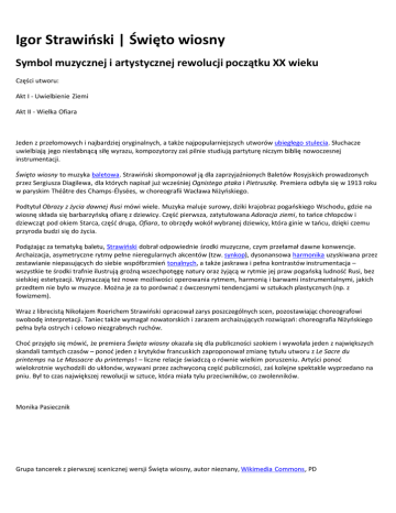 Igor Strawiński | Święto wiosny Symbol muzycznej i artystycznej rewolucji początku XX wieku Części utworu: Akt I - Uwielbienie Ziemi Akt II - Wielka Ofiara Jeden z przełomowych i najbardziej oryginalnych, a także najpopularniejszych utworów ubiegłego stulecia. Słuchacze uwielbiają jego niesłabnącą siłę wyrazu, kompozytorzy zaś pilnie studiują partyturę niczym biblię nowoczesnej instrumentacji. Święto wiosny to muzyka baletowa. Strawiński skomponował ją dla zaprzyjaźnionych Baletów Rosyjskich prowadzonych przez Sergiusza Diagilewa, dla których napisał już wcześniej Ognistego ptaka i Pietruszkę. Premiera odbyła się w 1913 roku w paryskim Théâtre des Champs-Élysées, w choreografii Wacława Niżyńskiego. Podtytuł Obrazy z życia dawnej Rusi mówi wiele. Muzyka maluje surowy, dziki krajobraz pogańskiego Wschodu, gdzie na wiosnę składa się barbarzyńską ofiarę z dziewicy. Część pierwsza, zatytułowana Adoracja ziemi, to tańce chłopców i dziewcząt pod okiem Starca, część druga, Ofiara, to obrzędy wokół wybranej dziewicy, która ginie w tańcu, dzięki czemu przyroda budzi się do życia. Podążając za tematyką baletu, Strawiński dobrał odpowiednie środki muzyczne, czym przełamał dawne konwencje. Archaizacja, asymetryczne rytmy pełne nieregularnych akcentów (tzw. synkop), dysonansowa harmonika uzyskiwana przez zestawianie niepasujących do siebie współbrzmień tonalnych, a także jaskrawa i pełna kontrastów instrumentacja – wszystkie te środki trafnie ilustrują groźną wszechpotęgę natury oraz żyjącą w rytmie jej praw pogańską ludność Rusi, bez sielskiej estetyzacji. Wyznaczają też nowe możliwości operowania rytmem, harmonią i barwami instrumentalnymi, jakich przedtem nie było w muzyce. Można je za to porównać z ówczesnymi tendencjami w sztukach plastycznych (np. z fowizmem). Wraz z librecistą Nikołajem Roerichem Strawiński opracował zarys poszczególnych scen, pozostawiając choreografowi swobodę interpretacji. Taniec także wymagał nowatorskich i zarazem archaizujących rozwiązań: choreografia Niżyńskiego pełna była ostrych i celowo niezgrabnych ruchów. Choć przyjęło się mówić, że premiera Święta wiosny okazała się dla publiczności szokiem i wywołała jeden z największych skandali tamtych czasów – ponoć jeden z krytyków francuskich zaproponował zmianę tytułu utworu z Le Sacre du printemps na Le Massacre du printemps! – liczne relacje świadczą o równie wielkim poruszeniu. Artyści ponoć wielokrotnie wychodzili do ukłonów, wzywani przez zachwyconą część publiczności, zaś kolejne spektakle wyprzedano na pniu. Był to czas największej rewolucji w sztuce, która miała tylu przeciwników, co zwolenników. Monika Pasiecznik Grupa tancerek z pierwszej scenicznej wersji Święta wiosny, autor nieznany, Wikimedia Commons, PD