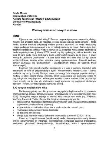 Emilia Musiał [email protected] Katedra Technologii i Mediów Edukacyjnych Uniwersytet Pedagogiczny Kraków Wielowymiarowość nowych mediów Wstęp Żyjemy w rzeczywistości, którą Z. Bauman nazywa płynną nowoczesnością, dlatego musimy być świadomi tego, że wszystko, co nas otacza podlega ciągłej zmianie – także media. Analiza literatury dotyczącej mediów pozwala zauważyć, że media ewoluowały i ciągle podlegają temu procesowi, a to, co dzisiaj uważamy za nowe i fascynujące, jutro zacznie odchodzić do lamusa. Kiedy w połowie lat 90. ubiegłego wieku zaczęły pojawiać się media w pełni cyfrowe, tj. strony WWW, e-mail czy listy dyskusyjne, nikt nie kwestionował tego, że są to media nowe. Dziś mamy media, o których też mówimy, że są nowe – a nawet według P. Levinsona „nowe nowe” – a które ściśle wiążą się z ideą Web 2.0 (np. portale społecznościowe, serwisy wideo, wirtualne światy społecznościowe, dzienniki sieciowe, serwisy zajmujące się gromadzeniem i udostępnianiem linków do ważnych treści internetowych). Fenomen tych nowych mediów (dostępnych tu i teraz z poziomu Internetu) każe zastanowić się nad ich przydatnością w życiu i funkcjonowaniu każdego z nas – ucznia, studenta, czy osoby dorosłej. Dlatego, biorąc pod uwagę m.in. statystyki popularności tych mediów, a także własną analizę zjawiska, celem opracowania jest zwrócenie uwagi na psychologiczne, socjologiczne i edukacyjne aspekty nowych mediów, które uruchamiają nowe sposoby na to, aby ich użytkownicy mogli wymieniać się poglądami, ulubionymi zdjęciami i filmami, czy też po prostu rozmawiać z sobą. 1. O nowych mediach słów kilka Media – najogólniej rzecz biorąc – oznaczają systemy bądź narzędzia do utrwalania informacji (słowa, obrazu, dźwięku) w czasie i przekazywania jej w przestrzeni [Goban-Klas, 2005]. Szczególne miejsce zajmuje tu Internet, który oferuje nam media (np. Wikipedia, YouTube, Facebook, Twitter, Second Life, blogi) wyróżniające się tym, że: treści generują najczęściej nieprofesjonalni użytkownicy Sieci (mogą wybrać najbardziej odpowiednią dla siebie formę przekazu); konsument nie ponosi żadnych kosztów, a producent może czerpać zyski; rywalizują ze sobą i wzajemnie się dopełniają; są dostępne 24h na dobę; oferują dużą interakcję między członkami społeczności [Levinson, 2010, s. 11-15]. Zatem to, co wyróżnia nowe (współczesne) media, stanowiące nieodzowny element płynnej rzeczywistości to: integracja (konwergencja), kompresja czasowo-przestrzenna, sieciowość, globalność (deterytorializacja), decentralizacja, multi- i hipermedialność, 1 interaktywność, mobilność (miniaturyzacja) [zob. Morbitzer, 2009, s. 25; Morbitzer, 2012, s. 323]. Nowe media nie tylko umożliwiają łączenie ludzi, budowanie i podtrzymywanie relacji, dzielenie się informacjami, historiami, przemyśleniami i emocjami w oparciu o swoje indywidualne profile (Facebook, Twitter, Second Life), ale także sprzyjają bardziej osobistej komunikacji, pozwalającej na zachowanie swoich pomysłów, doświadczeń i uczuć w trwały sposób na przyszłość, takie jak blogi i mikroblogi. Mogą ponadto stanowić swego rodzaju serwisy skoncentrowane wokół jednego typu komunikatów: wideo (YouTube), encyklopedycznej informacji (Wikipedia) oraz linków i skrótów najważniejszych wiadomości (Digg). Nieodzownym warunkiem funkcjonowania nowych mediów (reprezentujących technologię Web 2.0) jest ich społecznościowy wymiar, który pozwala komunikować się na różnych poziomach z innymi ludźmi, nawet mieszkającymi na drugim końcu globu. Ich użytkownicy, dzięki zarejestrowaniu w takim serwisie mają szansę na tworzenie i wymianę pewnych treści, zwłaszcza graficznych, niemal nieustannie, czego dowodzą liczne statystyki mówiące, że: na świecie jest już ponad miliard użytkowników Facebooka [Emerging Markets…, 2013], w Polsce – prawie 9 mln (największy odsetek członków portalu ma od 18 do 24 lat, według Alexa portal ten jest na drugim miejscu pod względem popularności portali internetowych w naszym kraju) [Prawie 9 mln…, 2012]; Wikipedię odwiedza miesięcznie ponad 400 mln osób i jest ona siódmym pod względem popularności portalem internetowym świata [Top Sites, 2013], liczba artykułów polskiej Wikipedii przekroczyła w 2013 r. 970 510 haseł [Wikipedia…, 2013]; YouTube odwiedza miesięcznie ponad miliard użytkowników, każdego miesiąca użytkownicy spędzają ponad 4 miliardy godzin na oglądaniu filmów w YouTube, co minutę do YouTube trafiają 72 godziny filmów, portal ten jest dostępny w 53 krajach i 61 językach [YouTube: Statystyki, 2013], w Polsce w marcu 2013 r. było 13,4 mln użytkowników [Megapanel…, 2013]. Nowe media nie tylko zaspokajają nasze naturalne potrzeby współpracy z innymi ludźmi, wymiany doświadczeń, informacji, zainteresowań, ale także umożliwiają nam skuteczną realizację celów rozrywkowych i zawodowych, jak również w coraz większym stopniu edukacyjnych. 2. Psychologia nowych mediów – wybrane aspekty Psychologia to nauka badająca mechanizmy i prawa rządzące psychiką oraz zachowaniami człowieka [Okoń, 2004, s. 337] – jej przedmiotem zainteresowań jest więc jednostka. Ponadto jest dziedziną, która pomaga poznać i zrozumieć człowieka znajdującego się w różnych sytuacjach życiowych i na różnych etapach życia, także w kontekście Internetu stanowiącego nowy rodzaj środowiska, które może i wywiera potężny wpływ na nasze zachowania. Trudnego zadania podjęła się w swojej książce Patricia Wallace, próbując odpowiedzieć na pytanie: Czy istnieje coś takiego, jak psychologia Internetu? Traktując jako punkt wyjścia fakt, iż miliony ludzi z całego świata codziennie spotykają się w wirtualnym 2 świecie, aby porozmawiać, zdobyć potrzebne informacje, nauczyć się, zabawić si
