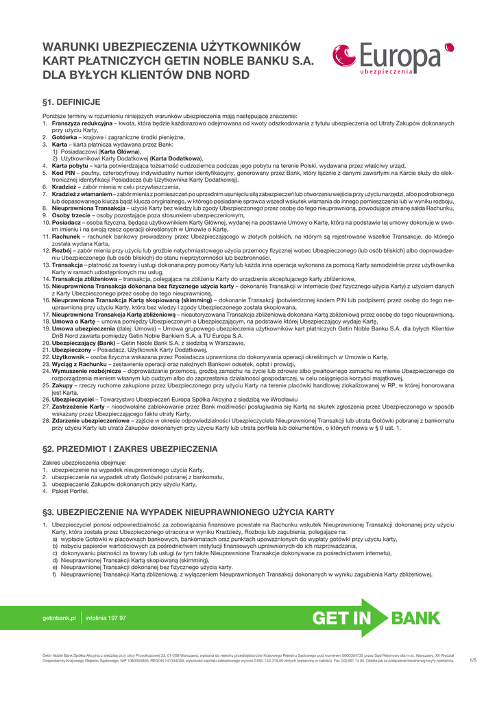 WARUNKI UBEZPIECZENIA UŻYTKOWNIKÓW KART PŁATNICZYCH GETIN NOBLE BANKU S.A. DLA BYŁYCH KLIENTÓW DnB NORD §1. DEFINICJE Poniższe terminy w rozumieniu niniejszych warunków ubezpieczenia mają następujące znaczenie: 1. Franszyza redukcyjna – kwota, która będzie każdorazowo odejmowana od kwoty odszkodowania z tytułu ubezpieczenia od Utraty Zakupów dokonanych przy użyciu Karty, 2. Gotówka – krajowe i zagraniczne środki pieniężne, 3. Karta – karta płatnicza wydawana przez Bank: 1) Posiadaczowi (Karta Główna), 2) Użytkownikowi Karty Dodatkowej (Karta Dodatkowa), 4. Karta pobytu – karta potwierdzająca tożsamość cudzoziemca podczas jego pobytu na terenie Polski, wydawana przez właściwy urząd, 5. Kod PIN – poufny, czterocyfrowy indywidualny numer identyfikacyjny, generowany przez Bank, który łącznie z danymi zawartymi na Karcie służy do elektronicznej identyfikacji Posiadacza (lub Użytkownika Karty Dodatkowej), 6. Kradzież – zabór mienia w celu przywłaszczenia, 7. Kradzież z włamaniem – zabór mienia z pomieszczeń po uprzednim usunięciu siłą zabezpieczeń lub otworzeniu wejścia przy użyciu narzędzi, albo podrobionego lub dopasowanego klucza bądź klucza oryginalnego, w którego posiadanie sprawca wszedł wskutek włamania do innego pomieszczenia lub w wyniku rozboju, 8. Nieuprawniona Transakcja – użycie Karty bez wiedzy lub zgody Ubezpieczonego przez osobę do tego nieuprawnioną, powodujące zmianę salda Rachunku, 9. Osoby trzecie – osoby pozostające poza stosunkiem ubezpieczeniowym, 10.Posiadacz – osoba fizyczna, będąca użytkownikiem Karty Głównej, wydanej na podstawie Umowy o Kartę, która na podstawie tej umowy dokonuje w swoim imieniu i na swoją rzecz operacji określonych w Umowie o Kartę, 11.Rachunek – rachunek bankowy prowadzony przez Ubezpieczającego w złotych polskich, na którym są rejestrowane wszelkie Transakcje, do którego została wydana Karta, 12.Rozbój – zabór mienia przy użyciu lub groźbie natychmiastowego użycia przemocy fizycznej wobec Ubezpieczonego (lub osób bliskich) albo doprowadzeniu Ubezpieczonego (lub osób bliskich) do stanu nieprzytomności lub bezbronności, 13.Transakcja – płatność za towary i usługi dokonana przy pomocy Karty lub każda inna operacja wykonana za pomocą Karty samodzielnie przez użytkownika Karty w ramach udostępnionych mu usług, 14.Transakcja zbliżeniowa – transakcja, polegająca na zbliżeniu Karty do urządzenia akceptującego karty zbliżeniowe, 15.Nieuprawniona Transakcja dokonana bez fizycznego użycia karty – dokonanie Transakcji w Internecie (bez fizycznego użycia Karty) z użyciem danych z Karty Ubezpieczonego przez osobę do tego nieuprawnioną, 16.Nieuprawniona Transakcja Kartą skopiowaną (skimming) – dokonanie Transakcji (potwierdzonej kodem PIN lub podpisem) przez osobę do tego nieuprawnioną przy użyciu Karty, która bez wiedzy i zgody Ubezpieczonego została skopiowana, 17.Nieuprawniona Transakcja Kartą zbliżeniową – nieautoryzowana Transakcja zbliżeniowa dokonana Kartą zbliżeniową przez osobę do tego nieuprawnioną, 18.Umowa o Kartę – umowa pomiędzy Ubezpieczonym a Ubezpieczającym, na podstawie której Ubezpieczający wydaje Kartę, 19.Umowa ubezpieczenia (dalej: Umowa) – Umowa grupowego ubezpieczenia użytkowników kart płatniczych Getin Noble Banku S.A. dla byłych Klientów DnB Nord zawarta pomiędzy Getin Noble Bankiem S.A. a TU Europa S.A. 20.Ubezpieczający (Bank) – Getin Noble Bank S.A. z siedzibą w Warszawie, 21.Ubezpieczony – Posiadacz, Użytkownik Karty Dodatkowej, 22.Użytkownik – osoba fizyczna wskazana przez Posiadacza uprawniona do dokonywania operacji określonych w Umowie o Kartę, 23.Wyciąg z Rachunku – zestawienie operacji oraz należnych Bankowi odsetek, opłat i prowizji, 24.Wymuszenie rozbójnicze – doprowadzanie przemocą, groźbą zamachu na życie lub zdrowie albo gwałtownego zamachu na mienie Ubezpieczonego do rozporządzenia mieniem własnym lub cudzym albo do zaprzestania działalności gospodarczej, w celu osiągnięcia korzyści majątkowej, 25.Zakupy – rzeczy ruchome zakupione przez Ubezpieczonego przy użyciu Karty na terenie placówki handlowej zlokalizowanej w RP, w której honorowana jest Karta, 26.Ubezpieczyciel – Towarzystwo Ubezpieczeń Europa Spółka Akcyjna z siedzibą we Wrocławiu 27.Zastrzeżenie Karty – nieodwołalne zablokowanie przez Bank możliwości posługiwania się Kartą na skutek zgłoszenia przez Ubezpieczonego w sposób wskazany przez Ubezpieczającego faktu utraty Karty, 28.Zdarzenie ubezpieczeniowe – zajście w okresie odpowiedzialności Ubezpieczyciela Nieuprawnionej Transakcji lub utrata Gotówki pobranej z bankomatu przy użyciu Karty lub utrata Zakupów dokonanych przy użyciu Karty lub utrata portfela lub dokumentów, o których mowa w § 9 ust. 1. §2. PRZEDMIOT I ZAKRES UBEZPIECZENIA Zakres ubezpieczenia obejmuje: 1. ubezpieczenie na wypadek nieuprawnionego użycia Karty, 2. ubezpieczenie na wypadek utraty Gotówki pobranej z bankomatu, 3. ubezpieczenie Zakupów dokonanych przy użyciu Karty, 4. Pakiet Portfel. §3. Ubezpieczenie na wypadek nieuprawnionego użycia Karty 1. Ubezpieczyciel ponosi odpowiedzialność za zobowiązania finansowe powstałe na Rachunku wskutek Nieuprawnionej Transakcji dokonanej przy użyciu Karty, która została przez Ubezpieczonego utracona w wyniku Kradzieży, Rozboju lub zagubienia, polegające na: a) wypłacie Gotówki w placówkach bankowych, bankomatach oraz punktach upoważnionych do wypłaty gotówki przy użyciu karty, b) nabyciu papierów wartościowych za pośrednictwem instytucji finansowych uprawnionych do ich rozprowadzania, c) dokonywaniu płatności za towary lub usługi (w tym także Nieuprawnione Transakcje dokonywane za pośrednictwem internetu), d) Nieuprawnionej Transakcji Kartą skopiowaną (skimming), e) Nieuprawnionej Transakcji dokonanej bez fizycznego użycia karty. f