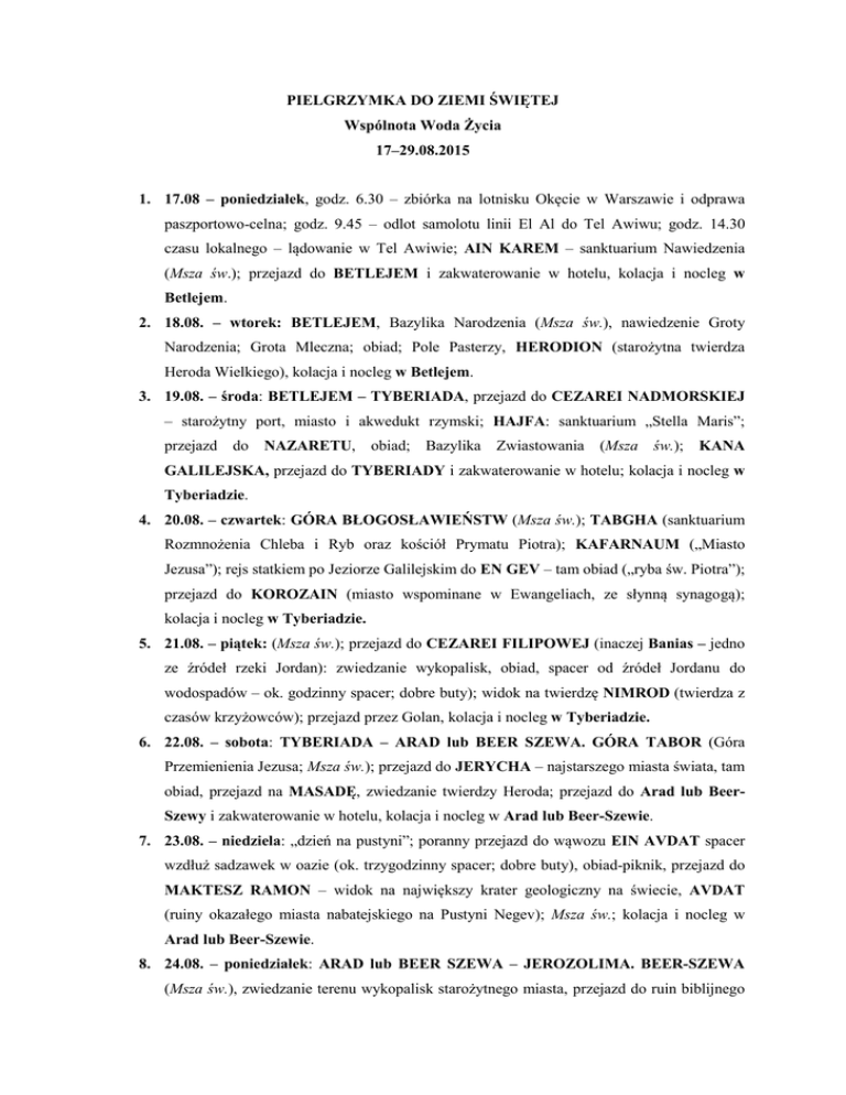 PIELGRZYMKA DO ZIEMI ŚWIĘTEJ Wspólnota Woda Życia 17–29.08.2015 1. 17.08 – poniedziałek, godz. 6.30 – zbiórka na lotnisku Okęcie w Warszawie i odprawa paszportowo-celna; godz. 9.45 – odlot samolotu linii El Al do Tel Awiwu; godz. 14.30 czasu lokalnego – lądowanie w Tel Awiwie; AIN KAREM – sanktuarium Nawiedzenia (Msza św.); przejazd do BETLEJEM i zakwaterowanie w hotelu, kolacja i nocleg w Betlejem. 2. 18.08. – wtorek: BETLEJEM, Bazylika Narodzenia (Msza św.), nawiedzenie Groty Narodzenia; Grota Mleczna; obiad; Pole Pasterzy, HERODION (starożytna twierdza Heroda Wielkiego), kolacja i nocleg w Betlejem. 3. 19.08. – środa: BETLEJEM – TYBERIADA, przejazd do CEZAREI NADMORSKIEJ – starożytny port, miasto i akwedukt rzymski; HAJFA: sanktuarium „Stella Maris”; przejazd do NAZARETU, obiad; Bazylika Zwiastowania (Msza św.); KANA GALILEJSKA, przejazd do TYBERIADY i zakwaterowanie w hotelu; kolacja i nocleg w Tyberiadzie. 4. 20.08. – czwartek: GÓRA BŁOGOSŁAWIEŃSTW (Msza św.); TABGHA (sanktuarium Rozmnożenia Chleba i Ryb oraz kościół Prymatu Piotra); KAFARNAUM („Miasto Jezusa”); rejs statkiem po Jeziorze Galilejskim do EN GEV – tam obiad („ryba św. Piotra”); przejazd do KOROZAIN (miasto wspominane w Ewangeliach, ze słynną synagogą); kolacja i nocleg w Tyberiadzie. 5. 21.08. – piątek: (Msza św.); przejazd do CEZAREI FILIPOWEJ (inaczej Banias – jedno ze źródeł rzeki Jordan): zwiedzanie wykopalisk, obiad, spacer od źródeł Jordanu do wodospadów – ok. godzinny spacer; dobre buty); widok na twierdzę NIMROD (twierdza z czasów krzyżowców); przejazd przez Golan, kolacja i nocleg w Tyberiadzie. 6. 22.08. – sobota: TYBERIADA – ARAD lub BEER SZEWA. GÓRA TABOR (Góra Przemienienia Jezusa; Msza św.); przejazd do JERYCHA – najstarszego miasta świata, tam obiad, przejazd na MASADĘ, zwiedzanie twierdzy Heroda; przejazd do Arad lub BeerSzewy i zakwaterowanie w hotelu, kolacja i nocleg w Arad lub Beer-Szewie. 7. 23.08. – niedziela: „dzień na pustyni”; poranny przejazd do wąwozu EIN AVDAT spacer wzdłuż sadzawek w oazie (ok. trzygodzinny spacer; dobre buty), obiad-piknik, przejazd do MAKTESZ RAMON – widok na największy krater geologiczny na świecie, AVDAT (ruiny okazałego miasta nabatejskiego na Pustyni Negev); Msza św.; kolacja i nocleg w Arad lub Beer-Szewie. 8. 24.08. – poniedziałek: ARAD lub BEER SZEWA – JEROZOLIMA. BEER-SZEWA (Msza św.), zwiedzanie terenu wykopalisk starożytnego miasta, przejazd do ruin biblijnego LAKHISZ, obiad-piknik; przejazd do SOREQ – niezwykłe jaskinie (stalaktyty, stalagmity); przejazd do JEROZOLIMY i zakwaterowanie w hotelu, kolacja i nocleg w Jerozolimie. 9. 25.08. – wtorek: JEROZOLIMA. Sanktuaria Góry Oliwnej: „Dominus Flevit”, Getsemani (Bazylika i Ogrójec, Msza św.); obiad; Muzeum i Miejsce Pamięci Yad Vashem Knesset i Menora – symbol Izraela, kolacja i nocleg w Jerozolimie. 10. 26.08. – środa: JEROZOLIMA. Kościół św. Anny i Sadzawka Owcza; Klasztor Biczowania (Msza św.); wspólna Droga Krzyżowa na jerozolimskiej Via Dolorosa, Lithostrotos i Bazylika Grobu Pańskiego, obiad; po obiedzie powrót do dzielnicy chrześcijańskiej i Bazyliki Grobu Pańskiego na spokojną modlitwę; kolacja i nocleg w Jerozolimie. 11. 27.08. – czwartek: JEROZOLIMA. Chrześcijański Syjon: Kościół św. Piotra o Pianiu Koguta („In Gallicantu”), Wieczernik (Msza św.), Bazylika Zaśnięcia NMP; Stare Miasto Dzielnica Żydowska („Cardo”), Ściana Płaczu; obiad; Miasto Dawida (najstarsza część Jerozolimy) i tunel Ezechiasza; kolacja i nocleg w Jerozolimie. 12. 28.08. – piątek: BETANIA (miejsce wskrzeszenia Łazarza, Msza św.); przejazd do miejsca chrztu Jezusa, a następnie do QUMRAN (zwiedzanie ruin i obiad); MORZE MARTWE – możliwość kąpieli; powrót do Jerozolimy, kolacja i nocleg w Jerozolimie. 13. 29.08. – sobota: pakowanie, kościół „Pater Noster” na Górze Oliwnej (Msza św.), czas wolny na Starym Mieście w Jerozolimie; obiad; o 15.00 – wyjazd na lotnisko Ben Guriona w TEL AWIWIE; odprawa paszportowo-celna; godz. 20.00 czasu lokalnego: odlot samolotu do Warszawy; godz. 23.00 czasu polskiego lądowanie w Warszawie i zakończenie pielgrzymki. Koszt pielgrzymki: ok. 1750 USD + 100 PLN Zapewniamy: przeloty samolotem, przejazdy klimatyzowanym autokarem, pełne wyżywienie (3 posiłki dziennie), noclegi w hotelach (pokoje 2-osobowe z łazienkami), opłaty wstępu do zwiedzanych obiektów, ubezpieczenie, opiekę przewodniczki i duszpasterza, Mszę świętą.