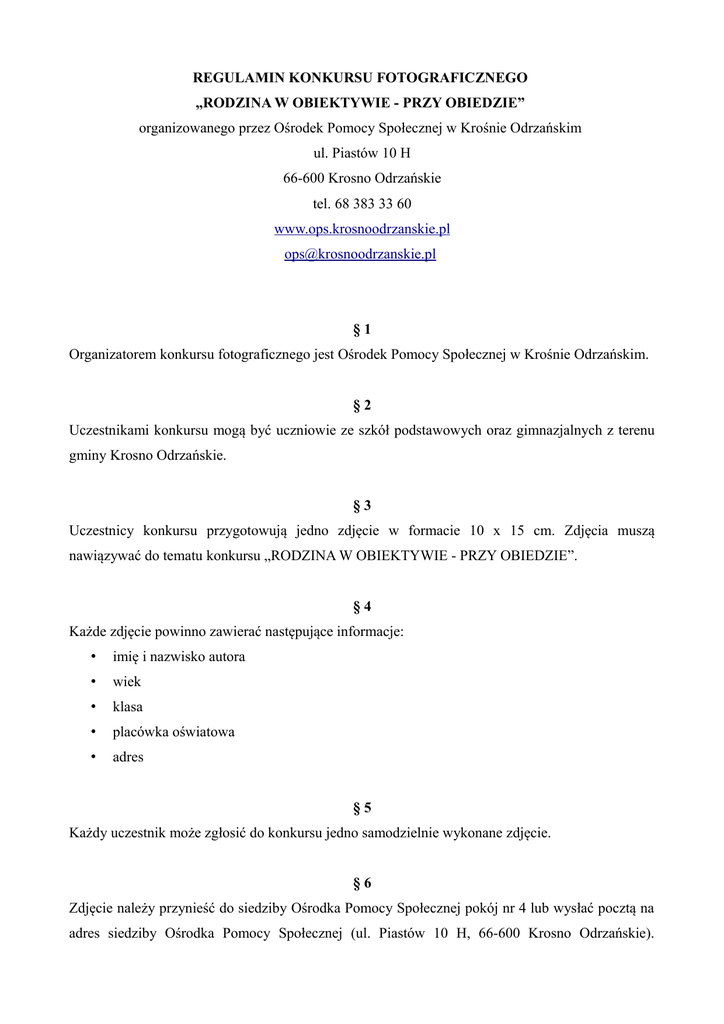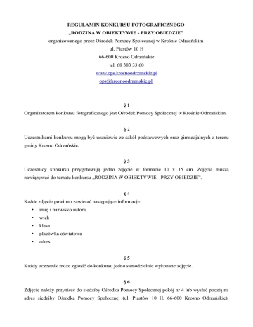 REGULAMIN KONKURSU FOTOGRAFICZNEGO „RODZINA W OBIEKTYWIE - PRZY OBIEDZIE” organizowanego przez Ośrodek Pomocy Społecznej w Krośnie Odrzańskim ul. Piastów 10 H 66-600 Krosno Odrzańskie tel. 68 383 33 60 www.ops.krosnoodrzanskie.pl [email protected] §1 Organizatorem konkursu fotograficznego jest Ośrodek Pomocy Społecznej w Krośnie Odrzańskim. §2 Uczestnikami konkursu mogą być uczniowie ze szkół podstawowych oraz gimnazjalnych z terenu gminy Krosno Odrzańskie. §3 Uczestnicy konkursu przygotowują jedno zdjęcie w formacie 10 x 15 cm. Zdjęcia muszą nawiązywać do tematu konkursu „RODZINA W OBIEKTYWIE - PRZY OBIEDZIE”. §4 Każde zdjęcie powinno zawierać następujące informacje: • imię i nazwisko autora • wiek • klasa • placówka oświatowa • adres §5 Każdy uczestnik może zgłosić do konkursu jedno samodzielnie wykonane zdjęcie. §6 Zdjęcie należy przynieść do siedziby Ośrodka Pomocy Społecznej pokój nr 4 lub wysłać pocztą na adres siedziby Ośrodka Pomocy Społecznej (ul. Piastów 10 H, 66-600 Krosno Odrzańskie). Do zdjęcia należy dołączyć zgodę na wykorzystanie wizerunku oraz oświadczenie o wyrażeniu zgody na przetwarzanie danych osobowych podanych przez rodziców/ opiekunów. §7 Konkurs rozpoczyna się 11.04.2016 r. i trwa do 05.05.2016 r. do godz. 15.30., gdzie 05.05.2016 r. nie jest datą stempla pocztowego, ale ostatecznym terminem przyjmowania zdjęć w siedzibie Ośrodka Pomocy Społecznej (ul. Piastów 10 H, 66-600 Krosno Odrzańskie). §8 Nadesłane prace oceniać będzie jury, które powoła Kierownik Ośrodka Pomocy Społecznej w Krośnie Odrzańskim. §9 Nadesłane prace zostaną podzielone na trzy kategorie wiekowe: 1) uczniowie klas I – III szkół podstawowych 2) uczniowie klas IV- VI szkół podstawowych 3) uczniowie gimnazjum § 10 1. Komisja wybierze po trzy fotografie w każdej kategorii wiekowej. 2. Komisja wybierze również po jednej osobie z każdej grupy wiekowej, która otrzyma wyróżnienie za wykonane zdjęcie. § 11 Wybrane przez komisję zdjęcia zostaną umieszczone na wystawie „Rodzina w obiektywie – przy obiedzie”, która będzie znajdowała się w Galerii Horex od 16.05.2016 r. oraz na stoisku informacyjnym organizowanym przez Ośrodek Pomocy Społecznej podczas dni Krosna Odrzańskiego w dniu 18.06.2016 r. § 12 Wyniki konkursu zostaną ogłoszone w dniu 16.05.2016 r. o godz. 16.30 podczas uroczystego rozdania nagród w Sali Tysiąclecia Urzędu Miasta w Krośnie Odrzańskim. § 13 Zwycięscy konkursu otrzymają następujące nagrody: 1) grupa uczniów klas I – III szkół podstawowych: a) I miejsce – rodzinne wejście do klubokawiarni Kawa & Zabawa, b) II miejsce – gra planszowa pt. „5 sekund”, c) III miejsce – gra planszowa pt. „Fibber”. 2) grupa uczniów klas IV – VI szkół podstawowych: a) I miejsce – rodzinna sesja zdjęciowa b) II miejsce – gra planszowa pt. „Kalambury” c) III miejsce – gra planszowa pt. „Było sobie życie”. 3) grupa uczniów gimnazjum a) I miejsce - rodzinne wejście na Kręgielnię, b) II miejsce – gra planszowa pt. „ Times' up”, c) III miejsce – książka na temat fotografii. § 14 Każda z wyróżnionych osób, o których mowa w § 10 ust. 2 niniejszego regulaminu otrzyma zestaw gadżetów promocyjnych Gminy Krosno Odrzańskie. § 15 Przystępując do udziału w konkursie, uczestnik wyraża zgodę na zastosowanie się do niniejszego regulaminu. § 16 Niniejszy regulamin jest dostępny w siedzibie Ośrodka Pomocy Społecznej w Krośnie Odrzańskim (ul. Piastów 10 H, 66-600 Krosno Odrzańskie). Szczegółowe informacje o konkursie można uzyskać pod numerem tel. 515 569 308/ 68 383 33 73.