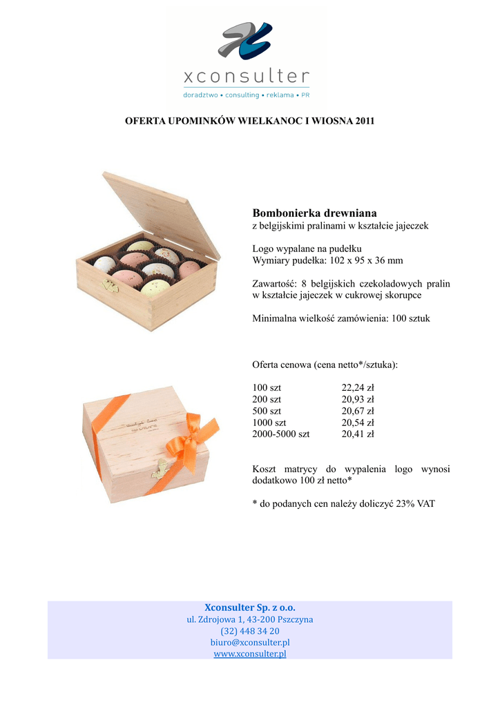 OFERTA UPOMINKÓW WIELKANOC I WIOSNA 2011 Bombonierka drewniana z belgijskimi pralinami w kształcie jajeczek Logo wypalane na pudełku Wymiary pudełka: 102 x 95 x 36 mm Zawartość: 8 belgijskich czekoladowych pralin w kształcie jajeczek w cukrowej skorupce Minimalna wielkość zamówienia: 100 sztuk Oferta cenowa (cena netto*/sztuka): 100 szt 200 szt 500 szt 1000 szt 2000-5000 szt 22,24 zł 20,93 zł 20,67 zł 20,54 zł 20,41 zł Koszt matrycy do wypalenia logo wynosi dodatkowo 100 zł netto* * do podanych cen należy doliczyć 23% VAT Xconsulter Sp. z o.o. ul. Zdrojowa 1, 43-200 Pszczyna (32) 448 34 20 [email protected] www.xconsulter.pl Bombonierka z zajączkiem Zawartość: 3 czekoladowe figurki w kształcie Pisanek i Zająca Wymiary pudełka: 174 x 107 x 15 mm Minimalna wielkość zamówienia: 200 sztuk Przygotowanie projektu graficznego: 50zł/1 godzinę pracy grafika (min. 20zł) + dodatkowo koszt przygotowania do druku wynosi dodatkowo 60 zł netto* za każdy kolor nadruku Oferta cenowa (cena netto*/sztukę) Ilość kolorów nadruku na pudełku i etykietach czekoladek Nakład (szt.) 1 kolor 2 kolory 3 kolory 4 kolory 200 10,75 zł 11,61 zł 12,45 zł 13,31 zł 300 9,89 zł 10,50 zł 11,12 zł 11,73 zł 500 9,13 zł 9,49 zł 9,85 zł 10,22 zł 1000 8,71 zł 8,97 zł 9,23 zł 9,49 zł 2000 - 5000 8,37 zł 8,52 zł 8,66 zł 8,80 zł + opcja dodatkowa pokrycia pudełka folią - koszt wynosi: błyszczącą 0,21 zł netto* za sztukę, matową: 0,34 zł netto* za sztukę. * do podanych cen należy doliczyć 23% VAT Xconsulter Sp. z o.o. ul. Zdrojowa 1, 43-200 Pszczyna (32) 448 34 20 [email protected] www.xconsulter.pl Czekoladowe Jajko w Bombonierce Możliwość umieszczenia logo czekoladzie oraz opakowaniu Klienta na zawartość: 70 g czekolada w kształcie jajka o smaku - mlecznym - deserowym wymiary pudełka: 140 x168 x 25 mm minimalna wielkość zamówienia: 100 szt. Przygotowanie projektu graficznego: 50zł/1 godzinę pracy grafika (min. 20zł) Oferta cenowa: (cena netto*/sztukę) Ilość kolorów nadruku na pudełku i etykietach czekoladek Nakład (szt.) 1 kolor 2 kolory 3 kolory 4 kolory 100 14,73 zł 16,43 zł 18,14 zł 19,84 zł 200 11,36 zł 12,29 zł 13,20 zł 14,12 zł 300 9,46 zł 10,00 zł 10,52 zł 11,04 zł 500 8,71 zł 9,00 zł 9,28 zł 9,57 zł 1000 8,35 zł 8,52 zł 8,68 zł 8,85 zł 3000 8,24 zł 8,37 zł 8,50 zł 8,63 zł 5000 8,13 zł 8,22 zł 8,31 zł + opcja dodatkowa pokrycia pudełka folią - koszt wynosi: błyszczącą 0,42 zł netto* za sztukę, matową: 0,68 zł netto* za sztukę. 8,40 zł + dodatkowo koszt przygotowania matrycy loga na czekoladzie: Proste 2D 700 zł netto Proste 2,5D 1400 zł neto Skomplikowane 2,5D Indywidualna kalkulacja + dodatkowo koszt przygotowania do druku wynosi dodatkowo 60 zł netto* za każdy kolor nadruku. * do podanych cen należy doliczyć 23% VAT Xconsulter Sp. z o.o. ul. Zdrojowa 1, 43-200 Pszczyna (32) 448 34 20 [email protected] www.xconsulter.pl Pudełko Jajko Zawartość: 1 pralinka z mlecznej czekolady z nadzieniem: (folia srebrna lub złota) - orzechowym, - cynamonowym, - kawowym. Wymiary: 80 x 48 x 130 mm Minimalna wielkość zamówienia: 1 000 sztuk Przygotowanie projektu graficznego: 50zł/1 godzinę pracy grafika (min. 20zł) Oferta cenowa: (cena netto*/sztukę) Ilość kolorów nadruku na pudełku i etykietach czekoladek Nakład (szt.) 1 kolor 2 kolory 3 kolory 4 kolory 1000 1,81 zł 1,99 zł 2,16 zł 2,33 zł 3000 1,51 zł 1,59 zł 1,68 zł 1,77 zł 5000 1,44 zł 1,50 zł 1,56 zł 0,00 zł 10000 1,40 zł 1,43 zł 1,46 zł 1,48 zł + opcja dodatkowa pokrycia pudełka folią - koszt wynosi: błyszczącą 0,07 zł netto* za sztukę, matową: 0,12 zł netto* za sztukę. + dodatkowo koszt przygotowania do druku wynosi dodatkowo 60 zł netto* za każdy kolor nadruku * do podanych cen należy doliczyć 23% VAT Xconsulter Sp. z o.o. ul. Zdrojowa 1, 43-200 Pszczyna (32) 448 34 20 [email protected] www.xconsulter.pl Bombonierka Przepiórcze Jajeczka Zawartość: asortyment belgijskich jajeczek z praliną czekoladową w cukrowej otoczce (6 szt.) Wymiary pudełka: 230 x 75 x 19 mm Minimalna wielkość zamówienia: 200 sztuk Przygotowanie projektu graficznego: 50zł/1 godzinę pracy grafika (min. 20zł) Oferta cenowa: (cena netto*/sztukę) Ilość kolorów nadruku na pudełku i etykietach czekoladek Nakład (szt.) 1 kolor 2 kolory 3 kolory 4 kolory 200 14,85 zł 15,70 zł 16,55 zł 17,41 zł 500 13,21 zł 13,57 zł 13,95 zł 14,31 zł 1000 12,69 zł 12,95 zł 13,21 zł 13,47 zł 2000 12,43 zł 12,58 zł 12,73 zł 12,87 zł 3000 12,34 zł 12,43 zł 12,53 zł 12,62 zł 5000 12,29 zł 12,35 zł 12,42 zł 12,48 zł + opcja dodatkowa pokrycia pudełka folią - koszt wynosi: błyszczącą 0,21 zł zł netto* za sztukę, matową: 0,34 zł netto* za sztukę. + dodatkowo koszt przygotowania do druku wynosi dodatkowo 60 zł netto* za każdy kolor nadruku. * do podanych cen należy doliczyć 23% VAT Xconsulter Sp. z o.o. ul. Zdrojowa 1, 43-200 Pszczyna (32) 448 34 20 [email protected] www.xconsulter.pl Oferta ważna do 22.04.2011 Po tym terminie prosimy o wysyłanie zapytań celem potwierdzenia ceny. Z poważaniem, Dział Sprzedaży (32) 448 34 20 [email protected] Xconsulter Xconsulter Sp. z o.o. ul. Zdrojowa 1, 43-200 Pszczyna (32) 448 34 20 [email protected] www.xconsulter.pl