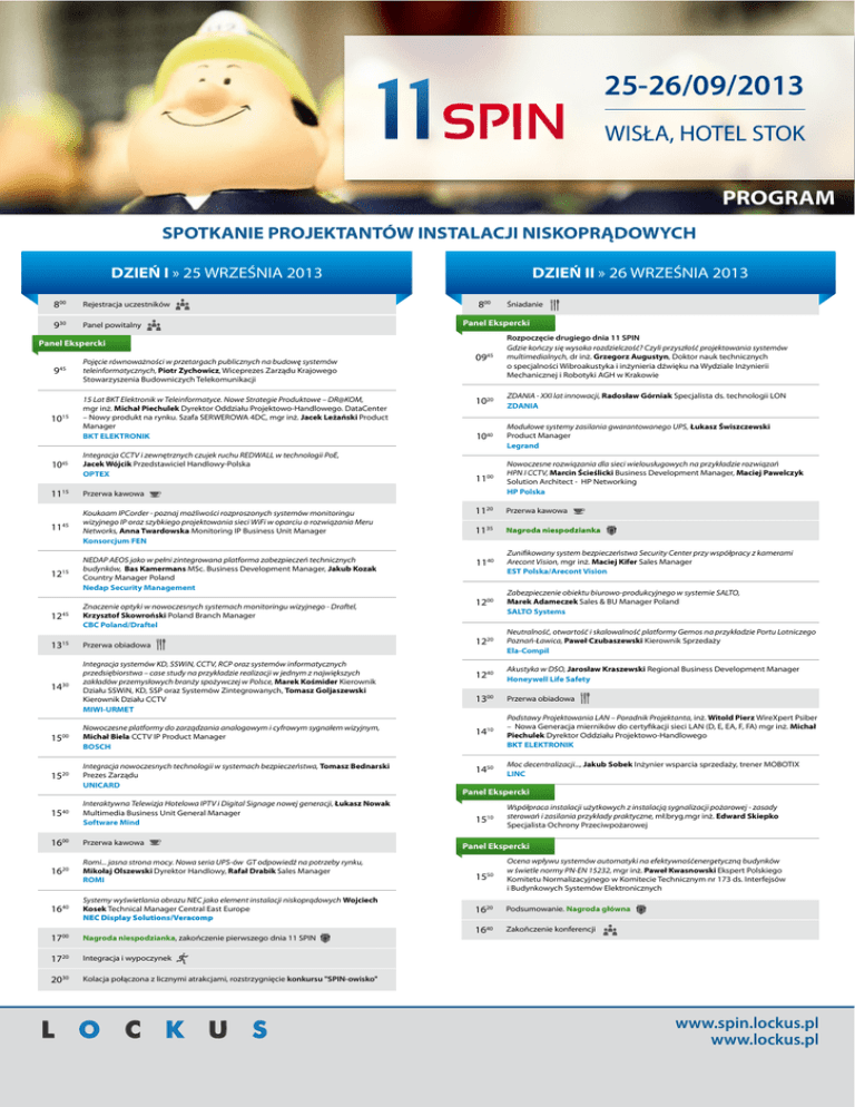 25-26/09/2013 WISŁA, HOTEL STOK PROGRAM SPOTKANIE PROJEKTANTÓW INSTALACJI NISKOPRĄDOWYCH DZIEŃ I » 25 WRZEŚNIA 2013 800 9 30 Rejestracja uczestników Panel powitalny DZIEŃ II » 26 WRZEŚNIA 2013 800 0945 Rozpoczęcie drugiego dnia 11 SPIN Gdzie kończy się wysoka rozdzielczość? Czyli przyszłość projektowania systemów multimedialnych, dr inż. Grzegorz Augustyn, Doktor nauk technicznych o specjalności Wibroakustyka i inżynieria dźwięku na Wydziale Inżynierii Mechanicznej i Robotyki AGH w Krakowie 1020 ZDANIA - XXI lat innowacji, Radosław Górniak Specjalista ds. technologii LON ZDANIA 1040 Modułowe systemy zasilania gwarantowanego UPS, Łukasz Świszczewski Product Manager Legrand 1100 Nowoczesne rozwiązania dla sieci wielousługowych na przykładzie rozwiązań HPN I CCTV, Marcin Ścieślicki Business Development Manager, Maciej Pawelczyk Solution Architect - HP Networking HP Polska 1120 Przerwa kawowa 11 Nagroda niespodzianka Panel Ekspercki 945 1015 1045 Pojęcie równoważności w przetargach publicznych na budowę systemów teleinformatycznych, Piotr Zychowicz, Wiceprezes Zarządu Krajowego Stowarzyszenia Budowniczych Telekomunikacji 15 Lat BKT Elektronik w Teleinformatyce. Nowe Strategie Produktowe – DR@KOM, mgr inż. Michał Piechulek Dyrektor Oddziału Projektowo-Handlowego. DataCenter – Nowy produkt na rynku. Szafa SERWEROWA 4DC, mgr inż. Jacek Leżański Product Manager BKT ELEKTRONIK Integracja CCTV i zewnętrznych czujek ruchu REDWALL w technologii PoE, Jacek Wójcik Przedstawiciel Handlowy-Polska OPTEX 1115 Przerwa kawowa 1145 Koukaam IPCorder - poznaj możliwości rozproszonych systemów monitoringu wizyjnego IP oraz szybkiego projektowania sieci WiFi w oparciu o rozwiązania Meru Networks, Anna Twardowska Monitoring IP Business Unit Manager Konsorcjum FEN 1215 NEDAP AEOS jako w pełni zintegrowana platforma zabezpieczeń technicznych budynków, Bas Kamermans MSc. Business Development Manager, Jakub Kozak Country Manager Poland Nedap Security Management 1245 Znaczenie optyki w nowoczesnych systemach monitoringu wizyjnego - Draftel, Krzysztof Skowroński Poland Branch Manager CBC Poland/Draftel 1315 Przerwa obiadowa 14 Integracja systemów KD, SSWiN, CCTV, RCP oraz systemów informatycznych przedsiębiorstwa – case study na przykładzie realizacji w jednym z największych zakładów przemysłowych branży spożywczej w Polsce, Marek Kośmider Kierownik Działu SSWiN, KD, SSP oraz Systemów Zintegrowanych, Tomasz Goljaszewski Kierownik Działu CCTV MIWI-URMET Śniadanie Panel Ekspercki 35 1140 Zunifikowany system bezpieczeństwa Security Center przy współpracy z kamerami Arecont Vision, mgr inż. Maciej Kifer Sales Manager EST Polska/Arecont Vision 1200 Zabezpieczenie obiektu biurowo-produkcyjnego w systemie SALTO, Marek Adameczek Sales & BU Manager Poland SALTO Systems 1220 Neutralność, otwartość i skalowalność platformy Gemos na przykładzie Portu Lotniczego Poznań-Ławica, Paweł Czubaszewski Kierownik Sprzedaży Ela-Compil 1240 Akustyka w DSO, Jarosław Kraszewski Regional Business Development Manager Honeywell Life Safety 1300 Przerwa obiadowa 1500 Nowoczesne platformy do zarządzania analogowym i cyfrowym sygnałem wizyjnym, Michał Biela CCTV IP Product Manager BOSCH 1410 Podstawy Projektowania LAN – Poradnik Projektanta, inż. Witold Pierz WireXpert Psiber – Nowa Generacja mierników do certyfikacji sieci LAN (D, E, EA, F, FA) mgr inż. Michał Piechulek Dyrektor Oddziału Projektowo-Handlowego BKT ELEKTRONIK 1520 Integracja nowoczesnych technologii w systemach bezpieczeństwa, Tomasz Bednarski Prezes Zarządu UNICARD 1450 Moc decentralizacji..., Jakub Sobek Inżynier wsparcia sprzedaży, trener MOBOTIX LINC 15 Interaktywna Telewizja Hotelowa IPTV i Digital Signage nowej generacji, Łukasz Nowak Multimedia Business Unit General Manager Software Mind 30 40 1600 Przerwa kawowa 1620 Romi... jasna strona mocy. Nowa seria UPS-ów GT odpowiedź na potrzeby rynku, Mikołaj Olszewski Dyrektor Handlowy, Rafał Drabik Sales Manager ROMI 1640 Systemy wyświetlania obrazu NEC jako element instalacji niskoprądowych Wojciech Kosek Technical Manager Central East Europe NEC Display Solutions/Veracomp 1700 Nagroda niespodzianka, zakończenie pierwszego dnia 11 SPIN 1720 Integracja i wypoczynek 2030 Kolacja połączona z licznymi atrakcjami, rozstrzygnięcie konkursu "SPIN-owisko" Panel Ekspercki 1510 Współpraca instalacji użytkowych z instalacją sygnalizacji pożarowej - zasady sterowań i zasilania przykłady praktyczne, mł.bryg.mgr inż. Edward Skiepko Specjalista Ochrony Przeciwpożarowej Panel Ekspercki 1550 Ocena wpływu systemów automatyki na efektywnośćenergetyczną budynków w świetle normy PN-EN 15232, mgr inż. Paweł Kwasnowski Ekspert Polskiego Komitetu Normalizacyjnego w Komitecie Technicznym nr 173 ds. Interfejsów i Budynkowych Systemów Elektronicznych 1620 Podsumowanie. Nagroda główna 16 Zakoñczenie konferencji 40 www.spin.lockus.pl www.lockus.pl
