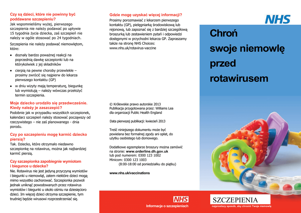 Czy są dzieci, które nie powinny być poddawane szczepieniu? Jak wspomnieliśmy wyżej, pierwszego szczepienia nie należy podawać po upływie 15 tygodnia życia dziecka, zaś szczepień nie należy w ogóle stosować po 24 tygodniach. Szczepienia nie należy podawać niemowlętom, które: Gdzie mogę uzyskać więcej informacji? Prosimy porozmawiać z lekarzem pierwszego kontaktu (GP), pielęgniarką środowiskową lub rejonową, lub zapoznać się z bardziej szczegółową broszurką lub zestawieniem pytań i odpowiedzi dostępnymi w przychodni lekarza GP. Zapraszamy także na stronę NHS Choices: www.nhs.uk/rotavirus-vaccine doznały bardzo poważnej reakcji na poprzednią dawkę szczepionki lub na którykolwiek z jej składników w dniu wizyty mają temperaturę, biegunkę lub wymiotują – należy wówczas przełożyć termin szczepienia. Podobnie jak w przypadku wszystkich szczepionek, kalendarz szczepień należy stosować począwszy od rzeczywistego – nie zaś planowanego - dnia porodu. Czy po szczepieniu mogę karmić dziecko piersią? Tak. Dziecko, które otrzymało niedawno szczepionkę na rotawirus, można jak najbardziej karmić piersią. Czy szczepionka zapobiegnie wymiotom i biegunce u dziecka? Nie. Rotawirus nie jest jedyną przyczyną wymiotów i biegunki u niemowląt, zatem niektóre dzieci mogą mimo wszystko zachorować. Szczepionka pozwoli jednak uniknąć powodowanych przez rotawirus wymiotów i biegunki u około ośmiu na dziesięcioro dzieci. Im więcej dzieci otrzyma szczepienie, tym trudniej będzie wirusowi rozprzestrzeniać się. swoje niemowlę przed rotawirusem cierpią na pewne choroby przewlekłe – prosimy zwrócić się najpierw do lekarza pierwszego kontaktu (GP) Moje dziecko urodziło się przedwcześnie. Kiedy należy je zaszczepić? Chroń © Królewskie prawo autorskie 2013 Publikacja przygotowana przez: Williams Lea dla organizacji Public Health England Data pierwszej publikacji: kwiecień 2013 Treść niniejszego dokumentu może być powielana bez formalnej zgody ani opłat, do użytku osobistego lub domowego. Dodatkowe egzemplarze broszury można zamówić na stronie: www.orderline.dh.gov.uk lub pod numerem: 0300 123 1002 Minicom: 0300 123 1003 (8:00-18:00 od poniedziałku do piątku) www.nhs.uk/vaccinations SZCZEPIENIA Informacje o szczepieniach najprostszy sposób, aby chronić Twoje niemowlę Począwszy od 1 lipca 2013 r. kalendarz rutynowych szczepień dzieci będzie obejmował szczepionkę chroniącą niemowlęta przed infekcją rotawirusem – częstą przyczyną biegunki i wymiotów, które mogą przybierać poważną postać. Niniejsza broszurka zawiera informacje o chorobie oraz chroniącej przed nią szczepionce. Czym jest rotawirus? Rotawirus to infekcja wywołująca co roku wymioty i biegunkę u tysięcy niemowląt. Większość dzieci powraca do zdrowia w domu, jednak w niektórych przypadkach infekcja może przybierać poważną postać i prowadzić do odwodnienia (utraty płynów z organizmu) oraz konieczności leczenia szpitalnego. Jak rotawirus się rozprzestrzenia? Rotawirus jest łatwo przenoszony drogą kontaktu dłoni z ustami, po zetknięciu z powierzchnią zabawek, rąk lub brudnych pieluszek. Może także być przenoszony w powietrzu przez kichanie i kaszel. Rozprzestrzenianie się wirusa można ograniczyć poprzez mycie rąk i utrzymywanie otoczenia w czystości, jednak nie spowoduje to całkowitego wyeliminowania ryzyka infekcji. Znacznie skuteczniejszym sposobem ochrony dzieci przed infekcją jest szczepienie. Pierwsza dawka szczepienia może zostać podana najpóźniej do 15 tygodnia życia. Szczepieniu nie zostanie poddane żadne dziecko powyżej 24 tygodnia. Drugą dawkę można podać pod warunkiem podania pierwszej szczepionki przed upływem 15 tygodnia. Dlaczego starsze niemowlęta nie mogą otrzymać szczepionki? W miarę upływu czasu, u niektórych dzieci – w około jednym na tysiąc przypadków – pojawia się schorzenie powodujące zablokowanie dolnego odcinka jelita. Jest ono niezwykle rzadkie u dzieci przed upływem 3 miesiąca życia; większość przypadków ma miejsce między 5 i 12 miesiącem. Ponadto występuje bardzo niewielkie ryzyko (u około dwóch na każde sto tysięcy zaszczepionych niemowląt), że pierwsza dawka szczepienia również doprowadzi do zablokowania jelita. Z myślą o ograniczeniu takiego ryzyka nie podaje się pierwszej dawki szczepienia dzieciom po upływie 15 tygodnia życia. W jaki sposób podaje się szczepionkę? Szczepionka na rotawirus jest podawana w formie płynu za pomocą kroplomierza, aby ułatwić dziecku jej połknięcie. Co się stanie, jeśli bezpośrednio po przyjęciu szczepionki dziecko ją wypluje lub zwymiotuje? Kiedy moje dziecko otrzyma szczepionkę? Krople zostaną podane ponownie. Dzieci, które przyszły na świat 1 maja 2013 r. lub później, będą mogły zostać poddane szczepieniu od 1 lipca. Czy dziecko dozna infekcji rotawirusem na skutek podania szczepionki? Szczepionka zostanie podana wraz z innymi rutynowymi szczepieniami, w wieku dwóch, a następnie trzech miesięcy. Dziecko potrzebuje dwóch dawek szczepienia na rotawirus, w odstępie co najmniej 4 tygodni, aby otrzymać optymalną ochronę. W razie opuszczenia jednego ze szczepień można je także podać w wieku 2 i 4 miesięcy lub 3 i 4 miesięcy. Nie. Wirus zawarty w szczepionce jest osłabiony i nie wywołuje choroby. Szczepionka umożliwia dziecku wykształcenie odporności, dzięki czemu uniknie ono choroby, gdy po raz kolejny zetknie się z wirusem. Jako że szczepionka podawana jest doustnie, możliwe jest, iż zawarty w niej wirus przedostanie się do jelit dziecka. Może wówczas dojść do zetknięcia z wirusem przez osobę przewijającą dziecku pieluszkę. Wszyscy, którzy mają bliski kontakt z niemowlętami poddanymi niedawno szczepieniu, powinni dbać o utrzymywanie higieny osobistej (tzn. mycie rąk po przewinięciu dziecka). Jak postąpić, jeżeli w dniu szczepien
