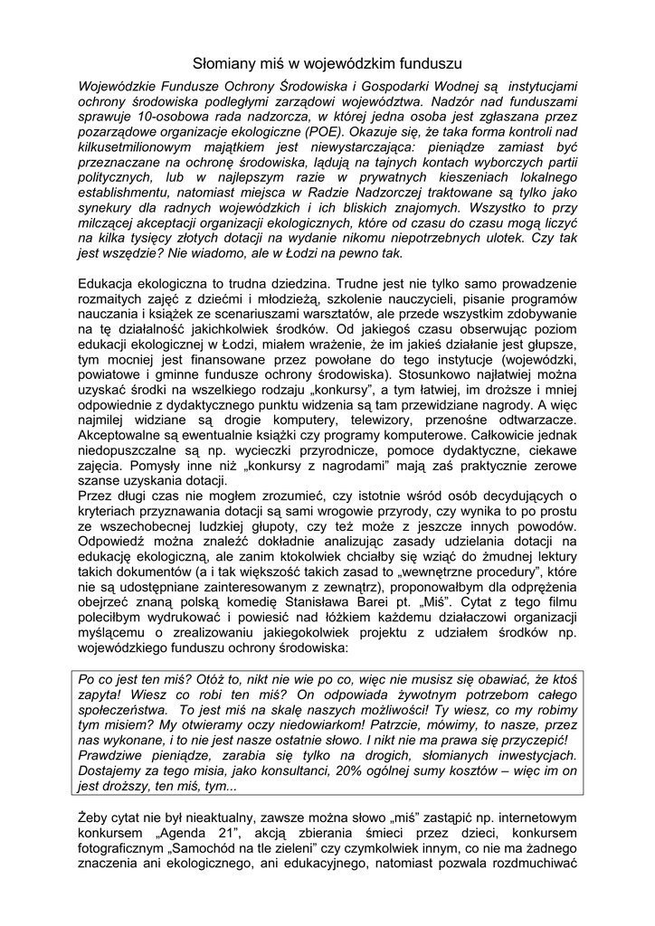 Słomiany miś w wojewódzkim funduszu Wojewódzkie Fundusze Ochrony Środowiska i Gospodarki Wodnej są instytucjami ochrony środowiska podległymi zarządowi województwa. Nadzór nad funduszami sprawuje 10-osobowa rada nadzorcza, w której jedna osoba jest zgłaszana przez pozarządowe organizacje ekologiczne (POE). Okazuje się, że taka forma kontroli nad kilkusetmilionowym majątkiem jest niewystarczająca: pieniądze zamiast być przeznaczane na ochronę środowiska, lądują na tajnych kontach wyborczych partii politycznych, lub w najlepszym razie w prywatnych kieszeniach lokalnego establishmentu, natomiast miejsca w Radzie Nadzorczej traktowane są tylko jako synekury dla radnych wojewódzkich i ich bliskich znajomych. Wszystko to przy milczącej akceptacji organizacji ekologicznych, które od czasu do czasu mogą liczyć na kilka tysięcy złotych dotacji na wydanie nikomu niepotrzebnych ulotek. Czy tak jest wszędzie? Nie wiadomo, ale w Łodzi na pewno tak. Edukacja ekologiczna to trudna dziedzina. Trudne jest nie tylko samo prowadzenie rozmaitych zajęć z dziećmi i młodzieżą, szkolenie nauczycieli, pisanie programów nauczania i książek ze scenariuszami warsztatów, ale przede wszystkim zdobywanie na tę działalność jakichkolwiek środków. Od jakiegoś czasu obserwując poziom edukacji ekologicznej w Łodzi, miałem wrażenie, że im jakieś działanie jest głupsze, tym mocniej jest finansowane przez powołane do tego instytucje (wojewódzki, powiatowe i gminne fundusze ochrony środowiska). Stosunkowo najłatwiej można uzyskać środki na wszelkiego rodzaju „konkursy”, a tym łatwiej, im droższe i mniej odpowiednie z dydaktycznego punktu widzenia są tam przewidziane nagrody. A więc najmilej widziane są drogie komputery, telewizory, przenośne odtwarzacze. Akceptowalne są ewentualnie książki czy programy komputerowe. Całkowicie jednak niedopuszczalne są np. wycieczki przyrodnicze, pomoce dydaktyczne, ciekawe zajęcia. Pomysły inne niż „konkursy z nagrodami” mają zaś praktycznie zerowe szanse uzyskania dotacji. Przez długi czas nie mogłem zrozumieć, czy istotnie wśród osób decydujących o kryteriach przyznawania dotacji są sami wrogowie przyrody, czy wynika to po prostu ze wszechobecnej ludzkiej głupoty, czy też może z jeszcze innych powodów. Odpowiedź można znaleźć dokładnie analizując zasady udzielania dotacji na edukację ekologiczną, ale zanim ktokolwiek chciałby się wziąć do żmudnej lektury takich dokumentów (a i tak większość takich zasad to „wewnętrzne procedury”, które nie są udostępniane zainteresowanym z zewnątrz), proponowałbym dla odprężenia obejrzeć znaną polską komedię Stanisława Barei pt. „Miś”. Cytat z tego filmu poleciłbym wydrukować i powiesić nad łóżkiem każdemu działaczowi organizacji myślącemu o zrealizowaniu jakiegokolwiek projektu z udziałem środków np. wojewódzkiego funduszu ochrony środowiska: Po co jest ten miś? Otóż to, nikt nie wie po co, więc nie musisz się obawiać, że ktoś zapyta! Wiesz co robi ten miś? On odpowiada żywotnym potrzebom całego społeczeństwa. To jest miś na skalę naszych możliwości! Ty wiesz, co my robimy tym misiem? My otwieramy oczy niedowiarkom! Patrzcie, mówimy, to nasze, przez nas wykonane, i to nie jest nasze ostatnie słowo. I nikt nie ma prawa się przyczepić! Prawdziwe pieniądze, zarabia się tylko na drogich, słomianych inwestycjach. Dostajemy za tego misia, jako konsultanci, 20% ogólnej sumy kosztów – więc im on jest droższy, ten miś, tym... Żeby cytat nie był nieaktualny, zawsze można słowo „miś” zastąpić np. internetowym konkursem „Agenda 21”, akcją zbierania śmieci przez dzieci, konkursem fotograficznym „Samochód na tle zieleni” czy czymkolwiek innym, co nie ma żadnego znaczenia ani ekologicznego, ani edukacyjnego, natomiast pozwala rozdmuchiwać budżet do dowolnych granic. Oczywiście nie ma tu mowy o żadnych 20% dla konsultantów, mechanizm jest zupełnie inny i równie korupcjogenny. Opiera się on o istnienie tzw. „wkładu własnego” oraz „kosztów kwalifikowanych”. Wkład własny oznacza, że organizacja starająca się o dofinansowanie jakiegokolwiek projektu, musi część kosztów pokryć z własnych środków. Jest to normalny i powszechnie praktykowany mechanizm. W funduszach europejskich wkład własny wynosi np. od 7 do 20 procent. W wojewódzkich funduszach ochrony środowiska w całej Polsce – od 20 do 50%. W WFOŚiGW w Łodzi – 60%. Do wkładu własnego nie można zaliczać oczywiście kosztów niekwalifikowanych, tzn. kosztów stałych (czynsz, telefon), kosztów osobowych (wynagrodzenia trenerów, specjalistów), bezpłatnej pracy wolontariuszy. W zależności od humoru osób rozliczających dotacje kosztami kwalifikowanymi nie są też: koszty transportu (np. autokar wiozący dzieci na wycieczkę), noclegi, wyżywienie, trwałe materiały dydaktyczne (takie, które mogłyby pozostać po realizacji projektu) – zasady nie są nigdzie spisane i nie można wcześniej uzyskać na ich temat informacji. W praktyce wygląda to w ten sposób, że chcąc np. zrealizować dla dzieci z miejscowości X cykl zajęć edukacyjnych, wartych powiedzmy 10 tys. złotych (z tego powiedzmy 2 tys. zł na wynajem sali, 2 tys. zł na pomoce dydaktyczne, 3 tys. złotych na wynagrodzenia edukatorów i 3 tys. zł na druk materiałów edukacyjnych), można aplikować do WFOŚiGW na pokrycie 40% kosztów druku, czyli 1200 złotych. Oczywiście, żeby po zakończeniu zadania otrzymać te pieniądze, należy przedstawić rachunki i dowody zapłaty całych 10 tys. złotych. Tak więc organizacja musi dysponować własnymi 10 tys. złotych, z których po kilku miesiącach od przeprowadzenia projektu, może liczyć na zwrot 1200 złotych, lub też nie, ponieważ kwota dotacji obliczana jest procentowo i zmiany w rozliczeniu innych kosztów projektu (np. w przypadku, gdyby u