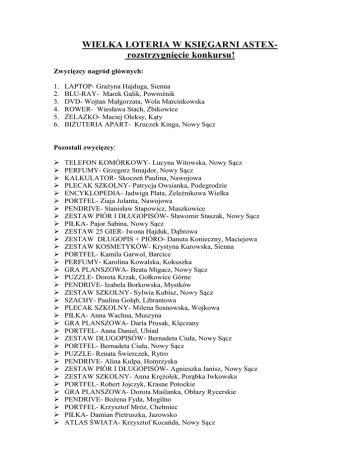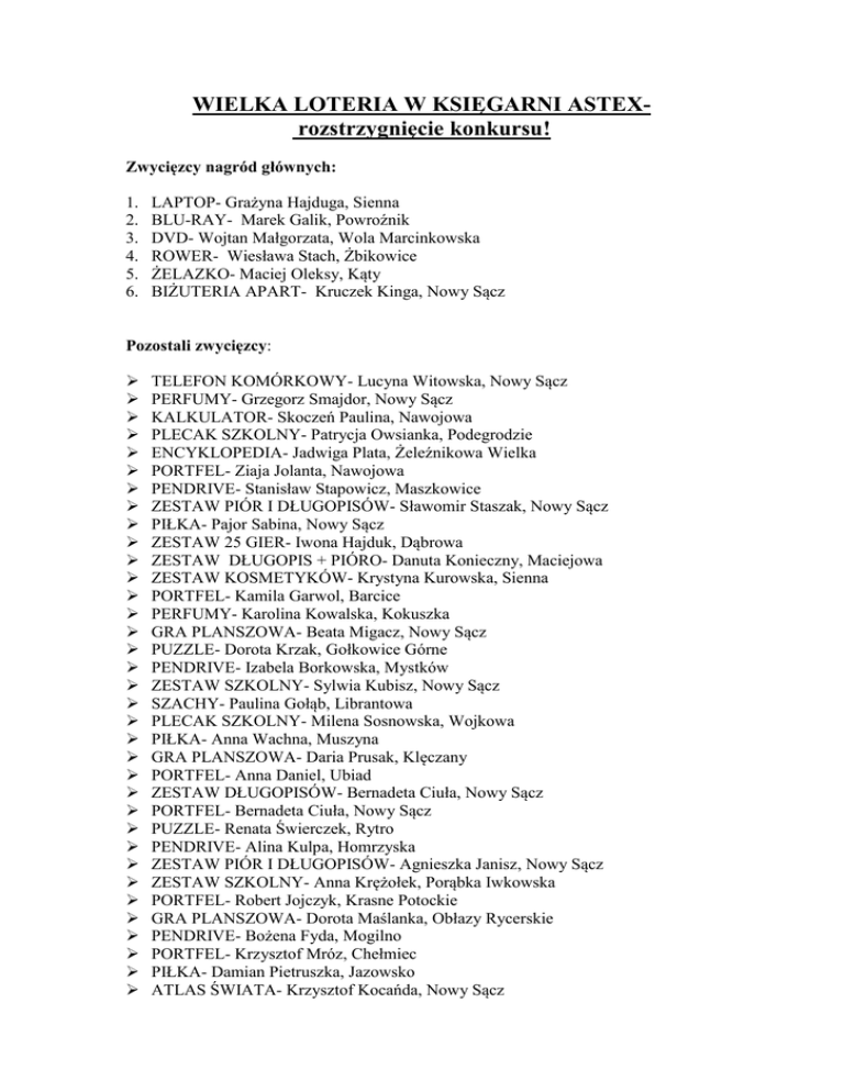 WIELKA LOTERIA W KSIĘGARNI ASTEXrozstrzygnięcie konkursu! Zwycięzcy nagród głównych: 1. 2. 3. 4. 5. 6. LAPTOP- Grażyna Hajduga, Sienna BLU-RAY- Marek Galik, Powroźnik DVD- Wojtan Małgorzata, Wola Marcinkowska ROWER- Wiesława Stach, Żbikowice ŻELAZKO- Maciej Oleksy, Kąty BIŻUTERIA APART- Kruczek Kinga, Nowy Sącz Pozostali zwycięzcy: TELEFON KOMÓRKOWY- Lucyna Witowska, Nowy Sącz PERFUMY- Grzegorz Smajdor, Nowy Sącz KALKULATOR- Skoczeń Paulina, Nawojowa PLECAK SZKOLNY- Patrycja Owsianka, Podegrodzie ENCYKLOPEDIA- Jadwiga Plata, Żeleźnikowa Wielka PORTFEL- Ziaja Jolanta, Nawojowa PENDRIVE- Stanisław Stapowicz, Maszkowice ZESTAW PIÓR I DŁUGOPISÓW- Sławomir Staszak, Nowy Sącz PIŁKA- Pajor Sabina, Nowy Sącz ZESTAW 25 GIER- Iwona Hajduk, Dąbrowa ZESTAW DŁUGOPIS + PIÓRO- Danuta Konieczny, Maciejowa ZESTAW KOSMETYKÓW- Krystyna Kurowska, Sienna PORTFEL- Kamila Garwol, Barcice PERFUMY- Karolina Kowalska, Kokuszka GRA PLANSZOWA- Beata Migacz, Nowy Sącz PUZZLE- Dorota Krzak, Gołkowice Górne PENDRIVE- Izabela Borkowska, Mystków ZESTAW SZKOLNY- Sylwia Kubisz, Nowy Sącz SZACHY- Paulina Gołąb, Librantowa PLECAK SZKOLNY- Milena Sosnowska, Wojkowa PIŁKA- Anna Wachna, Muszyna GRA PLANSZOWA- Daria Prusak, Klęczany PORTFEL- Anna Daniel, Ubiad ZESTAW DŁUGOPISÓW- Bernadeta Ciuła, Nowy Sącz PORTFEL- Bernadeta Ciuła, Nowy Sącz PUZZLE- Renata Świerczek, Rytro PENDRIVE- Alina Kulpa, Homrzyska ZESTAW PIÓR I DŁUGOPISÓW- Agnieszka Janisz, Nowy Sącz ZESTAW SZKOLNY- Anna Krężołek, Porąbka Iwkowska PORTFEL- Robert Jojczyk, Krasne Potockie GRA PLANSZOWA- Dorota Maślanka, Obłazy Rycerskie PENDRIVE- Bożena Fyda, Mogilno PORTFEL- Krzysztof Mróz, Chełmiec PIŁKA- Damian Pietruszka, Jazowsko ATLAS ŚWIATA- Krzysztof Kocańda, Nowy Sącz SŁOWNIK ANGIELSKO- POLSKI- Marek Bajorek, Gródek nad Dunajcem ZESTAW DŁUGOPISÓW- Grzegorz Kowalski, Kamionka Wielka PENDRIVE- Stefan Kociołek, Stary Sącz PORTFEL- Monika Ruchała, Mogilno KALKULATOR- Bogdan Krzyżak, Rąbkowa SŁOWNIK ANGIELSKO- POLSKI- Ewa Smoter, Nawojowa ATLAS ŚWIATA- Andrzej Porębski, Łęka PENDRIVE- Mateusz Uroda, Kamionka Wielka ZESTAW SZKOLNY- Danuta Olchawa, Roztoka Rycerska KALKULATOR- Paulina Fornagiel, Siedlce PENDRIVE- Paulina Fornagiel, Siedlce ZESTAW KOSMETYKÓW- Aleksandra Wojnarska, Nowy Sącz PLECAK- Małgorzata Iwańska, Mała Wieś PIŁKA- Natalia Buczek, Piwniczna SŁOWNIK NIEMIECKO- POLSKI- Bernadeta Michalik, Nowy Sącz PENDRIVE- Agnieszka Stosur, Chomranice, PIŁKA- Bernadeta Wierzbanowska, Korzenna PORTFEL- Karolina Ruchała, Koniuszowa GRA SCRIBA- Łukasz Piekarz, Miłkowa ZESTAW SZKOLNY- Alina Wyrostek, Obidza PORTFEL- Klaudia Florek, Nowy Sącz ZESTAW SZKOLNY- Aneta Szczecina, Nowy Sącz ENCYKLOPEDIA- Marzena Kądziołka, Klęczany ZESTAW RECZNIKÓW- Jerzy Słaby, Nawojowa GRA PLANSZOWA- Jerzy Słaby, Nawojowa ZESTAW SZKOLNY- Maria Maciejewska, Nowy Sącz PORTFEL- Jarosław Stokłosa, Chełmiec GRA PLANSZOWA- Monika Janus, Ptaszkowa ZESTAW DŁUGOPISÓW- Beata Kloska, Rytro PENDRIVE- Urszula Skórnóg, Nowy Sącz SŁOWNIK- Katarzyna Lelito, Dąbrówki ZESTAW SZKOLNY- Aneta Leśniak, Biczyce Dolne GRA PLANSZOWA- Anna Kocemba, Nowy Sącz ZESTAW SZKOLNY- Anna Piksa, Szczereż ENCYKLOPEDIA- Maria Rusiniak, Wierchomla Wielka SŁOWNIK- Natalia Sroka, Żeleźnikowa Wielka, PENDRIVE- Anna Igielska, Nowy Sącz SŁOWNIK- Elżbieta Bocheńska, Bącza Kunina ZESTAW DŁUGOPISÓW- Włodzimierz Chełmecki, Nowy Sącz ZESTAW SZKOLNY- Anna Baran, Bobowa SŁOWNIK- Maria Gruca, Binczarowa GRA PLANSZOWA- Małgorzata Łatka, Podegrodzie PLECAK SZKOLNY- Andrzej Olszewski, Mogilno ZESTAW KOSMETYKÓW- Danuta Majerska, Kunów KALKULATOR- Halina Szlag, Jasienna PERFUMY- Teresa Wójcik, Krużlowa Niżna ZESTAW RECZNIKÓW- Stanisław Zelek, Łososina Dolna SŁOWNIK- Beata Maślanka, Łomnica Zdrój PENDRIVE- Iwona Dudek, Żeleźnikowa Wielka PORTFEL- Małgorzata Basta, Lipie ZESTAW SZKOLNY- Bożena Janus, Rojówka PLECAK- Monika Olszowska, Gołkowice Dolne ZESTAW PIÓR I DŁUGOPISÓW- Maria Nowak, Maciejowa ZESTAW KOSMETYKÓW- Iwona Pancerz, Lipie SŁOWNIK- Edyta Migacz, Nowy Sącz KSIĄŻKA- Wiesława Giza, Nowy Sącz ENCYKLOPEDIA- Maria Janeczko, Nawojowa PLECAK SZKOLNY- Maria Fałowska, Wielopole PENDRIVE- Janina Bogdańska, Nawojowa PENDRIVE- Ewa Kmiecik, Gołkowice KALKULATOR- Ryszard Bochenek, Nowy Sącz ZESTAW SZKOLNY- Maria Szczepaniak, Kadcza GRA PLANSZOWA- Anita Kubisz, Korzenna PIŁKA- Małgorzata Waśko, Wola Kurowska SŁOWNIK- Monika Majerska, Kadcza PLECAK- Elżbieta Ogorzałek, Żeleźnikowa Mała ZESTAW DŁUGOPISÓW- Elżbieta Ogorzałek, Żeleźnikowa Mała ZESTAW SZKOLNY- Elżbieta Gieniec, Mystków ZESTAW RECZNIKÓW- Bożena Kostecka, Korzenna ZESTAW KOSMETYKÓW- Bożena Kostecka, Korzenna PLECAK- Bogusława Skorupa, Łomnica Zdrój PENDRIVE- Grażyna Klimontowska, Nowy Sącz PORTFEL- Janina Łabno, Nowy Sącz SŁOWNIK ANGIELSKO- POLSKI- Lucyna Stanisz, Obidza KALKULATOR- Elżbieta Rak, Chełmiec SŁOWNIK- Celina Klag, Brzyna PUZZLE- Marian Wielgus, Korzenna SŁOWNIK ANGIELSKO- POLSKI- Teresa Miedzian, Nowy Sącz ZESTAW SZKOLNY- Szymon Celka, Nowy Sącz PLECAK- Maciej Lach, Chełmiec PENDRIVE- Beata Olszak, Rdziostów ZESTAW PIÓR I DŁUGOPISÓW- Anna Szeptak, Maciejowa GRA PLANSZOWA- Krystyna Szczygieł, Krużlowa Niżna SŁOWNIK- Elżbieta Ziobrowska, Bącza Kunina PENDRIVE- Agata Fiedor, Łomnica Zdrój PORTFEL- Maria Kaczmarczyk, Krasne Potockie SŁOWNIK- Paulina Oracz, Trzycierz ZESTAW PIÓR- Małgorzata Wójcik, Nowy Sącz KALKULATOR- Tomasz Dziedzina, Piwniczna ZESTAW KOSMETYKÓW- Alina Kościółek, Paszyn ZESTAW KOSMETYKÓW- Maria Zawiłowicz, Bogusza PORTFEL- Małgorzata Czerpak, Przysietnica SŁOWNIK- Bożena Jawor, Maszkowice ZESTAW PIÓR I DŁUGOPISÓW- Ewa Śliwa, Rytro SŁOWNIK- Joanna Turek, Kadcza ZESTAW SZKOLNY- Bożena Kapała, Korzenna PENDRIVE- Barbara Błaszczyk, Podegrodzie SŁOWNIK- Aneta Brzezińska, Rytro SŁOWNIK- Tadeusz Szkarłat, Brzezna ZESTAW SZKOLNY- Elżbiet