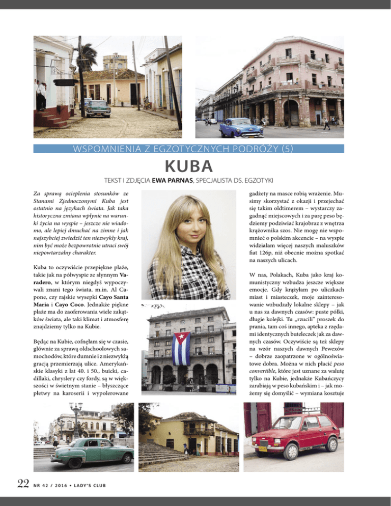 WSPOMNIENIA Z EGZOTYCZNYCH PODRÓŻY (5) KUBA TEKST I ZDJĘCIA EWA PARNAS, SPECJALISTA DS. EGZOTYKI Za sprawą ocieplenia stosunków ze Stanami Zjednoczonymi Kuba jest ostatnio na językach świata. Jak taka historyczna zmiana wpłynie na warunki życia na wyspie – jeszcze nie wiadomo, ale lepiej dmuchać na zimne i jak najszybciej zwiedzić ten niezwykły kraj, nim być może bezpowrotnie utraci swój niepowtarzalny charakter. Kuba to oczywiście przepiękne plaże, takie jak na półwyspie ze słynnym Varadero, w którym niegdyś wypoczywali znani tego świata, m.in. Al Capone, czy rajskie wysepki Cayo Santa Maria i Cayo Coco. Jednakże piękne plaże ma do zaoferowania wiele zakątków świata, ale taki klimat i atmosferę znajdziemy tylko na Kubie. Będąc na Kubie, cofnęłam się w czasie, głównie za sprawą oldschoolowych samochodów, które dumnie i z niezwykłą gracją przemierzają ulice. Amerykańskie klasyki z lat 40. i 50., buicki, cadillaki, chryslery czy fordy, są w większości w świetnym stanie – błyszczące płetwy na karoserii i wypolerowane 22 NR 42 / 2016 • LADY’S CLUB gadżety na masce robią wrażenie. Musimy skorzystać z okazji i przejechać się takim oldtimerem – wystarczy zagadnąć miejscowych i za parę peso będziemy podziwiać krajobraz z wnętrza krążownika szos. Nie mogę nie wspomnieć o polskim akcencie – na wyspie widziałam więcej naszych maluszków �at 126p, niż obecnie można spotkać na naszych ulicach. W nas, Polakach, Kuba jako kraj komunistyczny wzbudza jeszcze większe emocje. Gdy krążyłam po uliczkach miast i miasteczek, moje zainteresowanie wzbudzały lokalne sklepy – jak u nas za dawnych czasów: puste półki, długie kolejki. Tu „rzucili” proszek do prania, tam coś innego, apteka z rzędami identycznych buteleczek jak za dawnych czasów. Oczywiście są też sklepy na wzór naszych dawnych Pewexów – dobrze zaopatrzone w ogólnoświatowe dobra. Można w nich płacić peso convertible, które jest uznane za walutę tylko na Kubie, jednakże Kubańczycy zarabiają w peso kubańskim i – jak możemy się domyślić – wymiana kosztuje krocie. Sama przekonałam się o tym, kupując paczkę orzeszków u lokalnego sprzedawcy. Nieświadoma, zapłaciłam mu peso convertible, a pan chciał mi za to dać... cały swój stragan z orzeszkami! Taka jest właśnie jego wartość. Podróżując po Kubie, warto nocować w casas particulares, czyli po prostu domach zwykłych ludzi, którzy mają pokoje do wynajęcia. To najlepszy sposób, by poznać lokalne zwyczaje. Ja zatrzymałam się w takim przybytku u przemiłego małżeństwa Marii i Jose w kolonialnym budynku w samym centrum Trinidadu. Mimo że nie mówię po hiszpańsku, a oni po angielsku, spędziliśmy sporo czasu na rozmowach. Dowiedziałam się m.in., że rząd pozwala im wynajmować tylko 2 pokoje – za większą ilość są kary. Sam Trinidad okazał się moim ulubionym miejscem na wyspie. Brukowane uliczki, niskie, pastelowe, kolonialne domy i liczne dorożki przemierzające miasto. Wieczorem zaś uliczki rozbrzmiewają dźwiękami salsy. Jak na tak niewielkie miasteczko miejsc, w których możemy posłuchać i oczywiście potańczyć salsę, jest sporo. Najbardziej znane są – uwaga! – schody przed słynnym Casa de la Musica. Tam zawsze znajdą się chętni, by za darmo nauczyć paru kroków przybyłych gringos. Rano Jose, który kiedyś był barmanem w jednym z modnych hoteli w Varadero, zaserwował na swoim patio najlepsze śniadanie, jakie kiedykolwiek jadłam, m.in. świeży sok z papai, pieczywo własnego wypieku i mnóstwo pyszności. Taka właśnie jest kubańska gościnność! Oczywiście punktem obowiązkowym na mojej trasie była Hawana. Starówka, wpisana na listę UNESCO, jest dobrze utrzymana. Z wielką przyjemnością spacerowałam po kolonialnych uliczkach i słynnym Plaza de Armas oraz podziwiałam XVI-wieczne forty�kacje. Plac Rewolucji, na którym Fidel Castro miał zwyczaj wygłaszać swoje wielogodzinne przemówienia, rozbudza wyobraźnię. Natomiast słynny nadmorski bulwar El Malecon to miejsce spotkań lokalnych mieszkańców, głównie zakochanych par – warto przespacerować się nim o zachodzie słońca. Kolację zjadłam w restauracji, w której Fidel Castro i Che Guevarą prowadzili przesądzające zapewne o losach kraju rozmowy, co upamiętnia pożółkła fotogra�a na ścianie. Na koniec mojej wizyty w Hawanie w barze El Floridita, w którym chętnie przesiadywał Ernest Hemingway, wypiłam jego ulubionego drinka, daiquiri – oczywiście na bazie lokalnego rumu z dodatkiem limetki i syropu cukrowego. Wokół unosił się dym ze słynnych kubańskich cygar, a w tle rozbrzmiewały dźwięki Buena Vista Social Club... Wpadajcie na Kubę! Egzotyka to nasza specjalność! GAP Travel Biuro Podróży Plac Wojska Polskiego 15 Bielsko-Biała www.gaptravel.pl e-mail: [email protected] infolinia 33 816 41 41 NR 42 / 2016 • LADY’S CLUB 23