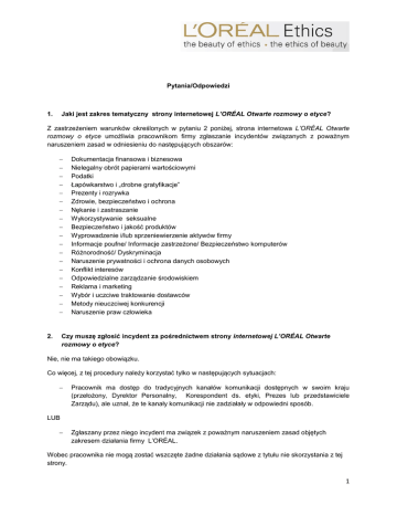Pytania/Odpowiedzi Jaki jest zakres tematyczny strony internetowej L’ORÉAL Otwarte rozmowy o etyce? 1. Z zastrzeżeniem warunków określonych w pytaniu 2 poniżej, strona internetowa L’ORÉAL Otwarte rozmowy o etyce umożliwia pracownikom firmy zgłaszanie incydentów związanych z poważnym naruszeniem zasad w odniesieniu do następujących obszarów: Dokumentacja finansowa i biznesowa Nielegalny obrót papierami wartościowymi Podatki Łapówkarstwo i „drobne gratyfikacje” Prezenty i rozrywka Zdrowie, bezpieczeństwo i ochrona Nękanie i zastraszanie Wykorzystywanie seksualne Bezpieczeństwo i jakość produktów Wyprowadzenie i/lub sprzeniewierzenie aktywów firmy Informacje poufne/ Informacje zastrzeżone/ Bezpieczeństwo komputerów Różnorodność/ Dyskryminacja Naruszenie prywatności i ochrona danych osobowych Konflikt interesów Odpowiedzialne zarządzanie środowiskiem Reklama i marketing Wybór i uczciwe traktowanie dostawców Metody nieuczciwej konkurencji Naruszenie praw człowieka Czy muszę zgłosić incydent za pośrednictwem strony internetowej L’ORÉAL Otwarte rozmowy o etyce? 2. Nie, nie ma takiego obowiązku. Co więcej, z tej procedury należy korzystać tylko w następujących sytuacjach: Pracownik ma dostęp do tradycyjnych kanałów komunikacji dostępnych w swoim kraju (przełożony, Dyrektor Personalny, Korespondent ds. etyki, Prezes lub przedstawiciele Zarządu), ale uznał, że te kanały komunikacji nie zadziałały w odpowiedni sposób. LUB Zgłaszany przez niego incydent ma związek z poważnym naruszeniem zasad objętych zakresem działania firmy L’ORÉAL. Wobec pracownika nie mogą zostać wszczęte żadne działania sądowe z tytułu nie skorzystania z tej strony. 1 3. Kto może korzystać ze strony L’ORÉAL Otwarte rozmowy o etyce? Strona jest przeznaczona dla osób, które są lub były pracownikami firm należących do Grupy L’ORÉAL. 4. Czy strona L’ORÉAL Otwarte rozmowy o etyce została zatwierdzona przez CNIL (francuski Urząd ochrony danych osobowych)? Tak. 5. Co przyczyniło się do powstania strony L’ORÉAL Otwarte rozmowy o etyce? Większość problemów można rozwiązać za pomocą tradycyjnych kanałów komunikacji dostępnych w danym kraju (przełożony, Dyrektor Personalny, Korespondent ds. etyki, Prezes oraz/lub przedstawiciele Zarządu firmy). Firma L’ORÉAL chciałaby jednak zadbać o to, aby wszystkie zgłaszane incydenty były sprawdzane i dlatego postanowiła stworzyć dodatkową drogę komunikacji z Dyrektorem ds. etyki Grupy L’Oréal. Ta strona jest po prostu środkiem służącym do nawiązania z nim kontaktu. Z Dyrektorem ds. etyki Grupy można się również skontaktować drogą pocztową (p. Emmanuel LULIN, SVP & Chief Ethics Officer, L’ORÉAL S.A., 41, rue Martre, 92117 Clichy, France) lub drogą mailową ([email protected] – proszę oznaczyć wiadomość e-mail jako “Private”). 6. W jaki sposób strona gwarantuje zachowanie poufności informacji? Do informacji przekazanych za pośrednictwem strony L’ORÉAL Otwarte rozmowy o etyce ma dostęp jedynie niewielka liczba osób. Te upoważnione osoby zostały zobowiązane do zachowania ścisłej poufności. Strona L’ORÉAL Otwarte rozmowy o etyce jest prowadzona przez zewnętrznego dostawcę usług, niezależnie od systemów komputerowych firmy L’ORÉAL. Usługodawca również został zobowiązany do zachowania ścisłej poufności i musi zniszczyć wszystkie dane zgromadzone za pośrednictwem strony w ciągu dwóch godzin od potwierdzenia otrzymania zgłoszenia przez upoważnione do tego osoby. W razie konieczności przeprowadzenia dochodzenia informacje te zostaną udostępnione tylko osobom, którym przysługuje prawo do ich posiadania i które zostały zobowiązane do przestrzegania ścisłej poufności. Zobowiązanie do zachowania poufności nie może jednak zostać zastosowane w odniesieniu do określonych stron trzecich, a zwłaszcza do władz sądowych i organów nadzorczych, jeśli nie jest to sprzeczne z obowiązującym porządkiem prawnym. 2 7. Jak długo są przechowywane informacje? Wszystkie informacje, które wykraczają poza zakres działań strony L’ORÉAL Otwarte rozmowy o etyce zostaną natychmiast zniszczone lub zarchiwizowane. Informacje otrzymane przez dostawcę usług są niszczone w ciągu dwóch godzin od potwierdzenia otrzymania zgłoszenia przez upoważnione do tego osoby. Wszystkie zweryfikowane informacje zostaną zniszczone lub zarchiwizowane w ciągu dwóch miesięcy od zakończenia procedury weryfikacji (jeśli informacje te nie stwarzają podstaw do podjęcia działań dyscyplinarnych lub sądowych). W razie podjęcia działań dyscyplinarnych lub sądowych wobec danej osoby lub wobec osoby, która sformułowała fałszywe zarzuty, informacje mogą być przechowywane do czasu zakończenia procedury. Archiwizowane informacje są przechowywane w systemie informacji, do którego dostęp jest ograniczony nie dłużej niż tego wymaga postępowanie sądowe. 8. Czy przysługuje mi prawo dostępu do moich danych osobowych? Osoby korzystające z tej procedury, jak również potencjalni świadkowie oraz osoby, wobec których zostały sformułowane zarzuty, mają prawo dostępu do swoich danych osobowych i ich korygowania, jeśli są one nieprawidłowe, niekompletne, niejednoznaczne lub nieaktualne, zgodnie z Artykułami 39 i 40 ustawy o Informacjach skomputeryzowanych „Loi Informatique et Liberté” (Francja). Zgłoszenia o incydentach należy wysyłać do głównego specjalisty ds. etyki (p. Emmanuel LULIN, SVP & Chief Ethics Officer, L’ORÉAL S.A., 41, rue Martre, 92117 Clichy, Francja). To prawo nie umożliwia osobie, wobec której zostały sformułowane zarzuty uzyskania informacji o tożsamości osoby, która zgłosiła dotyczący jej incydent, ani żadnych informacji o tożsamości osób biorących udział w dochodzeniu. 9. Czy strona zapewni mi ochronę przed odwetem? Wszystkie problemy zgłoszone w dobr