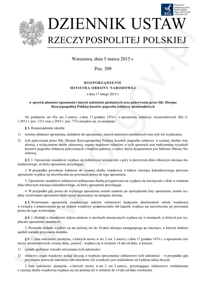Dokument podpisany przez Marek Głuch Data: 2015.03.05 14:03:04 CET l.g ov .pl DZIENNIK USTAW RZECZYPOSPOLITEJ POLSKIEJ Warszawa, dnia 5 marca 2015 r. Poz. 309 RO ZP O R ZĄ D ZE N I E M INI S TR A O B R O N Y NA RO DO W EJ z dnia 17 lutego 2015 r. w sprawie płatności uposażenia i innych należności pieniężnych oraz pokrywania przez Siły Zbrojne Rzeczypospolitej Polskiej kosztów pogrzebu żołnierzy niezawodowych Na podstawie art. 45a ust. 2 ustawy z dnia 17 grudnia 1974 r. o uposażeniu żołnierzy niezawodowych (Dz. U. z 2013 r. poz. 1211 oraz z 2014 r. poz. 773) zarządza się, co następuje: § 1. Rozporządzenie określa: terminy płatności uposażenia, dodatków do uposażenia i innych należności pieniężnych oraz tryb ich wypłacania; 2) tryb pokrywania przez Siły Zbrojne Rzeczypospolitej Polskiej kosztów pogrzebu żołnierzy w czynnej służbie wojskowej, z wyłączeniem służby okresowej, organy wojskowe właściwe w tych sprawach oraz maksymalną wysokość kosztów pogrzebu żołnierza pokrywanych z budżetu państwa z części, której dysponentem jest Minister Obrony Narodowej. w. rc 1) § 2. 1. Uposażenie zasadnicze wypłaca się żołnierzowi miesięcznie z góry w pierwszym dniu roboczym miesiąca kalendarzowego, za który uposażenie przysługuje. 2. W przypadku powołania żołnierza do czynnej służby wojskowej w trakcie miesiąca kalendarzowego pierwsze uposażenie wypłaca się niezwłocznie po powstaniu prawa do tego uposażenia. 3. Uposażenie zasadnicze żołnierzowi pełniącemu służbę przygotowawczą wypłaca się miesięcznie z dołu w ostatnim dniu roboczym miesiąca kalendarzowego, za który uposażenie przysługuje. 4. W przypadku gdy prawo do wyższego uposażenia zostało ustalone po sporządzeniu listy uposażenia, termin wypłaty wyrównania uposażenia może zostać przesunięty na następny miesiąc. § 3. Wyrównanie uposażenia zasadniczego należne żołnierzowi będącemu absolwentem szkoły wojskowej w związku z mianowaniem go na stopień wojskowy podporucznika lub kaprala wypłaca się niezwłocznie po powstaniu prawa do tego wyrównania. ww § 4. 1. Dodatki o charakterze stałym ustalone w stawkach miesięcznych wypłaca się w terminach, w których jest wypłacane uposażenie zasadnicze. 2. Pozostałe dodatki wypłaca się nie później niż do 10 dnia miesiąca następującego po miesiącu, w którym żołnierz spełnił warunki przyznania dodatku. § 5. 1. Inne należności pieniężne, o których mowa w art. 2 ust. 2 ustawy z dnia 17 grudnia 1974 r. o uposażeniu żołnierzy niezawodowych, zwanej dalej „ustawą”, wypłaca się w terminie 14 dni od dnia, w którym: 1) zostały spełnione warunki otrzymania tych należności; 2) właściwy organ wojskowy podjął decyzję o wypłacie (przyznaniu) żołnierzowi tych należności – w przypadku gdy przyznanie prawa do należności lub określenie ich wysokości jest uzależnione od wydania takiej decyzji. 2. Inne należności pieniężne, o których mowa w art. 2 ust. 2 ustawy, przysługujące żołnierzowi zwalnianemu z czynnej służby wojskowej wypłaca się nie później niż w terminie do 14 dni od dnia zwolnienia. Dziennik Ustaw –2– Poz. 309 l.g ov .pl § 6. 1. Uposażenie oraz inne należności pieniężne wypłaca się zgodnie z wyborem żołnierza bezpośrednio żołnierzowi w kasie (punkcie kasowym) jednostki wojskowej albo w formie bezgotówkowej na rachunek bankowy (konto osobiste) lub rachunek prowadzony przez spółdzielczą kasę oszczędnościowo-kredytową wskazany na piśmie przez tego żołnierza. 2. Na pisemny wniosek żołnierza dowódca jednostki wojskowej wypłacającej należności, o których mowa w ust. 1, może wyrazić zgodę na wypłatę tych należności w formie przekazu pieniężnego przesyłanego na adres wskazany przez żołnierza. 3. Żołnierzowi, który nie wskazał rachunku bankowego (konta osobistego) lub rachunku prowadzonego przez spółdzielczą kasę oszczędnościowo-kredytową, należności wymienione w ust. 1 wypłaca się w formie przekazu pieniężnego przesyłanego na adres wskazany na piśmie przez żołnierza. § 7. 1. Odprawę, o której mowa w art. 32 i art. 34a ust. 3 ustawy, wypłaca się w formie bezgotówkowej lub w formie przekazu pieniężnego na rachunek bankowy (konto osobiste) lub rachunek prowadzony przez spółdzielczą kasę oszczędnościowo-kredytową albo w formie przekazu pieniężnego przesyłanego na adres wskazany na piśmie przez żołnierza. 2. Na wniosek żołnierza dowódca jednostki wojskowej wypłacającej odprawę, o której mowa w ust. 1, może podjąć decyzję o wypłacie tej należności bezpośrednio żołnierzowi w kasie (punkcie kasowym) jednostki wojskowej. § 8. 1. Koszty pogrzebu żołnierza pokrywa się, na wniosek rodziny zmarłego, przez zorganizowanie pogrzebu albo zwrot kosztów pogrzebu. 2. Na koszty pogrzebu żołnierza składają się w szczególności wydatki dotyczące: 1) zakupu miejsca pochowania na cmentarzu, trumny lub urny i kremacji zwłok oraz wybudowania nagrobka – w miejscowości wskazanej przez rodzinę lub, jeżeli zmarły nie pozostawił rodziny, w miejscowości, w której zmarły pełnił służbę lub zamieszkiwał; 2) zorganizowania pogrzebu i przeprowadzenia pochówku zmarłego – stosownie do warunków i ceremoniału pogrzebowego przyjętego w miejscu organizowania pochówku; 3) zakupu wieńców lub kwiatów; 4) ogłoszenia nekrologu w prasie. w. rc 3. Dowódca jednostki wojskowej, w której żołnierz odbywał ostatnio służbę wojskową, organizuje pogrzeb i pokrywa jego koszty do wysokości 5-krotnej kwoty najniższego uposażenia zasadniczego żołnierza zawodowego obowiązującej w dniu śmierci żołnierza. 4. Niezależnie od wysokości kosztów pogrzebu, o których mowa w ust. 3, dowódca jednostki wojskowej, w której żołnierz odbywał ostatnio służbę wojskową, pokrywa koszty związane z przewozem zwłok do miejscowości, w której zm