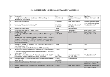 PROGRAM OBCHODÓW 110-LECIA NADANIA PUŁAWOM PRAW MIEJSKICH Lp. 1. 2. Wydarzenie II edycja konkursu literacko-plastyczno-multimedialnego pt. „Kocham Cię, Miasto moje…” Recital Danuty Błażejczyk 3. Wystawa „Puławy czasów minionych” 4. 5. 6. 7. 8. 9. 10. 11. 11.1 Data kwiecień-maj 25 kwietnia Miejsce Publiczne Gimnazjum nr 1 POK „Dom Chemika” 28 kwietnia – 19 czerwca Mazovia MTB Marathon 1 maja Uroczystości patriotyczne z okazji 3 Maja 3 maja MAJÓWKA NA 110! 3 maja Inauguracja obchodów 110. rocznicy nadania Puławom praw 13.00-15.00 miejskich W programie m.in. otwarcie wystawy „To nasze Puławy”, wspólna fotografia mieszkańców na 110-lecie fotografia mieszkańców, tort jubileuszowy, warsztaty, animacje i prezentacja, a także liczne konkursy z nagrodami. Bootcamp Puławy – Puławski Park Naukowo-Technologiczny 7 maja oczami studentów SGH Prezentacja możliwości technologicznych PPNT – streaming „Puławy w UE- dni otwarte funduszy europejskich” - cykl wykładów 12 maja o Unii Europejskiej dla młodzieży oraz osób dorosłych – w ramach uniwersytetu PPNT „Do Ciebie wołam Człowieku…“ - koncert poezji Karola Wojtyły 18 maja, w wykonaniu aktorów Puławskiego Teatru Amatorów godz. 21.37 Mecz piłki nożnej KS Azoty (piłkarze ręczni) – amatorzy (byli piłkarze 25 maja Wisły Puławy) godz. 16.00 Festiwal im. Wincentego i Franciszka Lesslów 27-28 maja POK „Dom Chemika” hol dolny Marina Puławy Włostowice plac F. Chopina Koncert inauguracyjny Festiwalu im. Wincentego i Franciszka 27 maja Lesslów POK „Dom Chemika” Organizator Publiczne Gimnazjum nr 1 I Liceum Ogólnokształcące im. ks. A.J. Czartoryskiego POK „Dom Chemika” Urząd Miasta Puławy Urząd Miasta Puławy POK „Dom Chemika” PPNT PPNT PPNT PPNT skwer przy pomniku św. Jana Pawła II stadion MOSiR POK „Dom Chemika” Fundacja im. Wincentego i Franciszka Lesslów Fundacja im. Wincentego i Franciszka Lesslów 11.2 12. 13. 14. 14.1 14.2 14.3 14.4 14.5 14.6 14.7 15. 16. 1050 lat państwa polskiego. 110 lat miasta Puławy Koncert. Kompilacja elementów słownych, muzycznych i multimedialnych prezentująca historię Ziemi Puławskiej na przestrzeni minionego tysiąclecia. Rajd stulecia, gra miejska „Śladami rodu Czartoryskich – odkrywamy historię stuletniego I Liceum Ogólnokształcącego im. ks. A.J. Czartoryskiego w Puławach” Konkurs literacko plastyczny „Puławy – moje miasto” z wystawą i publikacja pokonkursową 3-5 czerwca – kulminacja Dni Puław „Tańczące Puławy” – zaproszenie mieszkańców do wspólnego poloneza i niespodzianki tanecznej Dzień małego chemika – impreza dla mieszkańców Puław (koncert – łączymy pokolenia – De Mono) Prezentacja form POK „Dom Chemika” i zaproszonych przez „Dom Chemika” gości, animacje dla dzieci, atrakcje dla rodzin. Festiwal GODEL Międzynarodowy Festiwal Wushu XIII Grand International Festiwal pod patronatem honorowym Ambasadora Chińskiej Republiki Ludowej Olimpiada Przedszkolaka połączona ze Spartakiadą Rodzinną 28 maja Czarodziejski flet – opera plenerowa przygotowana specjalnie z okazji 110-lecia miasta w ramach Festiwalu im. Wincentego i Franciszka Lesslów Iluminacja Pałacu Czartoryskich Dni otwarte w Centralnej Bibliotece Rolniczej pod hasłem: „110 i więcej książek o Puławach” połączone z pokazem ręcznego oprawiania książki Quest historyczny „W poszukiwaniu dawnych Puław” – powiązany ze zwiedzaniem i poznawaniem Puław z lat 1906-1939 kierowany do młodzieży szkolnej Wystawa dzieci biorących udział w lekcjach w Puławskiej Galerii Sztuki „Puławy od przeszłości do przyszłości” POK „Dom Chemika” Fundacja im. Wincentego i Franciszka Lesslów maj I Liceum Ogólnokształcące im. ks. A.J. Czartoryskiego maj - wrzesień Biblioteka Miejska 3 czerwca, godz. 12.00 3 czerwca plac. F. Chopina POK „Dom Chemika” PPNT PPNT 4 czerwca dziedziniec Pałacu Czartoryskich POK „Dom Chemika” 4 czerwca stadion MOSiR MOSiR 5 czerwca stadion MOSiR 5 czerwca dziedziniec Pałacu Czartoryskich Miejskie Przedszkole nr 10 MOSiR Fundacja im. Wincentego i Franciszka Lesslów 4-5 czerwca siedziba Centralnej Biblioteki Rolniczej Centralna Biblioteka Rolnicza 6-8 czerwca 9 czerwca (wernisaż) POK „Dom Chemika” POK „Dom Chemika” POK „Dom Chemika” 17. 18. „Jerzy Szczygieł - puławianin i literat” 16 czerwca, godz. Wieczór wspomnień poświęcony życiu i twórczości pisarza 18.00 „Przegląd NGO – 110 lat działalności społecznej w Puławach” – 18-19 czerwca panel dyskusyjny, warsztaty, piknik, wystawa Biblioteka Miejska Biblioteka Miejska Puławska Rada Działalności Pożytku Publicznego 19. Miejskie Święto Patrona - m.in.: rozstrzygnięcie konkursu czerwiec plastycznego i konkursu poetyckiego pod hasłem „Trzeba dobrym być jak chleb”, uroczysta Msza Święta Odpustowa Starostwo Powiatowe, dziedziniec Pałacu Czartoryskich POK „Dom Chemika” i Parafia św. Brata Alberta 20. Otwarcie wystawy „100 lat I LO 1916-2016” czerwiec plac F. Chopina 21. Kino Samochodowe 22-24 lipca PPNT 22. Bieg Szlak Trafi 6 sierpnia Parchatka 23. 24. Wystawa poświęcona marszałkowi Józefowi Piłsudskiemu 15 sierpnia połączona ze wspólnym śpiewaniem pieśni patriotycznych XXV Wakacyjny Festiwal Piosenki dla dzieci i młodzieży sierpień 25. Festyn na zakończenie lata 28 sierpnia 26. Przystanek: Biblioteka Interaktywny piknik rodzinny z grami, quizami, konkursami Otwarcie wystawy „Domek Grecki – wczoraj i dziś” Konkurs fotograficzny: „Biblioteka na przystanku” Samochodowy Rajd Nadwiślański 4 września godz. 14.00 27. 16-18 września Katolickie Stowarzyszenie Młodzieży „Miłość”, Stowarzyszenie na Rzecz Wspierania Edukacji, Kultury i Sportu „Wspólnie”, Parafia św. Brata Alberta, POK „Dom Chemika” I Liceum Ogólnokształcące im. ks. A. J. Czartoryskiego PPNT UM Puławy Fundacja Ruszaj Na Szlak Centraln