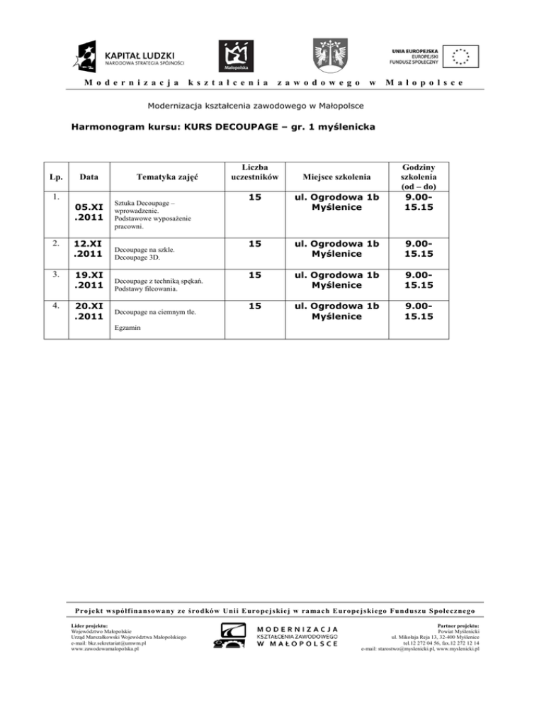 M o dern iza cj a ks zt a ł ce nia za w o do w eg o w M a ło po ls ce Modernizacja kształcenia zawodowego w Małopolsce Harmonogram kursu: KURS DECOUPAGE – gr. 1 myślenicka Lp. Data 1. 05.XI .2011 Tematyka zajęć Sztuka Decoupage – wprowadzenie. Podstawowe wyposażenie pracowni. 2. 12.XI .2011 Decoupage na szkle. Decoupage 3D. 3. 19.XI .2011 Decoupage z techniką spękań. Podstawy filcowania. 4. 20.XI .2011 Decoupage na ciemnym tle. Liczba uczestników 15 ul. Ogrodowa 1b Myślenice Godziny szkolenia (od – do) 9.0015.15 15 ul. Ogrodowa 1b Myślenice 9.0015.15 15 ul. Ogrodowa 1b Myślenice 9.0015.15 15 ul. Ogrodowa 1b Myślenice 9.0015.15 Miejsce szkolenia Egzamin P ro je kt ws półf i na nsowa ny z e śro d kó w Un ii E uro pe j s ki e j w ra ma c h E uro pe j s ki ego Fu nd u sz u S połe cz nego Lider projektu: Województwo Małopolskie Urząd Marszałkowski Województwa Małopolskiego e-mail: [email protected] www.zawodowamalopolska.pl Partner projektu: Powiat Myślenicki ul. Mikołaja Reja 13, 32-400 Myślenice tel.12 272 04 56, fax.12 272 12 14 e-mail: [email protected], www.myslenicki.pl