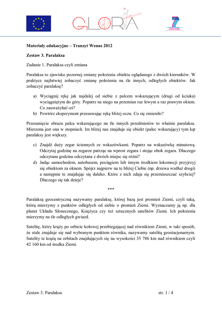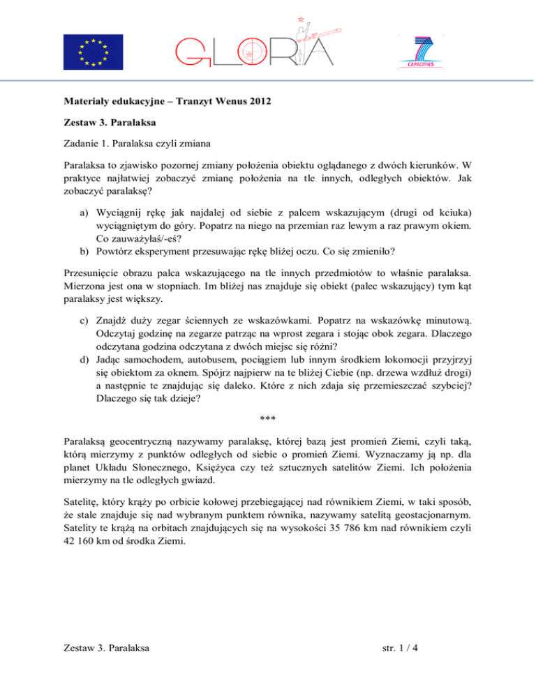 Materiały edukacyjne – Tranzyt Wenus 2012 Zestaw 3. Paralaksa Zadanie 1. Paralaksa czyli zmiana Paralaksa to zjawisko pozornej zmiany położenia obiektu oglądanego z dwóch kierunków. W praktyce najłatwiej zobaczyć zmianę położenia na tle innych, odległych obiektów. Jak zobaczyć paralaksę? a) Wyciągnij rękę jak najdalej od siebie z palcem wskazującym (drugi od kciuka) wyciągniętym do góry. Popatrz na niego na przemian raz lewym a raz prawym okiem. Co zauważyłaś/-eś? b) Powtórz eksperyment przesuwając rękę bliżej oczu. Co się zmieniło? Przesunięcie obrazu palca wskazującego na tle innych przedmiotów to właśnie paralaksa. Mierzona jest ona w stopniach. Im bliżej nas znajduje się obiekt (palec wskazujący) tym kąt paralaksy jest większy. c) Znajdź duży zegar ściennych ze wskazówkami. Popatrz na wskazówkę minutową. Odczytaj godzinę na zegarze patrząc na wprost zegara i stojąc obok zegara. Dlaczego odczytana godzina odczytana z dwóch miejsc się różni? d) Jadąc samochodem, autobusem, pociągiem lub innym środkiem lokomocji przyjrzyj się obiektom za oknem. Spójrz najpierw na te bliżej Ciebie (np. drzewa wzdłuż drogi) a następnie te znajdując się daleko. Które z nich zdaja się przemieszczać szybciej? Dlaczego się tak dzieje? *** Paralaksą geocentryczną nazywamy paralaksę, której bazą jest promień Ziemi, czyli taką, którą mierzymy z punktów odległych od siebie o promień Ziemi. Wyznaczamy ją np. dla planet Układu Słonecznego, Księżyca czy też sztucznych satelitów Ziemi. Ich położenia mierzymy na tle odległych gwiazd. Satelitę, który krąży po orbicie kołowej przebiegającej nad równikiem Ziemi, w taki sposób, że stale znajduje się nad wybranym punktem równika, nazywamy satelitą geostacjonarnym. Satelity te krążą na orbitach znajdujących się na wysokości 35 786 km nad równikiem czyli 42 160 km od środka Ziemi. Zestaw 3. Paralaksa str. 1 / 4 Zadanie 2. Satelita geostacjonarny a) Oblicz kąt paralaksy dla satelity geostacjonarnego. Podpowiedź: Oblicz kąt ASB na Rysunku 1. Skorzystaj ze wzoru na paralaksę π΄΄ = 206265 R/D gdzie R to baza, czyli promień Ziemi, a D odległość obiektu, którego paralaksę wyznaczamy od środka Ziemi. W ten sposób obliczysz paralaksę mierzoną w sekundach łuku. W celu wyrażenia tego małego kąta w radianach zastosuj wzór π = R/D (1 radian to około 206265 sekund łuku). Rysunek 1. Paralaksa geocentryczna satelity geostacjonarnego. Trójkąt ABZ jest trójkątem równobocznym o promieniu równym promieniowi Ziemi. *** Paralaksa geocentryczna jest wygodna do pomiarów odległości w Układzie Słonecznym. Jednak aby pomierzyć ją dla najbliższych Słońcu gwiazd, trzeba odwołać się do większej bazy niż promień Ziemi. Wtedy za bazę obieramy jedną jednostkę astronomiczną, czyli średnią odległość Ziemia – Słońce (149,6 mln km). Mierzymy wtedy położenie danej gwiazdy na tle odległych gwiazd (czyli nie wykazujących mierzalnej paralaksy) w dwóch momentach czasu, gdy Ziemia jest na przeciwnych miejscach na swojej orbicie. Otrzymujemy wtedy podwojony kąt paralaksy (2p). Jest on na tyle mały, że wyrażamy go w sekundach łuku. Kąt paralaksy oznaczamy tradycyjnie symbolem π΄΄. Zestaw 3. Paralaksa str. 2 / 4 Rysunek 2. Paralaksa heliocentryczna (p – kąt paralaksy). Zadanie 3. Paralaksa heliocentryczna – odległości do gwiazd Z pomocą podanej paralaksy heliocentrycznej oblicz odległości znanych pobliskich gwiazd w parsekach i latach świetlnych (w skrócie l.św.). Jeden parsek to odległość z jakiej jedną jednostkę astronomiczną (w skrócie j.a.) widać pod kątem jednej sekundy łuku, czyli odległość, z jakiej obiekt o średnicy równej średniej odległości Ziemi od Słońca miałby rozmiary jednej sekundy łuku na niebie. Jeden z obiektów jest „Gwiazdą X” wymyśloną przez autorów zadania. Podpowiedź: Ponieważ im dalej znajduje się gwiazda, tym mniejszy jej kąt paralaksy, skorzystaj z proporcji. Jeden rok świetlny to odległość, jaką światło pokonuje w ciągu roku (9,6 biliona kilometrów), a 1 parsek = 3,26 l.św. = 206 265 j.a. Gwiazda α Centauri Gwiazda Barnarda Syriusz Procjon Wega Arktur Aldebaran Kłos Gwiazda X Zestaw 3. Paralaksa π΄΄ 0,742 0,549 0,379 0,286 0,129 0,089 0,050 0,012 1,000 d [parseki] d [l.św.] str. 3 / 4 Zadanie 4. Kreda i tablica W klasie znajduje się jedna tablica i dwa rzędy ławek. W ramach doświadczenia jeden uczeń przytrzymuje ręką kredę (lub flamaster) na środku tablicy. Drugi uczeń trzyma w ręku kredę 1-2 metry przed tablicą w taki sposób, aby widział ją na tle kredy dotykającej środka tablicy. Uczniowie z prawego i lewego rzędu ławek obserwują obie kredy – ta dotykająca tablicy jest dla wszystkich widoczna na tle tego samego miejsca tablicy, a ta przed tablicą w różnych miejscach w zależności od położenia uczniów. Uczniowie rysują w przybliżeniu punkty na tablicy na tle których widzą kredę z ławek. W jaki sposób położenie narysowanych punktów względem środka tablicy zależy od: a) rzędu ławek i miejsca w ławce, b) odległości ławek od tablicy? Następnie uczniowie z pierwszych ławek (lewej i prawej) łączą nitką narysowane przez siebie punkty na tablicy z miejscami, z których patrzyli na kredę. Patrząc od strony uczniów, uczeń z lewej strony lewej ławki i uczeń z prawej strony prawej ławki zostają na swych miejscach przytrzymując końcówki dwóch sznurków. Dwóch pozostałych uczniów z pierwszych ławek chwyta za drugie końce nitek i przytrzymuje je (lub przykleja taśmą) na odpowiednich punktach narysowanych wcześniej na tablicy. Dwie nitki krzyżują się tam gdzie uczeń stojący 1-2 m przed tablicą trzymał kredę, która była punktem odniesienia. Uczniowie mierzą kątomierzem kąt U1KU2 = U2’KU1’ między krzyżującymi się nitkami (Rysunek 3) – ten kąt nazywamy kątem para