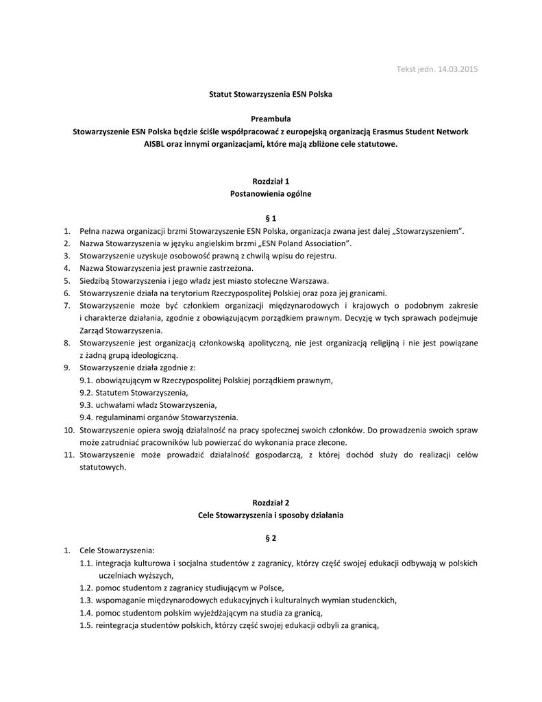 Tekst jedn. 14.03.2015 Statut Stowarzyszenia ESN Polska Preambuła Stowarzyszenie ESN Polska będzie ściśle współpracowad z europejską organizacją Erasmus Student Network AISBL oraz innymi organizacjami, które mają zbliżone cele statutowe. Rozdział 1 Postanowienia ogólne §1 1. Pełna nazwa organizacji brzmi Stowarzyszenie ESN Polska, organizacja zwana jest dalej „Stowarzyszeniem”. 2. Nazwa Stowarzyszenia w języku angielskim brzmi „ESN Poland Association”. 3. Stowarzyszenie uzyskuje osobowośd prawną z chwilą wpisu do rejestru. 4. Nazwa Stowarzyszenia jest prawnie zastrzeżona. 5. Siedzibą Stowarzyszenia i jego władz jest miasto stołeczne Warszawa. 6. Stowarzyszenie działa na terytorium Rzeczypospolitej Polskiej oraz poza jej granicami. 7. Stowarzyszenie może byd członkiem organizacji międzynarodowych i krajowych o podobnym zakresie i charakterze działania, zgodnie z obowiązującym porządkiem prawnym. Decyzję w tych sprawach podejmuje Zarząd Stowarzyszenia. 8. Stowarzyszenie jest organizacją członkowską apolityczną, nie jest organizacją religijną i nie jest powiązane z żadną grupą ideologiczną. 9. Stowarzyszenie działa zgodnie z: 9.1. obowiązującym w Rzeczypospolitej Polskiej porządkiem prawnym, 9.2. Statutem Stowarzyszenia, 9.3. uchwałami władz Stowarzyszenia, 9.4. regulaminami organów Stowarzyszenia. 10. Stowarzyszenie opiera swoją działalnośd na pracy społecznej swoich członków. Do prowadzenia swoich spraw może zatrudniad pracowników lub powierzad do wykonania prace zlecone. 11. Stowarzyszenie może prowadzid działalnośd gospodarczą, z której dochód służy do realizacji celów statutowych. Rozdział 2 Cele Stowarzyszenia i sposoby działania §2 1. Cele Stowarzyszenia: 1.1. integracja kulturowa i socjalna studentów z zagranicy, którzy częśd swojej edukacji odbywają w polskich uczelniach wyższych, 1.2. pomoc studentom z zagranicy studiującym w Polsce, 1.3. wspomaganie międzynarodowych edukacyjnych i kulturalnych wymian studenckich, 1.4. pomoc studentom polskim wyjeżdżającym na studia za granicą, 1.5. reintegracja studentów polskich, którzy częśd swojej edukacji odbyli za granicą, 1.6. tworzenie warunków dla lepszego zrozumienia różnych kultur, narodowości, tradycji pośród studentów wywodzących się z różnych kręgów kulturowych lub różnych nacji, 1.7. wspieranie organizacji studenckich o podobnych celach statutowych i działaniach, 1.8. promowanie Polski, polskiej kultury za granicą oraz wśród studentów zagranicznych studiujących w Polsce, 1.9. promowanie polskich uczelni wyższych jako miejsc atrakcyjnych pod względem poziomu i jakości kształcenia, 1.10. ścisła współpraca z organizacją Erasmus Student Network AISBL oraz prowadzenie działalności informacyjnej o tej organizacji, 1.11. promocja idei wolontariatu i praca na rzecz jego rozwoju, 1.12. podtrzymywanie tradycji narodowej, pielęgnowanie polskości oraz rozwój świadomości narodowej, obywatelskiej i kulturowej, 1.13. działalnośd wspomagająca technicznie, szkoleniowo, informacyjnie lub finansowo organizacje pozarządowe w wyżej wymienionej działalności, 1.14. działalnośd wspomagająca rozwój gospodarczy, w tym rozwój przedsiębiorczości, 1.15. działalnośd wspomagająca rozwój wspólnot i społeczności lokalnych, 1.16. nauka, edukacja, oświata i wychowanie, 1.17. krajoznawstwo oraz wypoczynek młodzieży i studentów, 1.18. kultura, sztuka, ochrona dóbr kultury i tradycji, 1.19. upowszechnianie kultury fizycznej i sportu, 1.20. upowszechnianie i ochrona wolności i praw człowieka oraz swobód obywatelskich, a także działania wspomagających rozwój demokracji, 1.21. działania na rzecz integracji europejskiej oraz rozwijania kontaktów i współpracy między społeczeostwami. §3 1. Stowarzyszenie realizuje swoje cele poprzez: 1.1. działalnośd oświatową: 1.1.1. organizacja szkoleo i konferencji na szczeblu lokalnym, krajowym i międzynarodowym, 1.1.2. udzielanie konsultacji, 1.1.3. przygotowywanie akcji promocyjnych, 1.2. działalnośd naukową: 1.2.1. udzielanie rzetelnej informacji o możliwościach studiowania oraz finansowania studiów za granicą, 1.2.2. organizacja kursów językowych, 1.3. działalnośd kulturalną: 1.3.1. organizacja oraz wspieranie akcji, a także wyjazdów promujących polską kulturę na terenie kraju i za granicą, 1.3.2. wspieranie oraz koordynowanie projektów, które mają zwiększyd zainteresowanie Polską oraz kulturą, 1.3.3. organizacja imprez promujących kulturę innych krajów, 1.3.4. organizacja wymian studenckich i młodzieżowych, 1.4. współpracę z Erasmus Student Network AISBL oraz innymi organizacjami krajowymi i międzynarodowymi o podobnych celach statutowych, 1.5. współpracę z organizacjami studenckimi w Polsce, 1.6. zorganizowanie i prowadzenie biura. Rozdział 3 Członkowie – prawa i obowiązki §4 Członkami Stowarzyszenia mogą bydosoby fizyczne i prawne. Osoba prawna może byd jedynie członkiem wspierającym Stowarzyszenia. §5 1. 1. 2. 3. 4. 5. 6. 1. 2. 3. 4. Stowarzyszenie składa się z członków: 1.1. zwyczajnych, 1.2. wspierających, 1.3. honorowych. §6 Członkami zwyczajnymi Stowarzyszenia mogą byd studenci oraz absolwenci uczelni wyższych znajdujących się na terytorium Rzeczypospolitej Polskiej. Członkiem zwyczajnym staje się po złożeniu pisemnej deklaracji, na podstawie uchwały Zarządu Stowarzyszenia. Wzór deklaracji zatwierdza Zarząd Stowarzyszenia. Członkiem wspierającym może byd osoba fizyczna lub prawna, zainteresowana działalnością Stowarzyszenia, która deklaruje wsparcie merytoryczne, rzeczowe lub finansowe na rzecz Stowarzyszenia. Członkiem wspierającym staje się po złożeniu pisemnej deklaracji, na podstawie uchwały Zarządu Stowarzyszenia. Wzór deklaracji zatwierdza Zarząd Stowarzyszenia.Członek zwyczajny staje się członkiem wspierającym na swój wniosek na podstawie uchwały Zarządu St