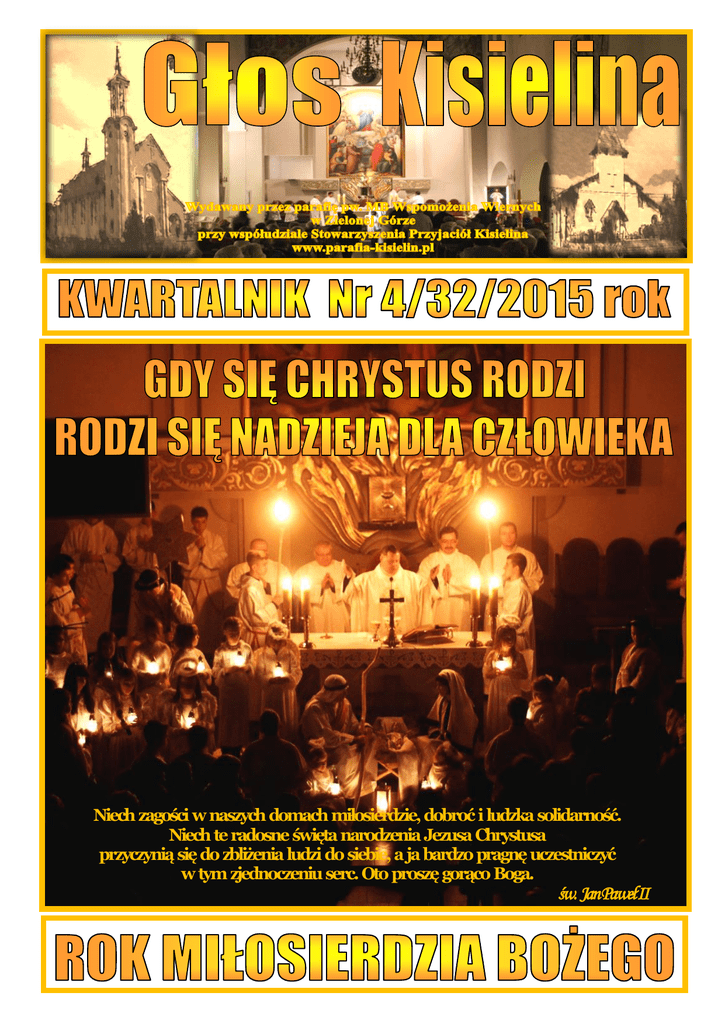Niech zagości w naszych domach miłosierdzie, dobroć i ludzka solidarność. Niech te radosne święta narodzenia Jezusa Chrystusa przyczynią się do zbliżenia ludzi do siebie, a ja bardzo pragnę uczestniczyć w tym zjednoczeniu serc. Oto proszę gorąco Boga. św. JanPawełII 1 STOPKA REDAKCYJNA Redaktor naczelny: ks. kan. dr Andrzej Brenk. Z-ca redaktora naczelnego, korekta: mgr Weronika Chowaniec. Projekt okładki: ks. A. Brenk. Skład redakcji: Władysław Szymerowski, Robert Skulski, Mikołaj Rosik, Joanna Malinowska, Marysia Mędryk, Nina Sługocka, Gabrysia Połubińska, Małgorzata Kasperska. Druk: ALL-SERVICE, Zielona Góra, ul. Gen. J. Dąbrowskiego 63/9; www.druk.zgora.pl; Adres redakcji: Parafia rzymskokatolicka pw. M. B. Wspomożenia Wiernych, ul. Stary Kisielin - św. Floriana 2,66-002 ZIELONA GÓRA. Tel.: 068-329 93 63.Nr konta: I Oddział PKO Zielona Góra 75 1020 5402 0000 0002 0129 8025. E-mail: [email protected]; Redakcja zastrzega sobie prawo do redagowania i skracania tekstów. Wszystkie zdjęcia zamieszczone w niniejszym numerze „Głosu Kisielina” pochodzą z archiwum parafii w Starym Kisielinie. Autorzy zdjęć: ks. Andrzej Brenk, Władysław Szymerowski, Gabrysia Połubińska, Małgorzata Kasperska. Niniejszy numer „Głosu Kisielina” jest dofinansowany przez: DR.HAB.WALDEMARA SŁUGOCKIEGO SENATORA RP i URZĄD MIASTA ZIELONA GÓRA. 2 Drodzy Mieszkańcy Nowego i Starego Kisielina Jezusa Chrystusa Syna Bożego – CZŁOWIEKA. Te wartości nie podjęte przez człowieka w swoim życiu sprawią, że człowiek, wierny zewnętrznemu kalendarzowi, może stać się po prostu nieludzki, niszcząc przy tym samego siebie i ludzi stojących obok niego. Czas przeżywany wewnętrznie z Jezusem Chrystusem daje nam możność kontrolowania siebie (codzienny rachunek sumienia) i pozwala po ludzku żyć, a także umożliwia spotkanie ze swoim sumieniem i postawieniem sobie pytań o dobro i zło, o granicę, której nie wolno przekroczyć. Czas wewnętrzny daje człowiekowi możność spotkania z ŻYWYM BOGIEM w ciszy własnego serca, podczas MODLITWY, SPOWIEDZI ŚWIĘTEJ i EUCHARYSTII. Ludzie współcześni nie twierdzą, że Boga nie ma. Oni tylko mówią, że nie mają czasu i nie mają BOGU tak naprawdę nic do powiedzenia. Tak bardzo się wychylił się dzisiejszy człowiek poza siebie, że w tym wszystkim zapomniał o swoich najważniejszych sprawach. Dlatego nie mamy czasu dzisiaj na samodzielne i twórcze myślenie. Chyba czas coś z tym zrobić, żeby nie było za późno. Podzielmy nasz czas sprawiedliwie, który jest przecież prezentem od BOGA: dla siebie, aby mieć czas dla najbliższych, dla pracy i dla BOGA. Wtedy dopiero naprawdę wypełnimy nasz czas Bożym planem danym nam tylko raz w naszym życiu. To właśnie po to, by ustrzec się naiwnych pomysłów na dorosłe życie, warto w tej sprawie słuchać bardziej Boga niż ludzi i niż samego siebie. Bóg naprawdę pomaga nam znaleźć szczęście prawdziwe, a nie chwilowe szczęście, pozorne. Bóg proponuje nam – jak Maryi – wielkie rzeczy. W oczach Boga nikt z nas nie jest człowiekiem drugiej kategorii, ani kimś powołanym do jakiegoś mniejszego szczęścia. Drogą do szczęścia jest odkrycie, że Bóg powołuje nas najpierw do bycia człowiekiem i chrześcijaninem. Zwierzęta mogą być zadowolone, spokojne i najedzone, ale jedynie człowiek może być szczęśliwym. Kto nie odróżnia siebie od zwierząt, ten nie odróżnia szczęścia od chwilowej przyjemności, która nikomu z ludzi do szczęścia nie wystarczy. Naszym powołaniem jest stawanie się chrześcijaninem, czyli kimś coraz K ończący się rok 2015 zmusza nas wszystkich do podjęcia refleksji i wierzących i niewierzących. Zabiegany dzisiejszy człowiek przeżywa swój czas przez kolejne daty z kalendarza, ciągle goniąc. Bowiem czas kojarzy mu się z terminami, które go poganiają, z planami, które trzeba wykonać, z ratami, które trzeba spłacić, z latami, które trzeba przetrwać itp.. W ten sposób rzeczy i zjawiska wzrosły w cenę i ciągle drożeją, a w tym wszystkim sam człowiek zmalał. Jego duchowy profil stracił na dzisiejszej giełdzie życia. A stało się to dlatego, że człowiek zbyt mocno wychylił się poza siebie tracąc siebie. Za mało dzisiaj człowiek uwzględnia fakt, że czas płynie nie tylko przez terminy, ale także przez wewnętrzne życie człowieka, przez jego serce. Upływający nieubłagalnie czas może wyzwalać w człowieku siły i wartości, dzięki którym staje się on bardziej ludzki i podobny do przychodzącego do nas do naszego życia 3 GŁOS KISIELINA - KWARTALNIK PARAFII pw. MB WSPOMOŻENIA WIERNYCH bardziej podobnym do Jezusa, coraz bardziej świętym i kochającym tak, jak On pierwszy nas pokochał. Dzięki Chrystusowi chrześcijanin nie musi uczyć się miłości po omacku, ani w oparciu o najgorszą z metod, jaką jest metoda prób i błędów. Bo naprawdę żyć chce się tylko tym, którzy naprawdę kochają. Czas Bożego Narodzenia to nie tylko Wigilia i łamanie się opłatkiem, to nie tylko PASTERKA i DWA DNI ŚWIĄT. To dotarcie do Betlejem i prawdziwe spotkanie z Nowonarodzonym, tak jak to uczyniła Maryja i Józef, przebyli długą i ciężką drogę, aby później, nie zważając na otaczającą rzeczywistość, przyjąć PRAWDZIWĄ RADOŚĆ. Jezus Chrystus narodzony w Betlejem wyciąga do człowieka swoje ręce i oczekuje od nas tylko jednego, byśmy przez wiarę otworzyli mu drzwi naszych serc i przyjęli dar życia wiecznego, który nam w Nim ofiaruje Nieskończenie Miłosierny Bóg Ojciec. Życzę, by ten świąteczny czas Nr 4/32/2015 pomógł nam w skierowaniu wzroku ku Jezusowi Chrystusowi. Patrząc na Niego - Boga, który stał się człowiekiem - wciąż na nowo, abyśmy uświadomili sobie, jak cenny w oczach Boga jest każdy człowiek, i jak niezwykła jest Boża miłość, która wzywa nas do uczestnictwa w życiu samego Boga. Niech ten czas łaski, jaki