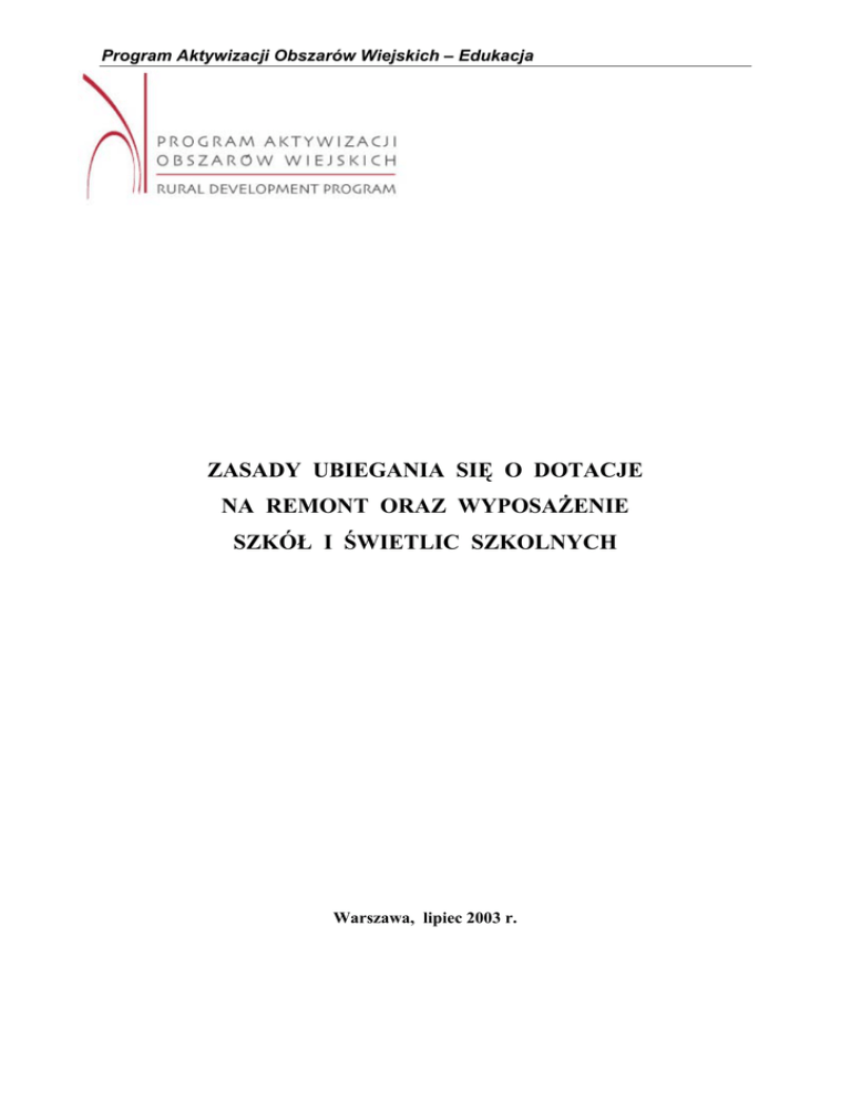 Program Aktywizacji Obszarów Wiejskich – Edukacja ZASADY UBIEGANIA SIĘ O DOTACJE NA REMONT ORAZ WYPOSAŻENIE SZKÓŁ I ŚWIETLIC SZKOLNYCH Warszawa, lipiec 2003 r. I. PODSTAWA PRAWNA 1. Umowa kredytowa pomiędzy Rzeczpospolitą Polską a Międzynarodowym Bankiem Odbudowy i Rozwoju z dnia 25 lipca 2000 r. Nr 7013 POL; 2. Porozumienie pomiędzy Ministrem Rolnictwa i Rozwoju Wsi, Przewodniczącym Krajowego Komitetu Sterującego a Ministrem Edukacji Narodowej w sprawie koordynacji wdrażania podkomponentu Edukacja, Programu Aktywizacji Obszarów Wiejskich; 3. Porozumienia o przyznaniu środków oraz o warunkach i sposobie realizacji Programu Aktywizacji Obszarów Wiejskich pomiędzy Ministrem Rolnictwa i Rozwoju Wsi, Przewodniczącym Krajowego Komitetu Sterującego a poszczególnymi Województwami; 4. Uchwała Krajowego Komitetu Sterującego nr 4/2003 z dnia 20 maja 2003 r. w sprawie częściowego rozdysponowania rezerwy Programu. II. FORMA DOFINANSOWANIA Dotacje. III. PRZEDMIOT DOFINANSOWANIA Zgodnie z uchwałą nr 4/2003 Krajowego Komitetu Sterującego z dnia 21 marca 2003, środki przyznane województwom z rezerwy PAOW mogą być wykorzystane na: i. ii. remonty szkół 1 , ze szczególnym uwzględnieniem oddziałów dla 6-latków, tzw. zerówek, w tym ich wyposażenia 2 , remonty i wyposażenie świetlic w ramach konsolidacji sieci szkolnych. Nie dopuszcza się wykorzystywania dotacji PAOW na zadania wymagające pozwolenia budowlanego jak budowa czy rozbudowa budynku szkolnego ani też na zadania realizowane w ramach już posiadanego pozwolenia budowlanego jak np. prace wykończeniowe. IV. PODZIAŁ ŚRODKÓW NA ZADANIA Na poziomie województwa decyzje o podziale środków na zadania objęte dofinansowaniem z PAOW podejmuje Regionalny Komitet Sterujący. RKS uchwala listę rankingową wniosków złożonych przez gminy/powiaty, w oparciu o uchwalone kryteria ich oceny. V. ZAKRES TERYTORIALNY Dotowanie z PAOW remontów i wyposażenia szkół i świetlic szkolnych ma miejsce we wszystkich województwach, stosownie do wysokości środków znajdujących się w ich dyspozycji. 1 - Dotyczy szkół podstawowych i gimnazjów oraz szkół specjalnych, ale tylko na obszarach wiejskich. Nie dotyczy szkół w miastach, niezależnie od liczby mieszkańców miasta. 2 - Wyposażenie może być kupowane tylko dla klas „zerowych” i świetlic szkolnych. Obejmuje ono: a) meble, kopiarki i pozostały sprzęt za wyjątkiem sprzętu audiowizualnego i komputerów, b) gry i pomoce edukacyjne. Wszystkie wyroby powinny mieć stosowne atesty i certyfikaty. 2 VI. UPRAWNIENI DO UBIEGANIA SIĘ O DOTACJE Uprawnionymi do ubiegania się o dotacje na remonty i wyposażenie szkół i świetlic szkolnych są niżej wymienione jednostki samorządu terytorialnego: a. Gminy wiejskie b. Gminy wiejsko-miejskie, z wyłączeniem zadań w szkołach miejskich 3 c. Powiaty (tylko w przypadku szkół specjalnych), z wyłączeniem zadań w szkołach miejskich 4 Wszystkie wyżej wymienione podmioty określa się w dalszej części „Zasad...” mianem wnioskodawcy, a po uzyskaniu dotacji mianem beneficjenta. VII. TERMIN REALIZACJI Realizacja zadań powinna zostać zakończona do 31 grudnia 2004 roku. VIII. WYSOKOŚĆ DOTACJI Wysokość dotacji do remontów budynków szkolnych oraz wyposażenia klas zerowych, a także remontów i wyposażenia świetlic (pomieszczeń socjalnych dla uczniów) ze środków PAOW może wynieść maksymalnie 42% wartości całkowitej. IX. NIE FINANSOWANE Z PAOW Z dotacji PAOW nie mogą być pokrywane żadne podatki ani opłaty celne oraz koszty prac wstępnych, przygotowawczych i obsługi przedsięwzięcia jak wykonanie dokumentacji technicznej i geodezyjnej, zatrudnienie inspektora nadzoru, przygotowanie dokumentacji przetargowej. X. ŹRÓDŁA FINANSOWANIA Wnioskodawca jest zobowiązany do udokumentowania posiadanych lub przyrzeczonych funduszy, które łącznie z dotacją PAOW muszą stanowić 100 % wydatków przewidzianych na zrealizowanie zadań. Obok dotacji z PAOW mogą to być środki własne wnioskodawcy, dotacje z budżetu Państwa i inne. Wszystkie fundusze zgromadzone lub przewidziane do uzyskania na finansowanie zadań powinny być potwierdzone w formie pisemnych umów, uchwał, zobowiązań itp. XI. TRYB PRZYZNAWANIA DOTACJI 1. Terminy składania wniosków o dotację w poszczególnych województwach uchwalają i podają do publicznej wiadomości Regionalne Komitety Sterujące. 2. Jednostka Koordynacji Programu przekazuje Wojewódzkim Biurom Wdrażania Programu: a) formularz wniosku wraz z instrukcją wypełniania b)zasady ubiegania 3 4 - niezależnie od liczby mieszkańców miasta. - jak wyżej 3 się o dotację c) rekomendowane kryteria oceny wniosków. Dokumenty te zostają ponadto zamieszczone na stronie internetowej JKP: www.fapa.com.pl/jkp 3. Regionalne Komitety Sterujące, uwzględniając specyfikę swoich województw, uchwalają kryteria dopasowane do potrzeb regionalnych. Kryteria oceny przyjęte przez RKS muszą być znane wnioskodawcom (gminom/powiatom) przed składaniem wniosków. 4. Wojewódzkie Biura Wdrażania Programu dostarczają wszystkim uprawnionym gminom i powiatom: a) formularz wniosku wraz z instrukcją wypełniania b)zasady ubiegania się o dotację c) uchwalone przez Regionalny Komitet Sterujący i obowiązujące w województwie kryteria oceny wniosków. Dokumenty te zostają ponadto zamieszczone na stronach internetowych urzędów marszałkowskich. 5. Wojewódzkie Biura Wdrażania Programu przy wsparciu merytorycznym Jednostki Koordynacji Programu, udzielają gminom i powiatom niezbędnych informacji dla sporządzenia wniosków. 6. Gmina/powiat jest zobowiązana do przekazania wszystkim uprawnionym szkołom działającym na ich terenie, wyczerpujących informacji o możliwości ubiegania się o dotacje na remont i wyposażenie szkół i świetlic. 7. We współpracy ze szkołami, gmina/powiat dokonuje identyfikacji i kwalifikacji zadań do ubiegania się o dotację 