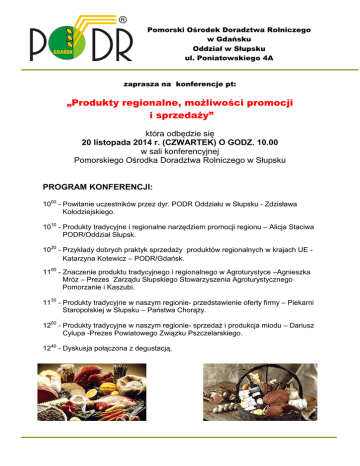 Pomorski Ośrodek Doradztwa Rolniczego w Gdańsku Oddział w Słupsku ul. Poniatowskiego 4A zaprasza na konferencje pt: „Produkty regionalne, możliwości promocji i sprzedaży” która odbędzie się 20 listopada 2014 r. (CZWARTEK) O GODZ. 10.00 w sali konferencyjnej Pomorskiego Ośrodka Doradztwa Rolniczego w Słupsku PROGRAM KONFERENCJI: 1000 - Powitanie uczestników przez dyr. PODR Oddziału w Słupsku - Zdzisława Kołodziejskiego. 1010 - Produkty tradycyjne i regionalne narzędziem promocji regionu – Alicja Staciwa PODR/Oddział Słupsk. 1020 - Przykłady dobrych praktyk sprzedaży produktów regionalnych w krajach UE Katarzyna Kotewicz – PODR/Gdańsk. 1100 - Znaczenie produktu tradycyjnego i regionalnego w Agroturystyce –Agnieszka Mróz – Prezes Zarządu Słupskiego Stowarzyszenia Agroturystycznego Pomorzanie i Kaszubi. 1135 - Produkty tradycyjne w naszym regionie- przedstawienie oferty firmy – Piekarni Staropolskiej w Słupsku – Państwa Chorąży. 1200 - Produkty tradycyjne w naszym regionie- sprzedaż i produkcja miodu – Dariusz Cylupa -Prezes Powiatowego Związku Pszczelarskiego. 1240 - Dyskusja połączona z degustacją.