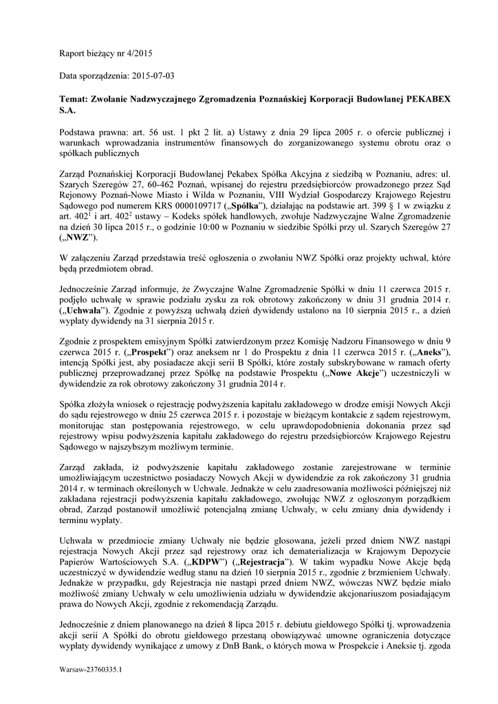 Raport bieżący nr 4/2015 Data sporządzenia: 2015-07-03 Temat: Zwołanie Nadzwyczajnego Zgromadzenia Poznańskiej Korporacji Budowlanej PEKABEX S.A. Podstawa prawna: art. 56 ust. 1 pkt 2 lit. a) Ustawy z dnia 29 lipca 2005 r. o ofercie publicznej i warunkach wprowadzania instrumentów finansowych do zorganizowanego systemu obrotu oraz o spółkach publicznych Zarząd Poznańskiej Korporacji Budowlanej Pekabex Spółka Akcyjna z siedzibą w Poznaniu, adres: ul. Szarych Szeregów 27, 60-462 Poznań, wpisanej do rejestru przedsiębiorców prowadzonego przez Sąd Rejonowy Poznań-Nowe Miasto i Wilda w Poznaniu, VIII Wydział Gospodarczy Krajowego Rejestru Sądowego pod numerem KRS 0000109717 („Spółka”), działając na podstawie art. 399 § 1 w związku z art. 4021 i art. 4022 ustawy – Kodeks spółek handlowych, zwołuje Nadzwyczajne Walne Zgromadzenie na dzień 30 lipca 2015 r., o godzinie 10:00 w Poznaniu w siedzibie Spółki przy ul. Szarych Szeregów 27 („NWZ”). W załączeniu Zarząd przedstawia treść ogłoszenia o zwołaniu NWZ Spółki oraz projekty uchwał, które będą przedmiotem obrad. Jednocześnie Zarząd informuje, że Zwyczajne Walne Zgromadzenie Spółki w dniu 11 czerwca 2015 r. podjęło uchwałę w sprawie podziału zysku za rok obrotowy zakończony w dniu 31 grudnia 2014 r. („Uchwała”). Zgodnie z powyższą uchwałą dzień dywidendy ustalono na 10 sierpnia 2015 r., a dzień wypłaty dywidendy na 31 sierpnia 2015 r. Zgodnie z prospektem emisyjnym Spółki zatwierdzonym przez Komisję Nadzoru Finansowego w dniu 9 czerwca 2015 r. („Prospekt”) oraz aneksem nr 1 do Prospektu z dnia 11 czerwca 2015 r. („Aneks”), intencją Spółki jest, aby posiadacze akcji serii B Spółki, które zostały subskrybowane w ramach oferty publicznej przeprowadzanej przez Spółkę na podstawie Prospektu („Nowe Akcje”) uczestniczyli w dywidendzie za rok obrotowy zakończony 31 grudnia 2014 r. Spółka złożyła wniosek o rejestrację podwyższenia kapitału zakładowego w drodze emisji Nowych Akcji do sądu rejestrowego w dniu 25 czerwca 2015 r. i pozostaje w bieżącym kontakcie z sądem rejestrowym, monitorując stan postępowania rejestrowego, w celu uprawdopodobnienia dokonania przez sąd rejestrowy wpisu podwyższenia kapitału zakładowego do rejestru przedsiębiorców Krajowego Rejestru Sądowego w najszybszym możliwym terminie. Zarząd zakłada, iż podwyższenie kapitału zakładowego zostanie zarejestrowane w terminie umożliwiającym uczestnictwo posiadaczy Nowych Akcji w dywidendzie za rok zakończony 31 grudnia 2014 r. w terminach określonych w Uchwale. Jednakże w celu zaadresowania możliwości późniejszej niż zakładana rejestracji podwyższenia kapitału zakładowego, zwołując NWZ z ogłoszonym porządkiem obrad, Zarząd postanowił umożliwić potencjalną zmianę Uchwały, w celu zmiany dnia dywidendy i terminu wypłaty. Uchwała w przedmiocie zmiany Uchwały nie będzie głosowana, jeżeli przed dniem NWZ nastąpi rejestracja Nowych Akcji przez sąd rejestrowy oraz ich dematerializacja w Krajowym Depozycie Papierów Wartościowych S.A. („KDPW”) („Rejestracja”). W takim wypadku Nowe Akcje będą uczestniczyć w dywidendzie według stanu na dzień 10 sierpnia 2015 r., zgodnie z brzmieniem Uchwały. Jednakże w przypadku, gdy Rejestracja nie nastąpi przed dniem NWZ, wówczas NWZ będzie miało możliwość zmiany Uchwały w celu umożliwienia udziału w dywidendzie akcjonariuszom posiadającym prawa do Nowych Akcji, zgodnie z rekomendacją Zarządu. Jednocześnie z dniem planowanego na dzień 8 lipca 2015 r. debiutu giełdowego Spółki tj. wprowadzenia akcji serii A Spółki do obrotu giełdowego przestaną obowiązywać umowne ograniczenia dotyczące wypłaty dywidendy wynikające z umowy z DnB Bank, o których mowa w Prospekcie i Aneksie tj. zgoda Warsaw-23760335.1 DnB Bank na wypłatę dywidendy nie będzie wymagana. PODPISY OSÓB REPREZENTUJĄCYCH SPÓŁKĘ 2015-07-03 Robert Jędrzejowski Prezes Zarządu 2015-07-03 Beata Żaczek Wiceprezes Zarządu Warsaw-23760335.1 2