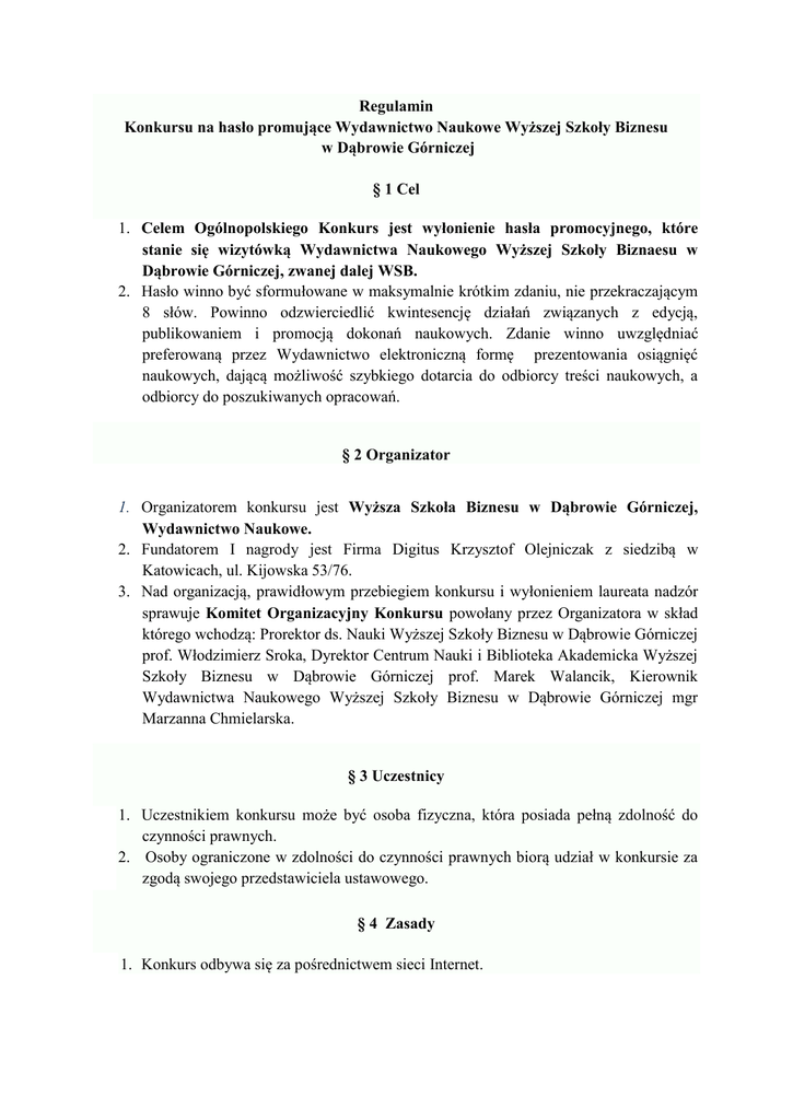 Regulamin Konkursu na hasło promujące Wydawnictwo Naukowe Wyższej Szkoły Biznesu w Dąbrowie Górniczej § 1 Cel 1. Celem Ogólnopolskiego Konkurs jest wyłonienie hasła promocyjnego, które stanie się wizytówką Wydawnictwa Naukowego Wyższej Szkoły Biznaesu w Dąbrowie Górniczej, zwanej dalej WSB. 2. Hasło winno być sformułowane w maksymalnie krótkim zdaniu, nie przekraczającym 8 słów. Powinno odzwierciedlić kwintesencję działań związanych z edycją, publikowaniem i promocją dokonań naukowych. Zdanie winno uwzględniać preferowaną przez Wydawnictwo elektroniczną formę prezentowania osiągnięć naukowych, dającą możliwość szybkiego dotarcia do odbiorcy treści naukowych, a odbiorcy do poszukiwanych opracowań. § 2 Organizator 1. Organizatorem konkursu jest Wyższa Szkoła Biznesu w Dąbrowie Górniczej, Wydawnictwo Naukowe. 2. Fundatorem I nagrody jest Firma Digitus Krzysztof Olejniczak z siedzibą w Katowicach, ul. Kijowska 53/76. 3. Nad organizacją, prawidłowym przebiegiem konkursu i wyłonieniem laureata nadzór sprawuje Komitet Organizacyjny Konkursu powołany przez Organizatora w skład którego wchodzą: Prorektor ds. Nauki Wyższej Szkoły Biznesu w Dąbrowie Górniczej prof. Włodzimierz Sroka, Dyrektor Centrum Nauki i Biblioteka Akademicka Wyższej Szkoły Biznesu w Dąbrowie Górniczej prof. Marek Walancik, Kierownik Wydawnictwa Naukowego Wyższej Szkoły Biznesu w Dąbrowie Górniczej mgr Marzanna Chmielarska. § 3 Uczestnicy 1. Uczestnikiem konkursu może być osoba fizyczna, która posiada pełną zdolność do czynności prawnych. 2. Osoby ograniczone w zdolności do czynności prawnych biorą udział w konkursie za zgodą swojego przedstawiciela ustawowego. § 4 Zasady 1. Konkurs odbywa się za pośrednictwem sieci Internet. 2. Początek Konkursu: 15.04.2013 roku. Koniec Konkursu: 14.05.2013 roku. Ogłoszenie wyników 15.05.2013 roku na stronie internetowej wydawnictwa naukowego http://www.wsb.edu.pl/index.php?idg=wyd 3. Werdykt Komitetu Organizacyjnego Konkursu jest ostateczny. 4. Uczestnicy Konkursu nadsyłają na adres e-mail: [email protected] zdania, odzwierciedlające założenia konkursowe sformułowane w § 1 ust. 2. 5. Korespondencja winna zawierać: w temacie korespondencji słowo KONKURS, Dane osobowe uczestnika Konkursu, na które składać się mają: Imię i nazwisko, Adres zamieszkania, Data urodzenia, Telefon kontaktowy Oświadczenie zgody na zbieranie i przetwarzanie danych osobowych uczestnika Konkursu. Podany niżej tekst oświadczenia należy skopiować i wkleić do korespondencji zawierającej konkursowe zdanie. Oświadczam, iż zapoznałem się z Regulaminem Konkursu na hasło promujące Wydawnictwo Naukowe Wyższej Szkoły Biznesu w Dąbrowie Górniczej i akceptuję jego postanowienia. Wyrażam zgodę na otrzymywanie informacji od Wyższej Szkoły Biznesu w Dąbrowie Górniczej z siedzibą w 41-300 Dąbrowa Górnicza, ul. Cieplaka 1c drogą elektroniczną. Wyrażam zgodę na przetwarzanie i wykorzystywanie moich danych osobowych w celach marketingowych, zgodnie z Ustawą o ochronie danych osobowych z dnia 29 sierpnia 1997 roku (Dz. U. Nr 133, pozycja 883). 6. Osoby ograniczone w zdolności do czynności prawnych przesyłają dodatkowo Oświadczenie obejmujące zgodę przedstawiciela ustawowego. § 5 Wykorzystywanie prac i przeniesienie praw autorskich 1. Nadsyłając hasło na Konkurs Uczestnik tym samym oświadcza, że posiada prawao autorskie do hasła, a także że nie narusza praw osób trzecich, w tym praw własności intelektualnej, praw własności przemysłowej, praw do wizerunku oraz dóbr osobistych osób trzecich. 2. Organizator uzyskuje prawo wykorzystywania nagrodzonego hasła reklamowego do celów promujących Wydawnictwo Naukowe. 3. Z chwilą odbioru I nagrody wszelkie autorskie prawa majątkowe do hasła przechodzą nieodpłatnie na WSB, na co Uczestnik wyraża nieodwołaną zgodę. § 6 Laureaci Odbiór I nagrody nastąpi w siedzibie WSB, 41-300 Dąbrowa Górnicza, ul. Cieplaka 1 c, w terminie nie przekraczającym dwóch tygodni od daty ogłoszenia wyników konkursu I nagroda w konkursie Yarvik Tablet XENTA 7'' IPS, BT4.0, Dual Core 1.6GHz, 1GB, Android 4.1, 8GB § 7 Sprawy ogólne Wszelkie sprawy nieuregulowane Organizacyjny Konkursu. niniejszym Regulaminem rozstrzyga Komitet