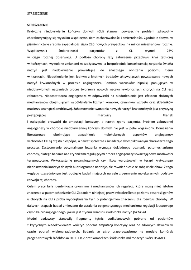 STRESZCZENIE STRESZCZENIE Krytyczne niedokrwienie kończyn dolnych (CLI) stanowi powszechny problem zdrowotny charakteryzujący się wysokim współczynnikiem zachorowalności i śmiertelności. Zgodnie z danymi w piśmiennictwie średnia zapadalność sięga 220 nowych przypadków na milion mieszkańców rocznie. Współczynnik śmiertelności pacjentów z CLI wynosi 25% w ciągu rocznej obserwacji. U podłoża choroby leży zaburzenie przepływu krwi tętniczej w kończynach, wywołane zmianami miażdżycowymi, a bezpośrednią konsekwencją zwężenia światła naczyń jest niedokrwienie prowadzące do znacznego obniżenia poziomu tlenu w tkankach. Niedotlenienie jest jednym z istotnych bodźców aktywujących powstawanie nowych naczyń krwionośnych w procesie angiogenezy. Pomimo warunków hipoksji panujących w niedokrwionych naczyniach proces tworzenia nowych naczyń krwionośnych chorych na CLI jest zaburzony. Niedostateczna angiogeneza w odpowiedzi na niedotlenienie jest efektem złożonych mechanizmów obejmujących współdziałanie licznych komórek, czynników wzrostu oraz składników macierzy zewnątrzkomórkowej. Zahamowanie tworzenia nowych naczyń krwionośnych jest przyczyną postępującej martwicy tkanek i najczęściej prowadzi do amputacji kończyny, a nawet zgonu pacjenta. Problem zaburzonej angiogenezy w chorobie niedokrwiennej kończyn dolnych nie jest w pełni wyjaśniony. Doniesienia literaturowe obejmujące zagadnienia molekularnych aspektów angiogenezy w chorobie CLI są często niespójne, a nawet sprzeczne i świadczą o skomplikowanym charakterze tego procesu. Zastosowanie optymalnego leczenia wymaga dokładnego poznania patomechanizmu choroby, dlatego badania nad czynnikami regulującymi proces angiogenezy stwarzają nowe możliwości terapeutyczne. Wykorzystanie proangiogennych czynników wzrostowych w terapii krytycznego niedokrwienia kończyn dolnych budzi ogromne nadzieje, ale również niesie ze sobą wiele obaw. Z tego względu uzasadnionym jest podjęcie badań mających na celu zrozumienie molekularnych podstaw rozwoju tej choroby. Celem pracy była identyfikacja czynników i mechanizmów ich regulacji, które mogą mieć istotne znaczenie w patomechanizmie CLI. Zadaniem niniejszej pracy było określenie poziomu ekspresji genów u chorych na CLI i próba wyodrębnienia tych o potencjalnym znaczeniu dla rozwoju choroby. W dalszych etapach badań zmierzano do ustalenia epigenetycznego mechanizmu regulacji kluczowego czynnika proangiogennego, jakim jest czynnik wzrostu śródbłonka naczyń (VEGF-A). Model badawczy stanowiły fragmenty tętnic podkolanowych pobrane od pacjentów z krytycznym niedokrwieniem kończyn podczas amputacji kończyny oraz od zdrowych dawców w czasie pobrań wielonarządowych. Badania in vitro przeprowadzono na modelu komórek progenitorowych śródbłonka HEPC-CB.2 oraz komórkach śródbłonka mikronaczyń skóry HSkMEC. STRESZCZENIE Przeprowadzone badania wykazały, że w tętnicach podkolanowych pacjentów z CLI występuje zwiększona ekspresja czynników prozapalnych takich jak IFNB1, IL12A, IFNG oraz MMP9 i TLR1, 3, 5, przy jednoczesnym braku aktywacji kluczowych cytokin proangiogennych m.in. VEGF-A, HGF, FGF-2 i HIF1A i ich receptorów. W kolejnych etapach pracy podjęto próbę zbadania czy za hamowanie ekspresji VEGF-A mogą odpowiadać czynniki epigenetyczne. W tym celu przeprowadzono analizy poziomu ekspresji wybranych mikroRNA oraz zbadano profil metylacji promotora VEGF-A. U pacjentów z CLI odnotowano podwyższony poziom mikroRNA 93, 126 oraz 29c, dla których docelowym transkryptem jest VEGF-A. Uzyskane rezultaty wskazują, że VEGF-A może być także regulowany także na drodze metylacji genomowego DNA. W materiale pobranym od chorych na CLI zaobserwowano podwyższony stopień metylacji promotora VEGF-A, ze szczególnym uwzględnieniem fragmentów -1217/-1207 i 1047/-1018, w których odnotowano najwięcej hipermetylowanych miejsc CpG. W prezentowanej pracy doktorskiej zmierzano również do ustalenia epigenetycznego mechanizmu regulacji genu VEGF-A na modelu hodowli komórkowych in vitro. Stwierdzono, że komórki progenitorowe śródbłonka HEPC-CB.2 charakteryzują się niższym stopniem globalnej metylacji DNA niż dojrzałe komórki śródbłonka mikronaczyń skóry HSkMEC, a poziom totalnej metylacji DNA znacząco wzrasta podczas niedotlenienia w obydwu liniach komórkowych. Badania nad regulacją epigenetyczną prowadzono przy użyciu inhibitora metylotransferaz DNA - 5aza-2’-deoksycytydyny, donora grup metylowych - S-adenozylometioniny oraz inhibitora deacetylaz histonów - trichostatyny A. Otrzymane wyniki wskazują, że produkcja VEGF-A jest zależna od stężenia tlenu oraz poziomu metylacji DNA w komórkach HEPC CB.2 oraz HSkMEC. Ilość mRNA i stężenie wydzielanego przez komórki białka VEGF-A wzrasta w wyniku obniżenia poziomu metylacji DNA w warunkach hipoksji. Zahamowanie deacetylacji histonów nie wpływa na poziom ekspresji genu VEGF-A w komórkach progenitorowych HEPC-CB.2, natomiast w dojrzałych komórkach śródbłonka HSkMEC powoduje zwiększenie produkcji VEGF-A w warunkach hipoksji. Demetylacja DNA w komórkach HEPC-CB.2 prowadzi do obniżenia ekspresji miR93, miR15a, miR16.1 oraz miR17, które są kluczowe dla regulacji ekspresji VEGF-A. Analiza profilu metylacji fragmentu promotora VEGF-A wykazała, że stopień metylacji promotora nie koreluje z ilością produkowanego VEGF-A przez komórki HskMEC i HEPC CB.2. Ponadto zaobserwowano, że obniżenie metylacji genomowego DNA działa stymulująco na właściwości angiogenne komórek HEPC-CB.2 in vitro, m.in. poprzez indukcję transkrypcji cytokin proangiogennych takich jak VEGF-A, HGF, ANGPT1. Podsumowując, uzyskane rezultaty świadczą, że do najefektywniejszej aktywacji transkrypcji VEGF-A dochodzi w warunkach hipoksji oraz w wyniku zahamowania procesu metylacji DNA. Otrzymane wyniki mają charakter poznawczy i wskazują n