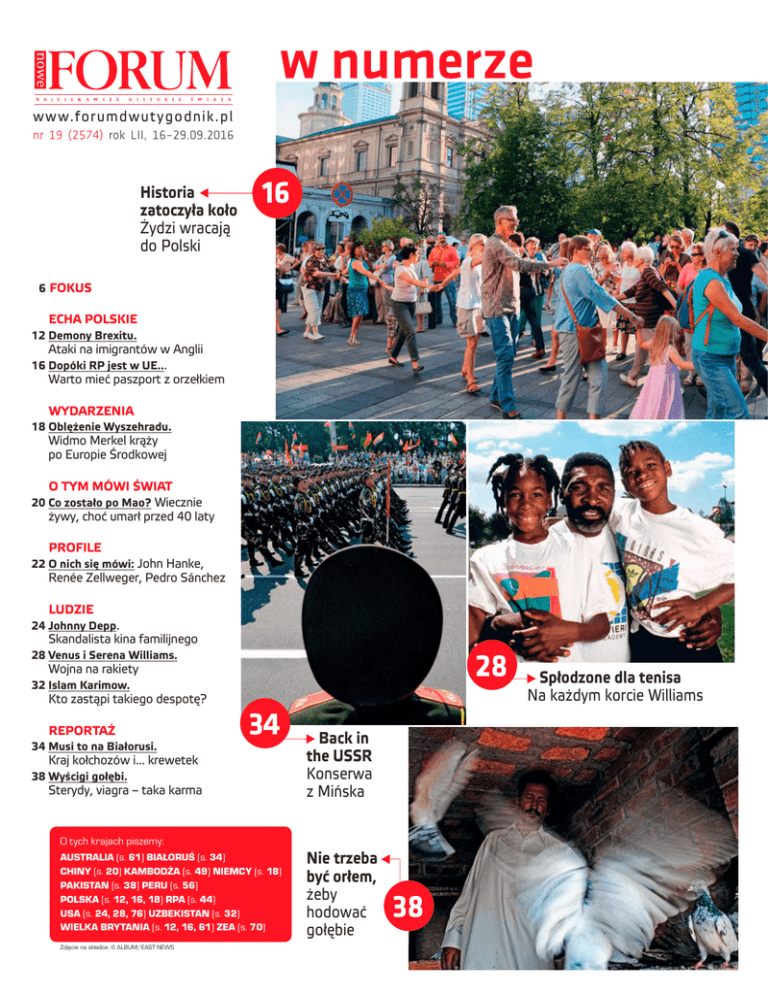 www.forumdwutygodnik.pl nr 19 (2574) rok LII, 1629.09.2016 Historia zatoczyła koło Żydzi wracają do Polski 16 6 FOKUS ECHA POLSKIE 12 Demony Brexitu. Ataki na imigrantów w Anglii 16 Dopóki RP jest w UE... Warto mieć paszport z orzełkiem WYDARZENIA 18 Oblężenie Wyszehradu. Widmo Merkel krąży po Europie Środkowej O TYM MÓWI ŚWIAT 20 Co zostało po Mao? Wiecznie żywy, choć umarł przed 40 laty PROFILE 22 O nich się mówi: John Hanke, Renée Zellweger, Pedro Sánchez LUDZIE 24 Johnny Depp. Skandalista kina familijnego 28 28 Venus i Serena Williams. Wojna na rakiety 32 Islam Karimow. Kto zastąpi takiego despotę? REPORTAŻ 34 Musi to na Białorusi. 34 Kraj kołchozów i... krewetek 38 Wyścigi gołębi. Sterydy, viagra – taka karma Back in the USSR Konserwa z Mińska O tych krajach piszemy: AUSTRALIA (s. 61) BIAŁORUŚ (s. 34) CHINY (s. 20) KAMBODŻA (s. 49) NIEMCY (s. 18) PAKISTAN (s. 38) PERU (s. 56) POLSKA (s. 12, 16, 18) RPA (s. 44) USA (s. 24, 28, 76) UZBEKISTAN (s. 32) WIELKA BRYTANIA (s. 12, 16, 61) ZEA (s. 70) Zdjęcie na okładce: © ALBUM/EAST NEWS Nie trzeba być orłem, żeby hodować gołębie 38 Spłodzone dla tenisa Na każdym korcie Williams pią NO N te W ast k 3 E ęp 0 w FO ne rz RU eś M nia 20 16 w 56 49 Tu rosła metropolia Zostały chaszcze i bagna Pod słońcem Peru ludziom bliżej do Boga 44 Czarne Mamby. Kobieca broń na kłusowników 49 Zaginione miasto. Cywilizacja w dżungli Kambodży FOTOSTORY 54 Londyn w ogniu. Pali się? To piekarnia! OBYCZAJE 56 Procesja do nieba. Pielgrzymka na szczytach Andów 61 Pedofile złapani w Sieć. Jak dzieci, jak dzieci... CYWILIZACJA 64 Trendy, zagadki, odkrycia ROZMOWA 66 Reinhold Messner. Po co stawiać krzyże w górach? Naj, naj, naj, czyli Dubaj Wysokie domy, wysokie ceny 70 66 Guru z gór: „To już szczyt wszystkiego!” KOMPAS 70 Emirat na jesień. W Dubaju plaże czekają HISTORIA 76 Ambasadorki toplessu. Girlsbandy miłe dla oka 80 MIKROFORUM 4 FORUM 19 2016 76 Czy to muzyka? Czy zawracanie... gitary?