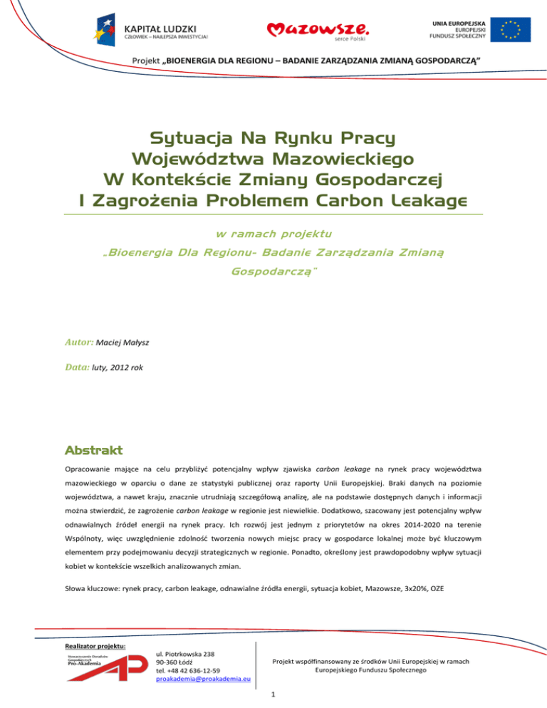 Sytuacja Na Rynku Pracy Województwa Mazowieckiego W Kontekście Zmiany Gospodarczej I Zagrożenia Problemem Carbon Leakage w ramach projektu „Bioenergia Dla Regionu- Badanie Zarządzania Zmianą Gospodarczą” Autor: Maciej Małysz Data: luty, 2012 rok Abstrakt Opracowanie mające na celu przybliżyć potencjalny wpływ zjawiska carbon leakage na rynek pracy województwa mazowieckiego w oparciu o dane ze statystyki publicznej oraz raporty Unii Europejskiej. Braki danych na poziomie województwa, a nawet kraju, znacznie utrudniają szczegółową analizę, ale na podstawie dostępnych danych i informacji można stwierdzić, że zagrożenie carbon leakage w regionie jest niewielkie. Dodatkowo, szacowany jest potencjalny wpływ odnawialnych źródeł energii na rynek pracy. Ich rozwój jest jednym z priorytetów na okres 2014-2020 na terenie Wspólnoty, więc uwzględnienie zdolność tworzenia nowych miejsc pracy w gospodarce lokalnej może być kluczowym elementem przy podejmowaniu decyzji strategicznych w regionie. Ponadto, określony jest prawdopodobny wpływ sytuacji kobiet w kontekście wszelkich analizowanych zmian. Słowa kluczowe: rynek pracy, carbon leakage, odnawialne źródła energii, sytuacja kobiet, Mazowsze, 3x20%, OZE Realizator projektu: ul. Piotrkowska 238 90-360 Łódź tel. +48 42 636-12-59 [email protected] Projekt współfinansowany ze środków Unii Europejskiej w ramach Europejskiego Funduszu Społecznego 1 Spis treści 1 Wstęp ................................................................................................................................................................................ 3 2 Obecna sytuacja na rynku pracy na Mazowszu ................................................................................................................. 4 2.1 Charakterystyka województwa pod kątem rynku pracy .......................................................................................... 4 2.2 Struktura przestrzenna, wiekowa i płciowa bezrobocia........................................................................................... 4 2.3 Struktura zatrudnienia w gospodarce narodowej – Polska i Mazowsze .................................................................. 4 3 Teoria kreacyjnego wpływu destrukcji miejsc pracy.......................................................................................................... 7 4 Czynniki sprzyjające likwidacji miejsc pracy na Mazowszu ................................................................................................ 9 5 4.1 Co oznacza carbon leakage? .................................................................................................................................... 9 4.2 Sektorowe zagrożenie carbon leakage z perspektywy krajów i regionów Unii Europejskiej .................................10 4.3 Zagrożone sektory i ich udział w strukturze zatrudnienia na Mazowszu ............................................................... 13 4.4 Inne czynniki - dezindustrializacja i wzrost produktywności .................................................................................. 15 Źródła kreacji miejsc pracy w obszarze OZE na Mazowszu .............................................................................................. 17 5.1 Obszary tworzenia nowych miejsc pracy w województwie mazowieckim w wyniku rozwoju OZE .......................17 5.2 Stan obecny rozwoju OZE na Mazowszu ................................................................................................................ 17 5.3 Teoretyczny wpływ poszczególnych źródeł na rynek pracy ................................................................................... 18 5.4 Sytuacja kobiet na rynku pracy .............................................................................................................................. 19 5.5 Podsumowanie ...................................................................................................................................................... 20 5.6 Załącznik ................................................................................................................................................................ 21 Realizator projektu: ul. Piotrkowska 238 90-360 Łódź tel. +48 42 636-12-59 [email protected] Projekt współfinansowany ze środków Unii Europejskiej w ramach Europejskiego Funduszu Społecznego 2 1 Wstęp Gospodarka niskoemisyjna – to właśnie tę, bardzo ambitną ideę Unia Europejska wybrała jako paradygmat rozwoju na XXI w. Założenia dotyczące ograniczenia emisji gazów cieplarnianych, zmniejszenia zużycia energii oraz zwiększenia udziału odnawialnych źródeł energii w produkowanej energii w ogóle przyjęte w marcu 2007 r. wykraczają daleko poza postanowienia protokołu z Kioto. Co więcej, postanowienia pakietu nazywanego popularnie „3x20%” są obligatoryjne dla krajów Wspólnoty i zakładają zbliżoną ścieżkę dochodzenia do obranych celów dla wszystkich krajów członkowskich do 2020 r. 3 Problemem podnoszonym przez niektóre przedsiębiorstwa, organizacje pracodawców i instytuty naukowe jest negatywny wpływ przyjętego pakietu na konkurencyjność podmiotów działających na obszarze Unii Europejskiej. Ich zdaniem, pod tym względem, relatywnie najbardziej poszkodowana może być gospodarka polska z racji na większe niż w pozostałych krajach uzależnienie od węgla i koszty olbrzymiego skok technologicznego, jaki musi się dokonać w przedsiębiorstwach, by wypełnić wymogi w terminie. Ponadto, biorą pod uwagę także ograniczony zakres terytorialny implementowanych zmian, ich osiągnięcie celu głównego, jakim jest poprawa sytuacji środowiska naturalnego na świecie, stoi pod znakiem zapytania, a jednym z powodów będzie wystąpienie efektu carbon leakage. Pomimo wyraźnego zagrożenia, ale i znaczących szans jakie niosą ze sobą tak poważne zmiany struk