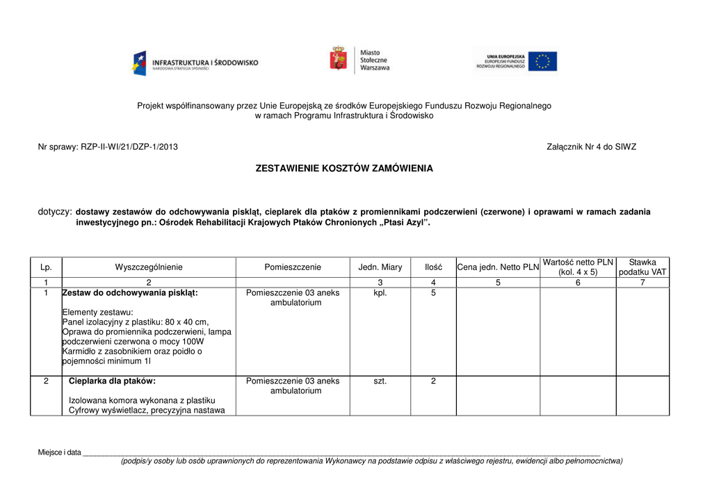 Projekt współfinansowany przez Unie Europejsk ze rodków Europejskiego Funduszu Rozwoju Regionalnego w ramach Programu Infrastruktura i rodowisko Nr sprawy: RZP-II-WI/21/DZP-1/2013 Zał cznik Nr 4 do SIWZ ZESTAWIENIE KOSZTÓW ZAMÓWIENIA dotyczy: dostawy zestawów do odchowywania piskl t, cieplarek dla ptaków z promiennikami podczerwieni (czerwone) i oprawami w ramach zadania inwestycyjnego pn.: O rodek Rehabilitacji Krajowych Ptaków Chronionych „Ptasi Azyl”. Lp. 1 1 Wyszczególnienie 2 Zestaw do odchowywania piskl t: Elementy zestawu: Panel izolacyjny z plastiku: 80 x 40 cm, Oprawa do promiennika podczerwieni, lampa podczerwieni czerwona o mocy 100W Karmidło z zasobnikiem oraz poidło o pojemno ci minimum 1l 2 Cieplarka dla ptaków: Izolowana komora wykonana z plastiku Cyfrowy wy wietlacz, precyzyjna nastawa Pomieszczenie Pomieszczenie 03 aneks ambulatorium Pomieszczenie 03 aneks ambulatorium Jedn. Miary Ilo 3 kpl. 4 5 szt. 2 Cena jedn. Netto PLN 5 Stawka Warto netto PLN (kol. 4 x 5) podatku VAT 6 7 Miejsce i data __________________________________________________________________________________________________________________________________ (podpis/y osoby lub osób uprawnionych do reprezentowania Wykonawcy na podstawie odpisu z wła ciwego rejestru, ewidencji albo pełnomocnictwa) Nr sprawy: RZP-II-WI/21/DZP-1/2013 Zał cznik Nr 4 do SIWZ temperatury w zakresie od 20 do ponad o 40 C Wewn trz mechaniczna wentylacja, filtry mechaniczne (wymienne) Zbiornik na wod pozwalaj cy na regulacj wilgotno ci powietrza Prze roczyste drzwi oraz wewn trzne wiatło, Wewn trz komory taca, ci le przylegaj ca do podłogi, Odporny na mycie i dezynfekcj , Wymiary wewn trzne 60 (+/- 5cm) – 40cm (+/- 5cm) wysoko 60cm (+/- 7cm) 3 Cieplarka dla ptaków: Izolowana komora wykonana z plastiku Cyfrowy wy wietlacz, precyzyjna nastawa temperatury w zakresie od 20 do ponad o 40 C Wewn trz mechaniczna wentylacja, filtry mechaniczne (wymienne) Zbiornik na wod pozwalaj cy na regulacj wilgotno ci powietrza Prze roczyste drzwi oraz wewn trzne wiatło, Wewn trz komory taca, ci le przylegaj ca do podłogi, Odporny na mycie i dezynfekcj , Wymiary wewn trzne 40 (+/- 2cm) – 30 (+/- 2 cm) cm wysoko 45 (+/- 7 cm) cm 4 Oprawa do promiennika podczerwieni Metalowa, gwint E27, z osłon , do arówek o mocy do 250W Pomieszczenie 03 aneks ambulatorium szt. 2 Pomieszczenie 03 aneks ambulatorium szt. 4 Miejsce i data _____________________________________________________________________________________________________________________________________ (podpis/y osoby lub osób uprawnionych do reprezentowania Wykonawcy na podstawie odpisu z wła ciwego rejestru, ewidencji albo pełnomocnictwa) 2/3 Nr sprawy: RZP-II-WI/21/DZP-1/2013 5 Promiennik podczerwieni (czerwony): Gwint E27, moc 100W, czerwona Zał cznik Nr 4 do SIWZ Pomieszczenie 03 aneks ambulatorium szt. 4 RAZEM NETTO …………………………………………………………… X KWOTA PODATKU VAT …………………………………………………………… X RAZEM BRUTTO ……………………………………………………………. X Miejsce i data _____________________________________________________________________________________________________________________________________ (podpis/y osoby lub osób uprawnionych do reprezentowania Wykonawcy na podstawie odpisu z wła ciwego rejestru, ewidencji albo pełnomocnictwa) 3/3