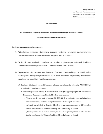 Załącznik nr 3 do Uchwały Nr .................... Rady Powiatu Pabianickiego z dnia ................................... OBJAŚNIENIA do Wieloletniej Prognozy Finansowej Powiatu Pabianickiego na lata 2015-2021 dotyczące zmian przyjętych wartości Podstawa przygotowania prognozy: 1. Wieloletnia prognoza finansowa zawiera wstępną prognozę podstawowych wielkości budżetu Powiatu Pabianickiego na lata 2015-2021. 2. W 2015 roku dochody i wydatki są zgodne z planem po zmianach Budżetu Powiatu Pabianickiego na rok 2015 stan na dzień 29.01.2015r. 3. Wprowadza się zmiany do budżetu Powiatu Pabianickiego w 2015 roku w związku z niewykorzystaniem w 2014 roku środków na projekty z udziałem środków europejskich i budżetu państwa: a) dochody bieżące i wydatki bieżące ulegają zwiększeniu o kwotę 77 504,83 zł w związku z realizacją przez: > Powiatowy Urząd Pracy w Pabianicach następujących projektów w ramach Programu Operacyjnego Kapitał Ludzki pod nazwą: - "Skuteczny Urząd - 6" o kwotę 28 560,00 zł w związku z przedłużeniem okresu realizacji zadania i uzyskaniem dodatkowych środków. - „Młodzi niezależni” o kwotę 14,69 zł - niewykorzystane w 2014 roku środki zwrócone do Wojewódzkiego Urzędu Pracy w Łodzi. - „Rekiny biznesu” o kwotę 2 777,89 zł - niewykorzystane w 2014 roku środki zwrócone do Wojewódzkiego Urzędu Pracy w Łodzi. 1 > Powiatowe Centrum Pomocy Rodzinie w Pabianicach projektu pod nazwą "Równe szanse" w ramach Programu Operacyjnego Kapitał Ludzki o kwotę 821,01 zł stanowiące niewykorzystane w 2014 roku środki zwrócone do Wojewódzkiego Urzędu Pracy w Łodzi. > Zespół Szkół Nr 1 w Pabianicach projektu pod nazwą "PWP Kształcenie modułowe - szansa edukacyjnego Operacyjnego Kapitał Ludzki niewykorzystane w 2014 o roku rozwoju" kwotę w ramach 17 693,46 środki zwrócone zł Programu stanowiącą do Urzędu Marszałkowskiego w Łodzi. > Powiatowy Ośrodek Doskonalenia Nauczycieli i Doradztwa Metodycznego w Pabianicach projektu pod nazwą "Nowy system doskonalenia nauczycieli powiatu pabianickiego" w ramach Programu Operacyjnego Kapitał Ludzki o kwotę 21 487,78 zł stanowiącą niewykorzystane w 2014 roku środki zwrócone do Urzędu Marszałkowskiego w Łodzi. > Zespół Szkół Specjalnych Nr 5 w Pabianicach projektu pod nazwą "Wszyscy mamy równe Szanse” w ramach Programu Operacyjnego Kapitał Ludzki współfinansowanego ze środków Europejskiego Funduszu Społecznego o kwotę 6 150,00 zł. Jednocześnie zmianie ulegają limity wydatków bieżących na finansowanie wyżej wymienionych zadań. b) zwiększeniu o kwotę 623 833,19 zł ulegają przychody z tytułu wolnych środków z wyniku budżetu powiatu za 2014 rok oraz wydatki bieżące z przeznaczeniem na realizację projektów pod nazwą: "Skuteczny Urząd - 6" na kwotę 1 435,72 zł, „Młodzi niezależni” o kwotę 83,23 zł oraz „Rekiny biznesu” o kwotę 15 741,36 zł w Powiatowym Urzędzie Pracy w Pabianicach, 2 "Równe szanse" o kwotę 171 299,22 zł w Powiatowym Centrum Pomocy Rodzinie w Pabianicach, "PWP Kształcenie modułowe - szansa edukacyjnego rozwoju" o kwotę 100 263,00 zł oraz „Inwestycja w szkołę – inwestycją w fachowca” o kwotę 56 854,25 zł w Zespole Szkół Nr 1 w Pabianicach, "Nowy system doskonalenia nauczycieli powiatu pabianickiego" o kwotę 121 764,10 zł w Powiatowym Ośrodku Doskonalenia Nauczycieli i Doradztwa Metodycznego w Pabianicach, "Energia odnawialna – dziedzina przyszłości” o kwotę 66 939,15 zł w Zespole Szkół Nr 2 w Pabianicach, „Branże przyszłości – gwarancją rozwoju i sukcesu” o kwotę 89 453,16 zł w Zespole Szkół Nr 3 w Pabianicach, Jednocześnie zmianie ulega limit wydatków bieżących na finansowanie wyżej wymienionych zadań. 4. Dochody majątkowe i wydatki majątkowe ulegają zwiększeniu o kwotę 496 806,00 zł w związku z uzyskaniem pomocy finansowej w formie dotacji celowej od Gminy Pabianice na realizację zadania inwestycyjnego pod nazwą „Przebudowa drogi powiatowej nr 3308E Szynkielew, Petrykozy, Kudrowice, Gmina Pabianice”. Jednocześnie zmianie ulega limit wydatków majątkowych na finansowanie wyżej wymienionego zadania. 5. W budżecie Powiatu Pabianickiego w 2015 roku pojawia się deficyt, który wynosi 362 381,29 zł i w całości zostanie sfinansowany wolnymi środkami z wyniku budżetu powiatu za 2014 rok. 6. W wyniku powyższych zmian zmianie ulegają oraz zostają urealnione: dochody bieżące w tym: - z tytułu dotacji i środków przeznaczonych na cele bieżące w 2015 roku do kwoty 17 351 156,64, 3 dochody majątkowe w tym: - z tytułu dotacji oraz środków przeznaczonych na inwestycje do kwoty 513 806,00 zł, 7. Limit zobowiązań przedsięwzięć wieloletnich na 2015 rok ulega zmianie do kwoty 3 724 537,85 zł w związku z realizacją projektów pod nazwą: "Skuteczny Urząd - 6", „Młodzi niezależni”, „Rekiny biznesu”, "Równe szanse", "PWP Kształcenie modułowe - szansa edukacyjnego rozwoju", „Inwestycja w szkołę – inwestycją w fachowca”, "Nowy system doskonalenia nauczycieli powiatu pabianickiego", „Branże przyszłości – gwarancją rozwoju i sukcesu”, „Wszyscy mamy równe szanse”, „Przebudowa drogi powiatowej nr 3308E Szynkielew, Petrykozy, Kudrowice, Gmina Pabianice”. 8. W zakresie informacji uzupełniających o wybranych rodzajach wydatków budżetowych w 2015 roku zmianie ulegają: wydatki bieżące objęte limitem art. 226 ust. 3 pkt. 4 ustawy urealnia się w 2015 roku do kwoty 3 356 762,41 zł w związku z realizacją projektów: "Skuteczny Urząd - 6", „Młodzi niezależni”, „Rekiny biznesu”, "Równe szanse", "PWP Kształcenie modułowe - szansa edukacyjnego rozwoju", „Inwestycja w szkołę – inwestycją w fachowca”, "Nowy system doskonalenia nauczycieli powiatu pabianickiego", "Energia odnawialna – dziedzina przyszłości”, 4 „Branże przyszłości – gwarancją rozwoju i sukce