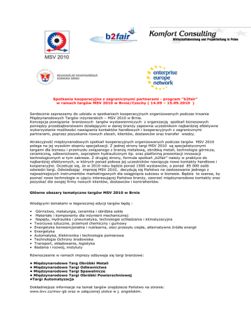 Spotkania kooperacyjne z zagranicznymi partnerami - program "b2fair" w ramach targów MSV 2010 w Brnie/Czechy ( 14.09 – 15.09.2010 ) Serdecznie zapraszamy do udziału w spotkaniach kooperacyjnych organizowanych podczas trwania Międzynarodowych Targów inżynierskich – MSV 2010 w Brnie. Koncepcja powiązania branżowych targów wystawienniczych z organizacją spotkań biznesowych pomiędzy przedsiębiorstwami działającymi w danej branży zapewnia uczestnikom najbardziej efektywne wykorzystanie możliwości nawiązania kontaktów handlowych i kooperacyjnych z zagranicznymi partnerami, poprzez pozyskanie nowych zleceń, klientów, dostawców oraz transfer wiedzy. Atrakcyjność międzynarodowych spotkań kooperacyjnych organizowanych podczas targów MSV 2010 polega na jej wysokim stopniu specjalizacji. Z jednej strony targi MSV 2010 są specjalistycznymi targami dla biznesu i przemysłu związanego z branżą metalową, obróbką metali, technologia górnicza, ceramiczną, odlewnictwem, osprzętem hydraulicznym itp. oraz platformą prezentacji innowacji technologicznych w tym zakresie. Z drugiej strony, formuła spotkań „b2fair” należy w praktyce do najbardziej efektywnych, w których ponad połowa jej uczestników nawiązuje nowe kontakty handlowe i kooperacyjne. Oczekuje się, że w 2010 roku będzie ponad 1500 wystawców, a ponad 85 000 osób odwiedzi targi. Odwiedzając imprezę MSV 2010, decydują się Państwo na zastosowanie jednego z najważniejszych instrumentów marketingowych dla osiągnięcia sukcesu w biznesie. Będzie to szansa, by poznać nowe technologie w ujęciu interesującej Państwa branży, zawrzeć międzynarodowe kontakty oraz pozyskać dla swojej firmy nowych klientów, dostawców i kontrahentów. Główne obszary tematyczne targów MSV 2010 w Brnie Wiodącymi tematami w tegorocznej edycji targów będą : • • • • • • • • • • Górnictwo, metalurgia, ceramika i obróbka szkła Materiały i komponenty dla inżynierii mechanicznej: Napędy, Hydraulika i pneumatyka, technologie schładzania i klimatyzacyjna Tworzywa sztuczne, przemysł chemiczny i gumowy Energetyka konwencjonalna i nuklearna, sieci przesyłu ciepła, alternatywne źródła energii Energetyka Automatyka, Elektronika i technologia pomiarowa Technologia Ochrony środowiska Transport, składowanie, logistyka Badania i rozwój, instytuty Równoczesnie w ramach imprezy odbywaja się targi branżowe: • Międzynarodowe Targ Obróbki Metali • Międzynarodowe Targi Odlewnictwa • Międzynarodowe Targi Spawalnicze • Międzynarodowe Targi Obróbki Powierzchniowej •Targi Automatyzacja Dokładniejsze informacje na temat targów znajdziecie Państwo na stronie: www.bvv.cz/msv-gb oraz w załączonej ulotce w j. angielskim. Krajem partnerskim targów jest w tym roku Austria. Koncepcja „b2fair” Koncepcja organizacji spotkań kooperacyjnych przy okazji odbywających się targów jest nowym zjawiskiem, zapoczątkowanym w 2004 roku. Bardzo dobre przyjęcie tej formuły i uznanie wśród uczestników spotkań kooperacyjnych spowodowało szybki rozwój tego sposobu pozyskiwania nowych klientów, dostawców i kontrahentów firm. Przedsiębiorstwa zainteresowane nawiązaniem współpracy będą mogły dokonać wyboru firm zagranicznych o wybranym profilu działalności spośród kilkuset przedsiębiorstw branżowych działających na rynku europejskim i rynkach światowych jeszcze przed rozpoczęciem targów AMB 2008. Z wybranymi firmami będą zaaranżowane spotkania podczas trwania targów według następującej formuły : Etap 1 : Wypełnienie przez Państwa formularza opisującego profil Państwa firmy oraz Państwa oczekiwania co do typu partnerów i charakteru współpracy jakiej Państwo poszukujecie , a następnie przesłanie go do organizatora „b2fair” celem rejestracji . Rejestracji dokonują Państwo on-line poprzez podany link na strone rejestracyjną, lub za pośrednictwem Komfort Consulting s.c. Etap 2 : Udostępnienie przez organizatora spotkań kooperacyjnych on_line na temat firm uczestniczących w spotkaniach biznesowych szczegółowych informacji Etap 3 : Wskazanie przez Państwa firm z którymi chcielibyście nawiązać kontakt. Etap 4 : Przygotowanie przez organizatora „b2fair” agendy spotkań z wybranymi przez Państwa firmami i przesłanie jej do Państwa przed rozpoczęciem targów. Etap 5 : Spotkania na targach MSV 2010 z wybranymi przez Państwa firmami zagranicznymi celem omówienia możliwości i charakteru współpracy. Spotkania są organizowane w ilości do 10-12 dziennie i każde trwa średnio około 30 minut . Uwaga : Jeżeli będzie taka potrzeba , służymy Państwu pomocą przy tłumaczeniu rozmów z potencjalnymi kontrahentami ( język niemiecki, język angielski ). Opłata za uczestnictwo w spotkaniach kooperacyjnych podczas targów MSV 2010 wynosi 150 EURO plus VAT. Na podstawie porozumienia pomiędzy targami MSV 2010 w Brnie i AMB 2010 w Stuttgarcie firma która zarejestruje się do udziału w b2 fair na którejś z tych imprez, może się zarejestrować do udziału w spotkaniach kooperacyjnych b2fair na drugiej imprezie bezpłatnie, tzn. średni koszt udziału w imprezie wyn. 75 EUR w każdej z nich. Uczestnictwo w spotkaniach kooperacyjnych b2fair zapewnia: - wstęp na targi MSV 2010 dla 2 osób z firmy uczestniczącej w dniach spotkań kooperacyjnych - organizacja spotkań z wybranymi przez uczestnika firmami - udostępnienie sali spotkań kooperacyjnych z garderobą - publikację informacji o Państwa firmie w katalogu on-line także po targach - katalog wszystkich wystawców - możliwość tłumaczenia rozmów biznesowych ( język niemiecki, angielski ,) , jeżeli zachodzi taka potrzeba - kawa , napoje , przekąski na stoisku „b2fair” - udział w wieczornym party w czwartek, 14.09.2010 Termin wysyłania zgłoszeń upływa 30 sierpnia 2010 roku. Warunkiem uczestnictwa w spotkaniach „b2fair” jest rejestracja oraz dokonanie w