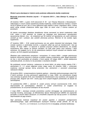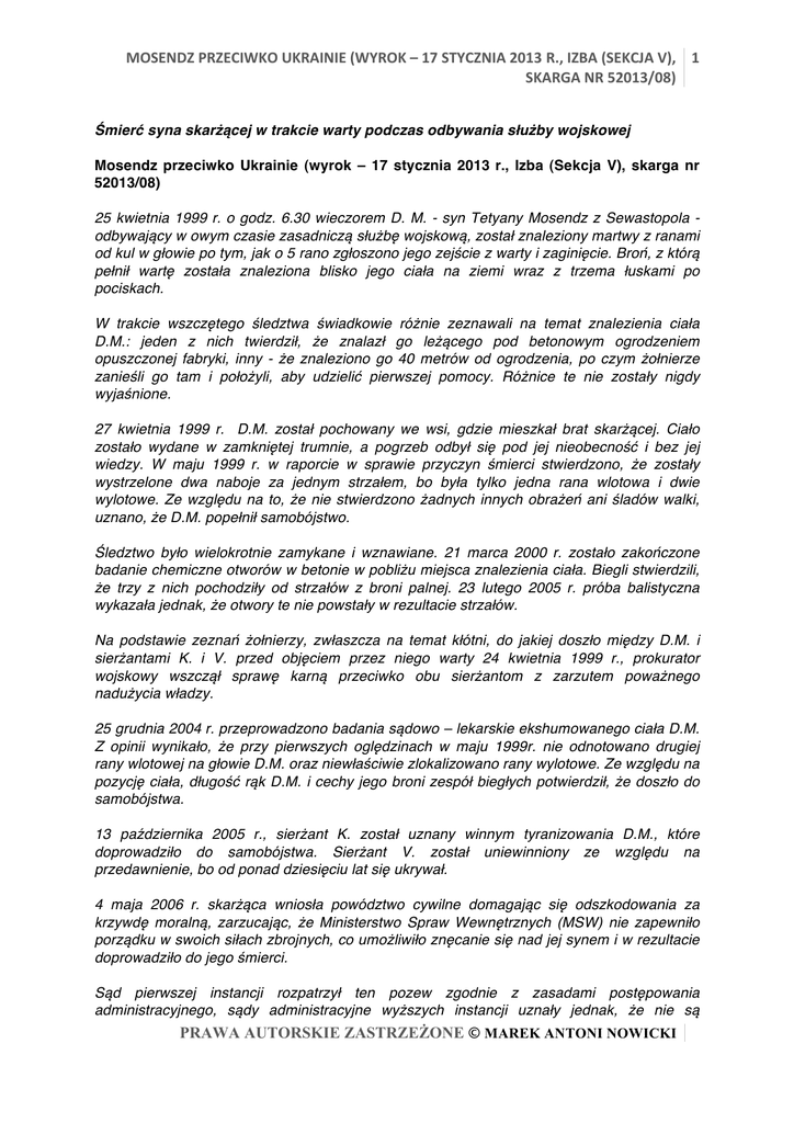 MOSENDZ PRZECIWKO UKRAINIE (WYROK – 17 STYCZNIA 2013 R., IZBA (SEKCJA V), 1 SKARGA NR 52013/08) Śmierć syna skarżącej w trakcie warty podczas odbywania służby wojskowej Mosendz przeciwko Ukrainie (wyrok – 17 stycznia 2013 r., Izba (Sekcja V), skarga nr 52013/08) 25 kwietnia 1999 r. o godz. 6.30 wieczorem D. M. - syn Tetyany Mosendz z Sewastopola odbywający w owym czasie zasadniczą służbę wojskową, został znaleziony martwy z ranami od kul w głowie po tym, jak o 5 rano zgłoszono jego zejście z warty i zaginięcie. Broń, z którą pełnił wartę została znaleziona blisko jego ciała na ziemi wraz z trzema łuskami po pociskach. W trakcie wszczętego śledztwa świadkowie różnie zeznawali na temat znalezienia ciała D.M.: jeden z nich twierdził, że znalazł go leżącego pod betonowym ogrodzeniem opuszczonej fabryki, inny - że znaleziono go 40 metrów od ogrodzenia, po czym żołnierze zanieśli go tam i położyli, aby udzielić pierwszej pomocy. Różnice te nie zostały nigdy wyjaśnione. 27 kwietnia 1999 r. D.M. został pochowany we wsi, gdzie mieszkał brat skarżącej. Ciało zostało wydane w zamkniętej trumnie, a pogrzeb odbył się pod jej nieobecność i bez jej wiedzy. W maju 1999 r. w raporcie w sprawie przyczyn śmierci stwierdzono, że zostały wystrzelone dwa naboje za jednym strzałem, bo była tylko jedna rana wlotowa i dwie wylotowe. Ze względu na to, że nie stwierdzono żadnych innych obrażeń ani śladów walki, uznano, że D.M. popełnił samobójstwo. Śledztwo było wielokrotnie zamykane i wznawiane. 21 marca 2000 r. zostało zakończone badanie chemiczne otworów w betonie w pobliżu miejsca znalezienia ciała. Biegli stwierdzili, że trzy z nich pochodziły od strzałów z broni palnej. 23 lutego 2005 r. próba balistyczna wykazała jednak, że otwory te nie powstały w rezultacie strzałów. Na podstawie zeznań żołnierzy, zwłaszcza na temat kłótni, do jakiej doszło między D.M. i sierżantami K. i V. przed objęciem przez niego warty 24 kwietnia 1999 r., prokurator wojskowy wszczął sprawę karną przeciwko obu sierżantom z zarzutem poważnego nadużycia władzy. 25 grudnia 2004 r. przeprowadzono badania sądowo – lekarskie ekshumowanego ciała D.M. Z opinii wynikało, że przy pierwszych oględzinach w maju 1999r. nie odnotowano drugiej rany wlotowej na głowie D.M. oraz niewłaściwie zlokalizowano rany wylotowe. Ze względu na pozycję ciała, długość rąk D.M. i cechy jego broni zespół biegłych potwierdził, że doszło do samobójstwa. 13 października 2005 r., sierżant K. został uznany winnym tyranizowania D.M., które doprowadziło do samobójstwa. Sierżant V. został uniewinniony ze względu na przedawnienie, bo od ponad dziesięciu lat się ukrywał. 4 maja 2006 r. skarżąca wniosła powództwo cywilne domagając się odszkodowania za krzywdę moralną, zarzucając, że Ministerstwo Spraw Wewnętrznych (MSW) nie zapewniło porządku w swoich siłach zbrojnych, co umożliwiło znęcanie się nad jej synem i w rezultacie doprowadziło do jego śmierci. Sąd pierwszej instancji rozpatrzył ten pozew zgodnie z zasadami postępowania administracyjnego, sądy administracyjne wyższych instancji uznały jednak, że nie są PRAWA AUTORSKIE ZASTRZEŻONE © MAREK ANTONI NOWICKI 2 MOSENDZ PRZECIWKO UKRAINIE (WYROK – 17 STYCZNIA 2013 R., IZBA (SEKCJA V), SKARGA NR 52013/08) właściwe, bo sprawą powinny się zająć sądy cywilne. W rezultacie postępowanie zakończyło się bez rezultatu w październiku 2011 r. W skardze do Trybunału matka zmarłego zarzuciła znęcanie się nad jej synem przez sierżantów (art.3 Konwencji). Twierdziła również, że nie wierzy, iż śmierć nastąpiła w rezultacie samobójstwa, jak głosiła oficjalna wersja (art.2). W jej ocenie władze ukraińskie nie miały zamiaru prowadzenia w tej sprawie odpowiedniego śledztwa. Nie mogła też wnieść sprawy przeciwko władzom państwowym o odszkodowanie (art.13). Trybunał potwierdził, że zgodnie ze zdaniem pierwszym art. 2 ust.1 państwo musi nie tylko powstrzymać się przed zamierzonym i bezprawnym odebraniem życia, ale także podejmować odpowiednie kroki dla ochrony życia osób pozostających pod jego jurysdykcją. W wykonaniu tego obowiązku państwo musi przede wszystkim stworzyć ramy prawne i administracyjne pozwalające zapewnić skuteczną prewencję. Muszą one obejmować regulacje odpowiednie ze względu na konkretne cechy danej działalności, w szczególności potencjalne ryzyko dla życia ludzkiego. W związku z zasadniczą służbą wojskową Trybunał stwierdził, że głównym obowiązkiem państwa jest przyjęcie regulacji dostosowanych do poziomu ryzyka dla życia lub zdrowia wynikającego nie tylko z natury działań i operacji wojskowych, ale również związanego z elementem ludzkim, który wchodzi w grę w sytuacji, gdy państwo decyduje się powołać zwykłych obywateli do odbycia służby wojskowej. Regulacje takie muszą polegać na przyjęciu środków praktycznych mających skutecznie chronić poborowych przed niebezpieczeństwami nieodłącznymi od życia wojskowego oraz odpowiednich procedur umożliwiających stwierdzenie braków i błędów, które mogą być popełnione przez osoby odpowiedzialne na różnych poziomach. Podobnie jak osoby pozbawione wolności poborowi pozostają całkowicie w rękach państwa, a władze posiadają całą lub znaczną część wyłącznej wiedzy o wszystkich zdarzeniach w armii. Tak więc państwo musi również wyjaśnić wszelkie obrażenia lub przypadki śmierci, do których w niej doszło. Trybunał potwierdził w związku z tym, że we wszystkich sprawach, w których nie może dokładnie ustalić okoliczności z powodów, za które obiektywnie są odpowiedzialne władze państwowe, do rządu należy zadawalające i przekonujące wyjaśnienie przebiegu wydarzeń i przedstawienie solidnych dowodów, który mogłyby obalić zarzuty skarżącego. Obowiązek och