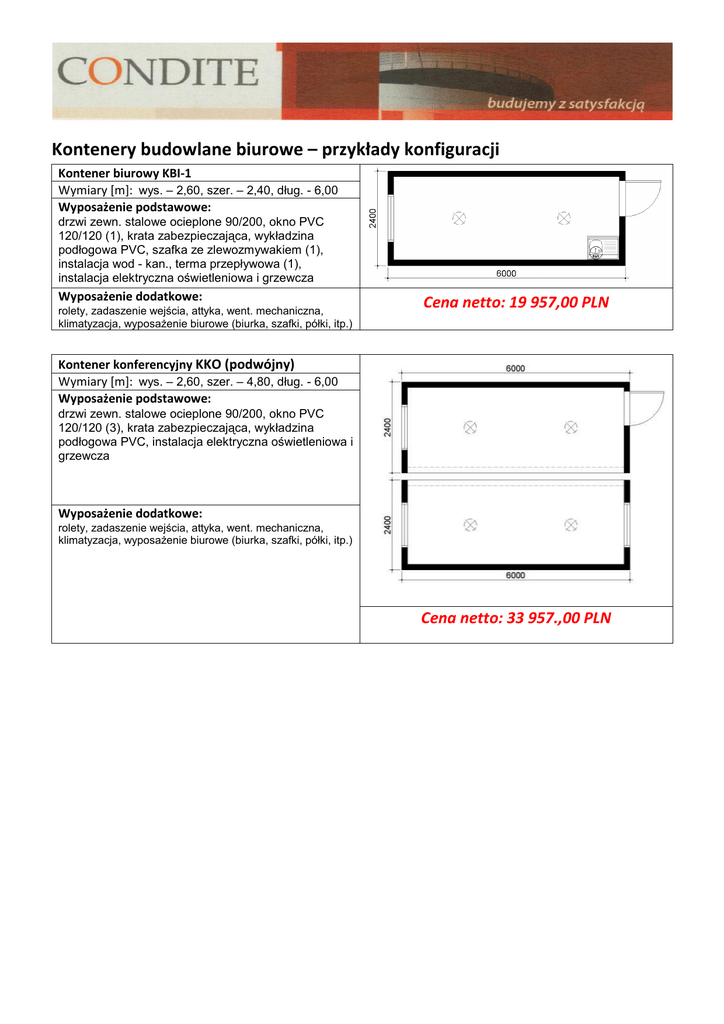 Kontenery budowlane biurowe – przykłady konfiguracji Kontener biurowy KBI-1 Wymiary [m]: wys. – 2,60, szer. – 2,40, dług. - 6,00 Wyposażenie podstawowe: drzwi zewn. stalowe ocieplone 90/200, okno PVC 120/120 (1), krata zabezpieczająca, wykładzina podłogowa PVC, szafka ze zlewozmywakiem (1), instalacja wod - kan., terma przepływowa (1), instalacja elektryczna oświetleniowa i grzewcza Wyposażenie dodatkowe: rolety, zadaszenie wejścia, attyka, went. mechaniczna, klimatyzacja, wyposaŜenie biurowe (biurka, szafki, półki, itp.) Cena netto: 19 957,00 PLN Kontener konferencyjny KKO (podwójny) Wymiary [m]: wys. – 2,60, szer. – 4,80, dług. - 6,00 Wyposażenie podstawowe: drzwi zewn. stalowe ocieplone 90/200, okno PVC 120/120 (3), krata zabezpieczająca, wykładzina podłogowa PVC, instalacja elektryczna oświetleniowa i grzewcza Wyposażenie dodatkowe: rolety, zadaszenie wejścia, attyka, went. mechaniczna, klimatyzacja, wyposaŜenie biurowe (biurka, szafki, półki, itp.) Cena netto: 33 957.,00 PLN Kontakt: 510 031 527, 510 031 522 Kontenery budowlane sanitarne – przykłady konfiguracji Kontener sanitarny KSA 1 Wymiary [m]: wys. – 2,60, szer. – 2,40, dług. - 6,00 Wyposażenie podstawowe: drzwi zewn. stalowe ocieplone 90/200, wewn. płytowe 80/200 (2), okno PVC 60/60 (2), wykładzina podłogowa PVC, sedes z dolnopłukiem (2), umywalka (4), pisuar (2), brodzik (2), instalacja wod - kan., terma pojemnościowa (2), instalacja elektryczna oświetleniowa i grzewcza Wyposażenie dodatkowe: kraty, rolety, zadaszenie wejścia, attyka, went. mechaniczna Cena netto: 25 523,00 PLN Kontener sanitarny KSA 2 Wymiary [m]: wys. – 2,60, szer. – 2,40, dług. - 6,00 Wyposażenie podstawowe: drzwi zewn. stalowe ocieplone 90/200, wewn. płytowe 80/200 (2), okno PVC 60/60 (2), wykładzina podłogowa PVC, sedes z dolnopłukiem (2), umywalka (4), pisuar (2), brodzik (1), instalacja wod - kan., terma pojemnościowa (1), instalacja elektryczna oświetleniowa i grzewcza Wyposażenie dodatkowe: kraty, rolety, zadaszenie wejścia, attyka, went. mechaniczna Cena netto: 26 194,00 PLN Kontener sanitarny KSA 3 Wymiary [m]: wys. – 2,60, szer. – 2,40, dług. - 6,00 Wyposażenie podstawowe: drzwi zewn. stalowe ocieplone 90/200, wewn. płytowe 80/200 (3), okno PVC 60/60 (1), wykładzina podłogowa PVC, sedes z dolnopłukiem (2), umywalka (2), pisuar (2), brodzik (2), instalacja wod - kan., terma pojemnościowa (1), instalacja elektryczna oświetleniowa i grzewcza Wyposażenie dodatkowe: kraty, rolety, zadaszenie wejścia, attyka, went. mechaniczna Kontakt: 510 031 527, 510 031 522 Cena netto: 26 194,00 PLN Kontenery budowlane dodatkowe – przykłady konfiguracji Kontener stróżówka Wymiary [m]: wys. – 2,60, szer. – 2,40, dług. - 2,40 Wyposażenie podstawowe: drzwi zewn. stalowe ocieplone 90/200, okno PVC 120/120 (3), 70/120 (1), wykładzina podłogowa PVC, instalacja elektryczna oświetleniowa i grzewcza Wyposażenie dodatkowe: rolety, zadaszenie wejścia, attyka, went. mechaniczna, klimatyzacja, wyposaŜenie biurowe (biurka, szafki, półki, itp.) Cena netto: 14 076,00 PLN Kontener biurowo - magazynowy Wymiary [m]: wys. – 2,60, szer. – 4,80, dług. - 6,00 Wyposażenie podstawowe: drzwi zewn. stalowe ocieplone 90/200, okno PVC 120/120 (1), krata zabezpieczająca, wykładzina podłogowa PVC, instalacja elektryczna oświetleniowa i grzewcza, wrota zewn. stalowe 200/200 Wyposażenie dodatkowe: rolety, zadaszenie wejścia, attyka, went. mechaniczna, klimatyzacja, wyposaŜenie biurowe (biurka, szafki, półki, itp.) Kontakt: 510 031 527, 510 031 522 Cena netto: 17 451,00 PLN