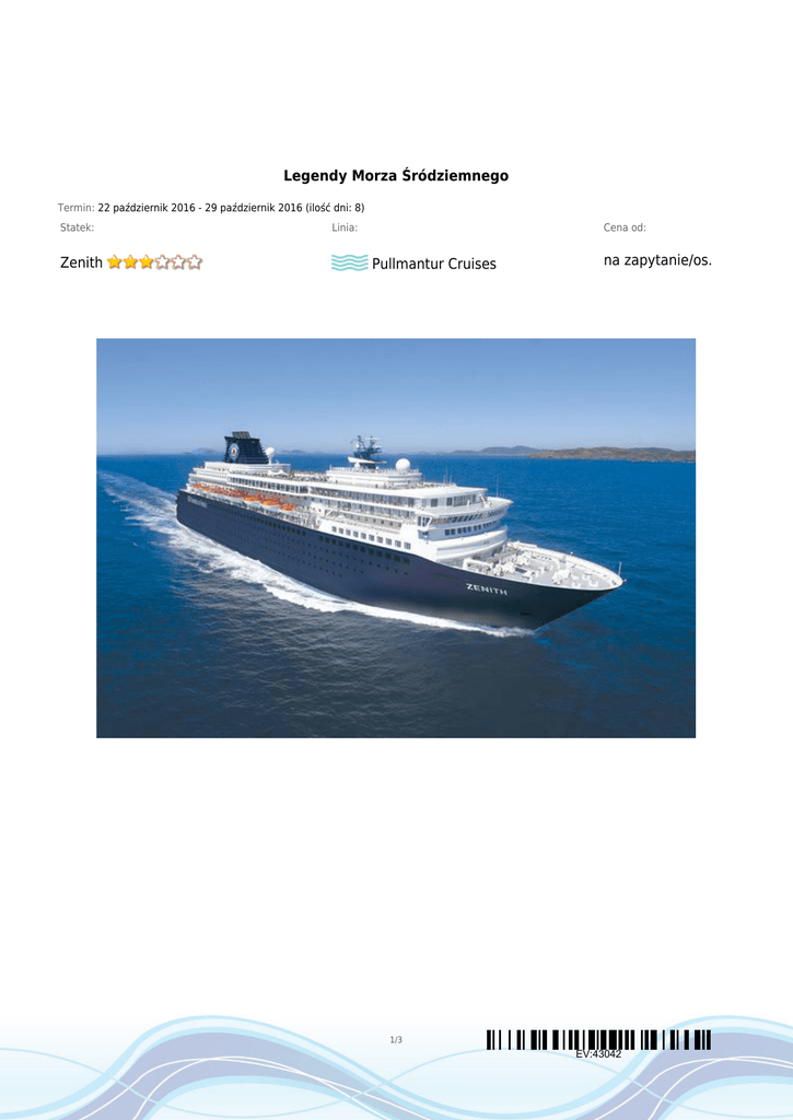 Legendy Morza Śródziemnego Termin: 22 październik 2016 - 29 październik 2016 (ilość dni: 8) Statek: Zenith Linia: Cena od: Pullmantur Cruises na zapytanie/os. 1/3 EV:43042 TRASA REJSU dzień 1 dzień 2 Data Port Wpłynięcie Wypłynięcie sobota 22.10.2016 Malaga --:-- 18:00 Hiszpania niedziela 23.10.2016 12:00 18:00 Hiszpania Alicante dzień 3 poniedziałek 24.10.2016 Dzień na morzu --:-- --:-- dzień 4 wtorek 25.10.2016 Civitavecchia, Rzym 09:30 20:00 środa 26.10.2016 Livorno, Florencja i Piza 08:00 19:00 czwartek 27.10.2016 Villefranche-sur-Mer, Nicea 07:00 14:00 dzień 7 piątek 28.10.2016 Dzień na morzu --:-- --:-- dzień 8 sobota 29.10.2016 Malaga 11:00 --:-- dzień 5 dzień 6 Legenda Włochy Włochy Francja Hiszpania CENNIK Cena katalogowa Junior Suite with balcony €1 106.00 Outside Superior €765.00 Outside €630.00 Inside Superior €555.00 Inside €490.00 Suite Deluxe with balcony Cena promocyjna €1 365.00 Outside Deluxe €965.00 Opłaty portowe €190.00 Uwaga! Ceny za osobę w kabinie dwuosobowej. 2/3 EV:43042 Cena zawiera: zakwaterowanie w kabinie wybranej kategorii; wyżywienie - 3 główne posiłki, przekąski między posiłkami, bufet lub przekąski o północy; podstawowy pakiet all inclusive; serwis bagażowy podczas wejścia i zejścia ze statku; serwis kabinowy; korzystanie ze wszystkich urządzeń sportowo - rekreacyjnych znajdujących się na pokładzie statku (basen, jacuzzi, sala fitness, itp.); udział we wszystkich imprezach organizowanych na statku (przedstawienia w teatrze, koncerty, programy animacyjne itp.). Cena nie zawiera: kosztów dojazdu do portu; ewentualnych noclegów w hotelu przed/po rejsie i transferów; wycieczek fakultatywnych w trakcie rejsu; korzystania z punktów usługowych (fryzjer, pralnia, fotograf, salon piękności i odnowy biologicznej, internet) i wydatków osobistych; napiwków dla obsługi na statku (kwota uzależniona od długości rejsu); ubezpieczenia KL, NNW i bagaż, kosztów wiz (tam gdzie wymagane). 3/3 EV:43042