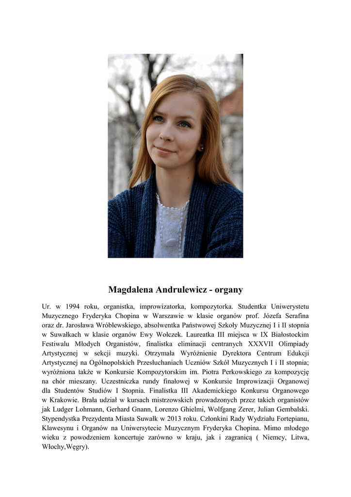 Magdalena Andrulewicz - organy Ur. w 1994 roku, organistka, improwizatorka, kompozytorka. Studentka Uniwerystetu Muzycznego Fryderyka Chopina w Warszawie w klasie organów prof. Józefa Serafina oraz dr. Jarosława Wróblewskiego, absolwentka Państwowej Szkoły Muzycznej I i II stopnia w Suwałkach w klasie organów Ewy Wołczek. Laureatka III miejsca w IX Białostockim Festiwalu Młodych Organistów, finalistka eliminacji centranych XXXVII Olimpiady Artystycznej w sekcji muzyki. Otrzymała Wyróżnienie Dyrektora Centrum Edukcji Artystycznej na Ogólnopolskich Przesłuchaniach Uczniów Szkół Muzycznych I i II stopnia; wyróżniona także w Konkursie Kompozytorskim im. Piotra Perkowskiego za kompozycję na chór mieszany. Uczestniczka rundy finałowej w Konkursie Improwizacji Organowej dla Studentów Studiów I Stopnia. Finalistka III Akademickiego Konkursu Organowego w Krakowie. Brała udział w kursach mistrzowskich prowadzonych przez takich organistów jak Ludger Lohmann, Gerhard Gnann, Lorenzo Ghielmi, Wolfgang Zerer, Julian Gembalski. Stypendystka Prezydenta Miasta Suwałk w 2013 roku. Członkini Rady Wydziału Fortepianu, Klawesynu i Organów na Uniwersytecie Muzycznym Fryderyka Chopina. Mimo młodego wieku z powodzeniem koncertuje zarówno w kraju, jak i zagranicą ( Niemcy, Litwa, Włochy,Węgry).
