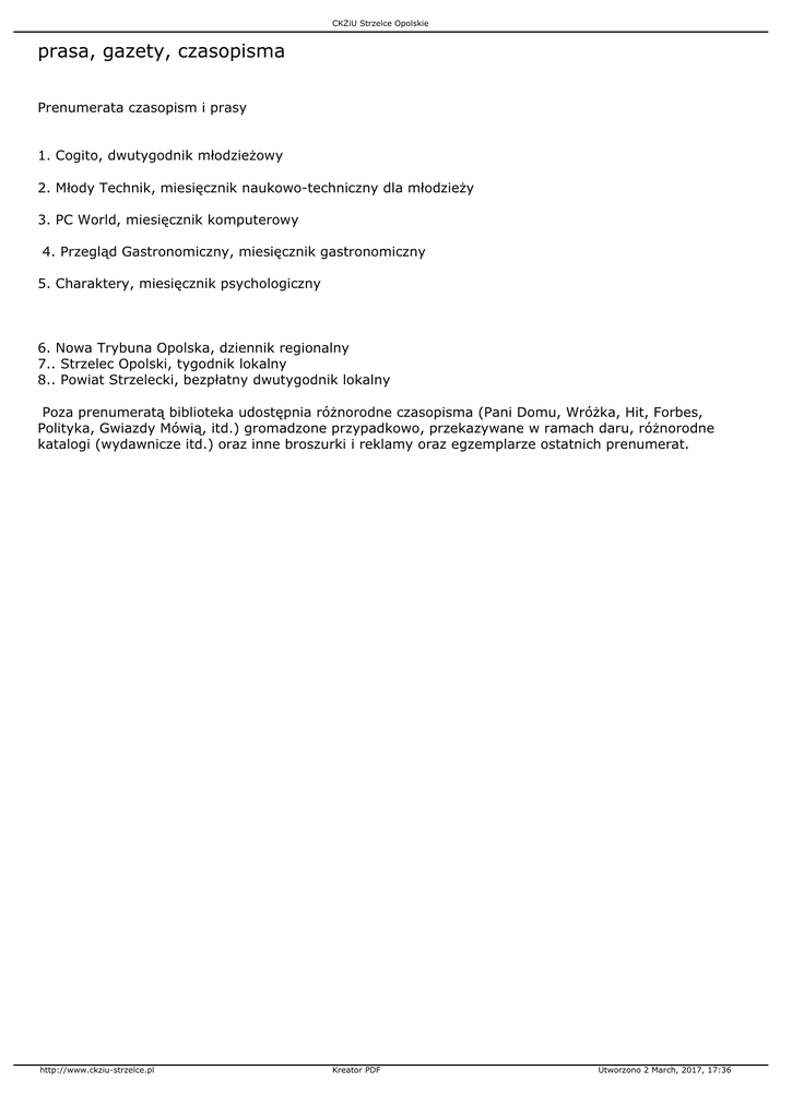 CKZiU Strzelce Opolskie prasa, gazety, czasopisma Prenumerata czasopism i prasy 1. Cogito, dwutygodnik młodzieżowy 2. Młody Technik, miesięcznik naukowo-techniczny dla młodzieży 3. PC World, miesięcznik komputerowy 4. Przegląd Gastronomiczny, miesięcznik gastronomiczny 5. Charaktery, miesięcznik psychologiczny 6. Nowa Trybuna Opolska, dziennik regionalny 7.. Strzelec Opolski, tygodnik lokalny 8.. Powiat Strzelecki, bezpłatny dwutygodnik lokalny Poza prenumeratą biblioteka udostępnia różnorodne czasopisma (Pani Domu, Wróżka, Hit, Forbes, Polityka, Gwiazdy Mówią, itd.) gromadzone przypadkowo, przekazywane w ramach daru, różnorodne katalogi (wydawnicze itd.) oraz inne broszurki i reklamy oraz egzemplarze ostatnich prenumerat. http://www.ckziu-strzelce.pl Kreator PDF Utworzono 2 March, 2017, 17:36