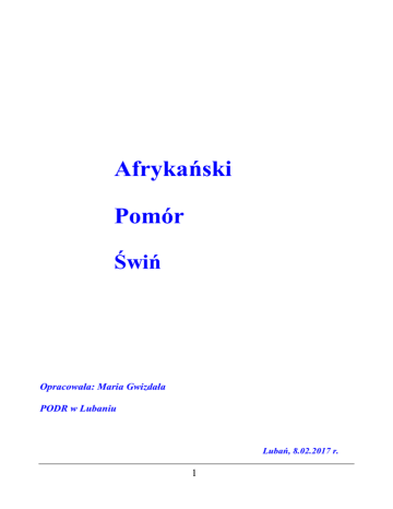 Afrykański Pomór Świń Opracowała: Maria Gwizdała PODR w Lubaniu Lubań, 8.02.2017 r. 1 AFRYKAŃSKI POMÓR ŚWIŃ – co powinniśmy wiedzieć ? Afrykański pomór świń to bardzo groźna i wysoce zaraźliwa choroba wirusowa świń i dzików, na którą ludzie nie są wrażliwi. Nie stanowi ona w żadnym wypadku zagrożenia dla zdrowia i życia ludzi. W Polsce, pierwszy przypadek ASF został potwierdzony u znalezionego 800 metrów od granicy z Białorusią padłego dzika, w dniu 14 lutego 2014 r., w miejscowości Grzybowszczyzna, gm. Szadziałowo pow. sokólski woj. podlaskie. Do 31 stycznia 2017 r. zlokalizowano 198 przypadków ASF u dzików. Pierwsze ognisko u świń wystąpiło 21.07.2014 r. Dwa następne ogniska były zlokalizowane w woj. podlaskim, oddalone ok. 9 km do granicy z Białorusią, w gospodarstwach małych, przydomowych, nieprzestrzegających zasad bioasekuracji. W 2016 r. doszło do dalszej eskalacji ognisk ASF u świń, od czerwca do końca września, zanotowano 20 nowych ognisk. Łącznie, od początku wystąpienia tego zjawiska w Polsce, zlokalizowano i zlikwidowano zgodnie z procedurami 23 ogniska. 2 3 Drogi szerzenia i rozprzestrzeniania się wirusa Wirus afrykańskiego pomoru świń rozprzestrzenia się i przenosi tylko drogą mechaniczną. Nie szerzy się drogą powietrzną. Oznacza to, że drogą powietrzną nasze stado się nie zarazi. Świnie zarazić się mogą od chorego lub padłego zwierzęcia, bądź przez przeniesione wirusy do stada z paszą, słomą lub inną ściółką, poprzez środki transportu, urządzenia i narzędzia, inne zwierzęta (psy, koty, gryzonie) albo przez człowieka. W Polsce dotychczas najważniejszym powodem szerzenia się ASF w populacji świń są dziki i człowiek. Przyczyny wystąpienia ognisk w roku 2016 Państwowy Instytut Weterynaryjny określił na: - nielegalny handel chorymi świniami, - wprowadzenie do gospodarstwa tkanek (tusz) dzików lub świń zakażonych wirusem (przerób w gospodarstwie, masarze właścicielami chlewni), - bezpośredni kontakt między ludźmi i sprzętem z gospodarstw zanieczyszczonych wirusem a gospodarstwami wolnymi, - zanieczyszczoną wirusem słomę, - bezpośredni kontakt świń z chorującymi dzikami lub ich odchodami. Objawy wystąpienia Afrykańskiego Pomoru Świń Choroba w stadzie objawia się następująco: a) wysoka gorączka w okresie inkubacji (4-5 dni od zarażenia, najczęściej nie zauważana przez hodowców bo w tym czasie zwierzęta mają prawie normalny apetyt), b) liczne upadki świń i dzików, c) zasinienia skóry, uszu, brzucha, boków ciała, liczne wybroczyny, duszności, wypływy z worka spojówkowego i spieniony wypływ z nosa wymioty i biegunka często krwista, d) objawy nerwowe w postaci podniecenia, drgawek mięśni, skurczów kloniczno-tonicznych, ronienia. Każdy kto zauważy podobne objawy jest zobowiązany do natychmiastowego zgłoszenia podejrzenia wystąpienia choroby zakaźnej do Powiatowego Lekarza Weterynarii, bezpośrednio bądź za pośrednictwem lekarza opiekującego się gospodarstwem lub właściwego miejscowego organu samorządu terytorialnego (wójta, burmistrza). Po dokonaniu zgłoszenia czekamy na przybycie lekarza weterynarii, wstrzymujemy się od wywożenia, zbywania produktów z gospodarstwa, 4 w szczególności zwierząt, mięsa, zwłok, środków żywienia zwierząt, wody, ściółki, odchodów, także materiału biologicznego (nasienia, komórek jajowych, zarodków) oraz uniemożliwienia dostępu osobom postronnym. Podejrzane zwierzęta pozostają w miejscu gdzie przebywały, powinniśmy tylko zapewnić im paszę i wodę do picia. Po przybyciu lekarza jesteśmy zobowiązani do pełniej z nim współpracy i stosujemy się do wszystkich jego zaleceń. Choroba na dzisiaj jest nieuleczalna i nie leczy się jej. Po potwierdzeniu obecności wirusa ASF w stadzie, stado ulega likwidacji i utylizacji zgodnie z obowiązującymi procedurami, a w gospodarstwie wdrażane są stosowne procedury oczyszczania i dezynfekcji. Rolnik otrzymuje pełne odszkodowanie za zlikwidowane stado oraz zutylizowane pasze, ścioły. Rolnik może wznowić produkcję świń po 3 miesiącach, pod warunkiem, że w wyznaczonych okręgach nie wystąpią nowe ogniska, a gospodarstwo spełni wszystkie warunki zabezpieczenia przeciwepizootycznego (bioasekuracji). Ochrona naszych stad przed tą chorobą nie jest prosta, bo składa się na nią jak widać wiele składników. Hodowca musi być świadomy zagrożeń i przede wszystkim stosować zasady bioasekuracji. Zabezpieczenia przeciwepizootyczne w gospodarstwach I POZIOM – obowiązuje na całym terenie Polski, wszystkie gospodarstwa utrzymujące zwierzęta gospodarskie w celu umieszczenia na rynku tych zwierząt lub produktów pochodzących z tych zwierząt lub od tych zwierząt. Podstawa prawna – rozporządzenie MRiRW z dnia 18 września 2003 r. w sprawie szczegółowych warunków weterynaryjnych, jakie muszą spełniać gospodarstwa w przypadku, gdy zwierzęta lub środki spożywcze pochodzenia zwierzęcego pochodzące z tych gospodarstw są wprowadzane na rynek (Dz. U. z 2003 r, Nr 168, poz. 1643). Wymagania weterynaryjne 1) W gospodarstwie powinny znajdować się: a) wydzielone miejsce do składowania środków dezynfekcyjnych, zabezpieczone przed dostępem osób niepowołanych, b) wydzielone miejsce do składowania obornika, c) miejsce zapewniające właściwe warunki do przetrzymywania produktów leczniczych weterynaryjnych, zabezpieczone przed dostępem osób niepowołanych, d) odzież i obuwie przeznaczone tylko do obowiązkowego użycia w gospodarstwie, 5 e) maty dezynfekcyjne w liczbie zapewniającej zabezpieczenie wejść i wjazdów do gospodarstwa w przypadku wystąpienia zagrożenia epizootycznego, f) środki dezynfekcyjne w ilości niezbędnej do przeprowadzenia doraźnej dezynfekcji, g) tablice z napisem "Osobom nieupoważnionym wstęp wzbroniony" zamieszczone przy wejściach do budynków, w których utrzymywane