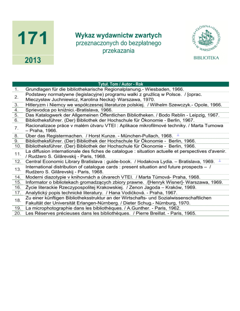 171 Wykaz wydawnictw zwartych przeznaczonych do bezpłatnego przekazania 2013 1. 2. 3. 4. 5. 6. 7. 8. 9. 10. 11. 12. 13. 14. 15. 16. 17. 18. 19. 20. Tytuł. Tom / Autor - Rok Grundlagen für die bibliothekarische Regionalplanung.- Wiesbaden, 1966. Podstawy normatywne (legislacyjne) programu walki z gruźlicą w Polsce. / [oprac. Mieczysław Juchniewicz, Karolina Necka]- Warszawa, 1970. Hitleryzm i Niemcy we współczesnej literaturze polskiej. / Wilhelm Szewczyk.- Opole, 1966. Sprievodca po kniżnici.-Bratislava, 1966. Das Katalogwerk der Allgemeinen Öffentlichen Bibliotheken. / Bodo Reblin - Leipzig, 1967. Bibliotheksführer. (Der) Bibliothek der Hochschule für Ökonomie - Berlin, 1967. Racionalizace práce v malém útvaru VTEI : Aplikace mikrofilmové techniky. / Marta Tumowa – Praha, 1966. Über das Registermachen. / Horst Kunze. - München-Pullach, 1968. Bibliotheksführer. (Der) Bibliothek der Hochschule für Ökonomie - Berlin, 1966. Bibliotheksführer. (Der) Bibliothek der Hochschule für Ökonomie - Berlin, 1966. La diffusion internationale des fiches de catalogue : situation actuelle et perspectives d'avenir. / Rudżero S. Gilârevskij - Paris, 1968. Central Economic Library Bratislava : guide-book. / Hodakova Lydia. – Bratislava, 1969. International distribution of catalogue cards : present situation and future prospects – / Rudżero S. Gilârevskij - Paris, 1968. Moderni diazotypie v knihovnách a útvarech VTEI. / Marta Tůmová- Praha, 1968. Informator o bibliotekach gromadzących zbiory prawne. /[Henryk Wisner]- Warszawa, 1969. Życie literackie Rzeczypospolitej Krakowskiej. / Zenon Jagoda – Kraków, 1969. Analytický popis technické literatury. / Hana Vodićková. - Praha, 1967. Zu einer künftigen Bibliotheksstruktur an der Wirtschafts- und Sozialwissenschaftlichen Fakultät der Universität Erlangen-Nürnberg. / Dieter Schug.- Nürnburg, 1970. La microphotographie dans les bibliothèques. / A.Gunther. - Paris, 1962. Les Réserves précieuses dans les bibliothèques. / Pierre Breillat. - Paris, 1965.