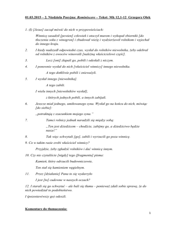 01.03.2015 – 2. Niedziela Pasyjna: Reminiscere – Tekst: Mk 12,1-12 Grzegorz Olek 1. (I) [Jezus] zaczął mówić do nich w przypowieściach: Winnicę zasadził [pewien] człowiek i otoczył murem i wykopał zbiorniki [do tłoczenia soku z winogron] i zbudował wieżę i wydzierżawił rolnikom i wyjechał do innego kraju. 2. 3. 4. I kiedy nadszedł odpowiedni czas, wysłał do rolników niewolnika, żeby odebrał od rolników z owoców winorośli [należną właścicielowi część]. Lecz [oni] złapali go, pobili i odesłali z niczym. I ponownie wysłał do nich [właściciel winnicy] innego niewolnika. A tego dotkliwie pobili i znieważyli. 5. I wysłał innego [niewolnika]. A tego zabili. I wielu innych [niewolników wysłał], z których jednych pobili, a innych zabijali. 6. Jeszcze miał jednego, umiłowanego syna. Wysłał go na końcu do nich, mówiąc [do siebie]: „potraktują z szacunkiem mojego syna.” 7. Tamci rolnicy jednak naradzili się między sobą: „Ten jest dziedzicem – chodźcie, zabijmy go, a dziedzictwo będzie nasze!” 8. Tak więc schwytali [go], zabili i wyrzucili go poza winnicę. 9. Co w takim razie zrobi właściciel winnicy? Przyjdzie, żeby zgładzić rolników i dać winnicę innym. 10. Czy nie czytaliście [nigdy] tego [fragmentu] pisma: Kamień, który odrzucili budowniczowie, Ten stał się kamieniem węgielnym. 11. Przez [działanie] Pana to się wydarzyło I jest [to] cudowne w naszych oczach? 12. I starali się go schwytać – ale bali się tłumu – ponieważ zdali sobie sprawę, że do nich powiedział to podobieństwo. I (pozostawiwszy go) odeszli. Komentarz do tłumaczenia: 1 […] – oznaczają wyrazy, których nie ma w tekście, ale są domyślne w nim zawarte (…) – wyrazy występują w tekście, ale można je pominąć ze względu na polską składnię (są zbędne) w.1.: i wykopał zbiorniki [do tłoczenia soku z winogron] – kopano bądź wykuwano w skale dwa zbiorniki – jeden położony wyżej, płytszy i czworokątny (plus minus 1/1.20 m) i okrągły, położony niżej, które były połączone kanałem. Winogrona wrzucano do wyższego zbiornika, deptano nogami, a sok spływał do zbiornika na moszcz winogronowy, który przelewano do właściwych pojemników, kiedy się wyklarował. Fragment w kontekście (obramowanie): Fragment Mk 12,1-12 przynależy do rozdziałów 11-13, które stanowią wprowadzenie do opowiadania o śmierci i zmartwychwstaniu Jezusa (rozpoczynającego się od 14 rozdziału). Fragment poprzedza opowiadanie o wjeździe Jezusa do Jerozolimy (11,1-11), przeklęcie drzewa figowego (11,12-14), oczyszczenie świątyni (11,15-19). Mk 11,20 rozpoczyna opis kolejnego dnia po wjeździe do Jerozolimy (który kończy się nie wcześniej jak 14,1). Mk 12,1-12 poprzedza mowa wygłoszona przy przeklętym drzewie figowym (11,20-26) i dyskusja w świątyni o pełnomocnictwie Jezusa (11,27-33), na które nie pada żadna odpowiedź (11,33). Omawiana historia stoi w ścisłym związku z pytaniem o pełnomocnictwo Jezusa (11,28). Po omawianym fragmencie następują jeszcze trzy opowiadania rozpoczynające się od pytań przeciwników Jezusa (11,13-17: O płaceniu podatku cesarzowi; 11,18-34: O zmartwychwstaniu; 11,28-34: Największe przykazanie), a następnie mowy zainicjowane przez Jezusa (11,35-37: Chrystus i Dawid; 11,38-40: Ostrzeżenie przed Uczonymi w Piśmie; 11,41-44: Uboga wdowa). Rozdział trzynasty to mowy/a o czasach ostatecznych. Tę przypowieść znajdujemy również w Ewangelii Mateusza (Mt 21,33-46) i Łukasza (20,9-19) – w obu Ewangeliach jest usytuowana po opisie wjazdu do Jerozolimy i otoczona podobnymi perykopami co u Mk, co zwyczajowo tłumaczy się modelem zależności Mt i Łk od materiału Mk. Komentarz: 1. Adresaci przypowieści są wymienieni w Mk 11,27, co potwierdza Mk 12,12. Mowa obrazowa Jezusa jest bardzo mocno osadzona w realiach palestyńskich. Wydaje się, że w Palestynie I w. n.e. istniało wiele latyfundiów, należących do bogatych mieszkańców Cesarstwa Rzymskiego, którzy dzierżawili je bezrolnym, a sami mieszkali w odleglejszych krainach. Uprawa winorośli była w Palestynie bardzo popularna i opłacalna, a same winnice budowano najczęściej poza miastami. Pewien człowiek w przypowieści sadzi winnicę, otacza ją murem ochronnym z kamieni, wykopuje zbiorniki do tłoczenia soku z winogron oraz buduje wieżę – wieża służyła do pilnowania winnicy oraz była miejscem wypoczynku dla pracowników w trakcie 2 zbiorów. Wspomniany człowiek wydzierżawia winnicę bezrolnym, umawiając się na odpowiedni zysk z tego, co wyrośnie i odjeżdża, prawdopodobnie do większego miasta, albo swojej rezydencji w innej krainie. Winnica i właściciel są oddzieleni przestrzennie – to odgrywa dużą rolę w historii. Taki opis musiał przywodzić czytelnikom na myśl znany fragment Iz 5,1-2. W takim wypadku winogrodnikiem jest jednoznacznie Bóg, a winnicą Izrael. Dzierżawcami byliby przywódcy ludu, co pokrywa się z adresatami przypowieści. C. Keener wskazuje, że niektórzy żydowskie interpretacje w czasach Jezusa widziały w Iż 5 zapowiedź zburzenia świątyni z 586 r. p.n.e. 2. Odpowiedni czas to około cztery do pięciu lat, czyli okres pierwszych zbiorów winogron z posadzonej winnicy. Właściciel wysyła swojego niewolnika, który ma odebrać ustaloną wcześniej z rolnikami część zbiorów – z soku gronowego produkowano nie tylko wino, ale też, po obróbce termicznej rodzaj miodu. Musi tu chodzić o wyżej postawionego niewolnika, który reprezentował interesy właściciela. Część należna właścicielowi winnicy wynosiła nieraz od jednej czwartej do połowy zbiórów. 3. Rolnicy reagują wrogo, znieważając posłańca właściciela winnicy. Co ważne, nieraz zdarzało się w tamtych czasach, że winnice były uzurpowane przez dzierżawiących je rolników, ponieważ właściciele mieszkali daleko. Znieważając wysłanego niewolnika, znieważają oni sam