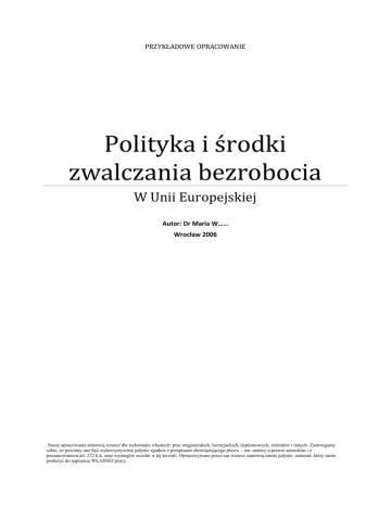 PRZYKŁADOWE OPRACOWANIE Polityka i środki zwalczania bezrobocia W Unii Europejskiej Autor: Dr Maria W…… Wrocław 2006 Nasze opracowania stanowią wzorce dla wykonania własnych prac magisterskich, licencjackich, dyplomowych, referatów i innych. Zastrzegamy sobie, że powinny one być wykorzystywane jedynie zgodnie z przepisami obowiązującego prawa - tzn. ustawy o prawie autorskim i z poszanowaniem art. 272 k.k. oraz wymogów uczelni w tej kwestii. Opracowywane przez nas wzorce stanowią zatem jedynie materiał, który może posłużyć do napisania WŁASNEJ pracy. Spis treści: Wstęp .......................................................................................................................................... 3 Rozdział I. Polityka społeczna a istota i mechanizm wspólnego rynku pracy ........................... 4 1.1. Miejsce i rola polityki społecznej w życiu społeczeństwa. .............................................. 4 1.2. Zagrożenia społeczne i ich rodzaje .................................................................................. 6 1.3. Bezrobocie jako jedno z zagrożeń społecznych ............................................................... 8 1.4. Polityka zatrudnienia i wspólny rynek pracy w Unii Europejskiej ................................ 12 1.4.1. Cztery filary polityki zatrudnienia w Unii europejskiej........................................... 23 1.4.2. Instrumenty polityki zatrudnienia ............................................................................ 25 1.5. Przepływ pracowników w Unii Europejskiej ................................................................ 27 1.6. Wspólny rynek pracy ..................................................................................................... 29 1.7. Zastosowanie zasady swobody przepływu osób w praktyce. ........................................ 30 Rozdział II. Źródła i skala bezrobocia w wybranych krajach Unii Europejskiej ..................... 35 2.1. Bezrobocie w Wielkiej Brytanii ..................................................................................... 39 2.2. Walka z bezrobociem w Holandii .................................................................................. 41 2.3. Dania .............................................................................................................................. 42 Rozdział III. Instrumenty przeciwdziałania bezrobociu w Unii Europejskiej ......................... 44 Zakończenie ............................................................................................................................. 51 Bibliografia............................................................................................................................... 54 1 Spis ilustracji Spis tabel: Tabela 1. Stopa bezrobocia w Polsce w latach 1990-2005 (bezrobocie rejestrowane) ............ 35 Tabela 2. Średnie bezrobocie w piętnastu krajach Unii Europejskiej w 2004r. ...................... 37 Spis rysunków: Rysunek 1. Podaż pracy ........................................................................................................... 17 Rysunek 2. Statystyka bezrobocia – województwa. Stan na dzień 28.02.2005r...................... 36 Rysunek 4. Bezrobocie w krajach Unii w porównaniu z Polską.............................................. 38 Rysunek 5. Stopa bezrobocia w krajach Unii Europejskiej w poszczególnych latach 19952000 ................................................................................................................................... 38 2 Wstęp Przedmiotem analizy niniejszego opracowania jest polityka i środki zwalczania bezrobocia w Unii Europejskiej. Bezrobocie jest uważane za jeden z największych problemów społecznych naszych czasów. Ponadto jest zjawiskiem, które może dotknąć każdego bez wyjątku na pewnym etapie życia. W naszym kraju, pomimo pewnych starań podejmowanych w ciągu ostatnich 15 lat, zjawiska tego nie udaje się opanować. Co jest zatem przyczyną, że innym krajom się udaje a nam nie? Czy wejście w struktury unijne pomoże w jakiś sposób nad nim zapanować. Chęć odpowiedzi na te pytania badawcze skłoniła autorkę do zajęcia się tym tematem. Polityka na rzecz maksymalnie wysokiego poziomu zatrudnienia (zwana w skrócie polityką zatrudnienia) jest jedną z najnowszych form wspólnej polityki Wspólnoty Europejskiej. Wyrosła ona na gruncie polityki społecznej. Podniesienie polityki zatrudnienia do wyższej rangi i nadanie jej charakteru priorytetowego nastąpiło dopiero pod koniec lat dziewięćdziesiątych. Miejsce polityka zatrudnienia w kontekście spraw polityki społecznej i rynku pracy przedstawiono w rozdziale pierwszym. W rozdziale kolejnym opisano sytuację dotyczącą problemu bezrobocia w wybranych krajach Wspólnoty. Przeanalizowano także sposoby radzenia sobie z tym zjawiskiem w poszczególnych krajach. W rozdziale ostatnim opisano instrumenty polityki zatrudnienia i przeciwdziałania bezrobociu. Praca została napisana na podstawie studiów literatury przedmiotu i badań przeprowadzonych na ten temat przez innych autorów i ośrodki badawcze. Ze względu na charakter danych i dostępność badań przeprowadzonych przez profesjonalne instytucje nie było potrzeby prowadzić badań pierwotnych. Autorka zdaje sobie sprawę, że nie wyczerpała tematu, jednak ma nadzieję , że udało jej się rzucić pewne światło na kwestie rozwiązywania problemu w Unii Europejskiej 3 Rozdział I. Polityka społeczna a istota i mechanizm wspólnego rynku pracy Aby mówić o polityce i środkach zwalczania bezrobocia w Unii Europejskiej warto najpierw zastanowić się nad tym, jakie mechanizmy tu działają. Bezrobocie jest zjawiskiem społecznym, a więc jest przedmiotem zainteresowania polityki społecznej zarówno na poziomie państwa, jak i wspólnego rynku. Bezrobocie jest też swego rodzaju zagrożeniem społecznym i także z tego względu