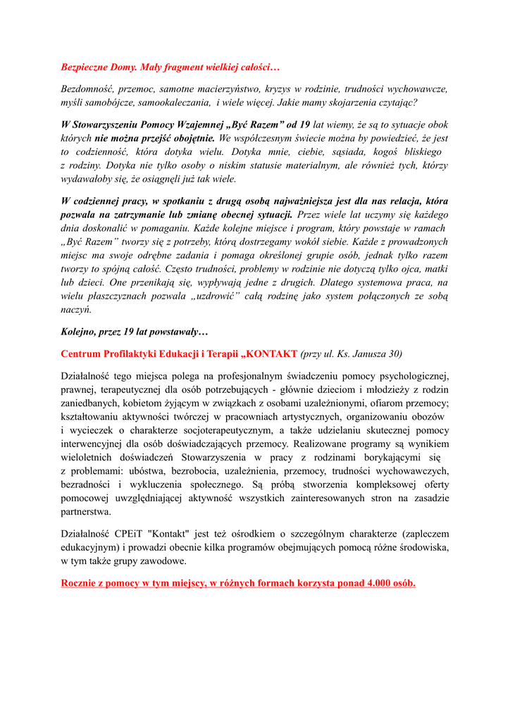 Bezpieczne Domy. Mały fragment wielkiej całości… Bezdomność, przemoc, samotne macierzyństwo, kryzys w rodzinie, trudności wychowawcze, myśli samobójcze, samookaleczania, i wiele więcej. Jakie mamy skojarzenia czytając? W Stowarzyszeniu Pomocy Wzajemnej „Być Razem” od 19 lat wiemy, że są to sytuacje obok których nie można przejść obojętnie. We współczesnym świecie można by powiedzieć, że jest to codzienność, która dotyka wielu. Dotyka mnie, ciebie, sąsiada, kogoś bliskiego z rodziny. Dotyka nie tylko osoby o niskim statusie materialnym, ale również tych, którzy wydawałoby się, że osiągnęli już tak wiele. W codziennej pracy, w spotkaniu z drugą osobą najważniejsza jest dla nas relacja, która pozwala na zatrzymanie lub zmianę obecnej sytuacji. Przez wiele lat uczymy się każdego dnia doskonalić w pomaganiu. Każde kolejne miejsce i program, który powstaje w ramach „Być Razem” tworzy się z potrzeby, którą dostrzegamy wokół siebie. Każde z prowadzonych miejsc ma swoje odrębne zadania i pomaga określonej grupie osób, jednak tylko razem tworzy to spójną całość. Często trudności, problemy w rodzinie nie dotyczą tylko ojca, matki lub dzieci. One przenikają się, wypływają jedne z drugich. Dlatego systemowa praca, na wielu płaszczyznach pozwala „uzdrowić” całą rodzinę jako system połączonych ze sobą naczyń. Kolejno, przez 19 lat powstawały… Centrum Profilaktyki Edukacji i Terapii „KONTAKT (przy ul. Ks. Janusza 30) Działalność tego miejsca polega na profesjonalnym świadczeniu pomocy psychologicznej, prawnej, terapeutycznej dla osób potrzebujących - głównie dzieciom i młodzieży z rodzin zaniedbanych, kobietom żyjącym w związkach z osobami uzależnionymi, ofiarom przemocy; kształtowaniu aktywności twórczej w pracowniach artystycznych, organizowaniu obozów i wycieczek o charakterze socjoterapeutycznym, a także udzielaniu skutecznej pomocy interwencyjnej dla osób doświadczających przemocy. Realizowane programy są wynikiem wieloletnich doświadczeń Stowarzyszenia w pracy z rodzinami borykającymi się z problemami: ubóstwa, bezrobocia, uzależnienia, przemocy, trudności wychowawczych, bezradności i wykluczenia społecznego. Są próbą stworzenia kompleksowej oferty pomocowej uwzględniającej aktywność wszystkich zainteresowanych stron na zasadzie partnerstwa. Działalność CPEiT "Kontakt" jest też ośrodkiem o szczególnym charakterze (zapleczem edukacyjnym) i prowadzi obecnie kilka programów obejmujących pomocą różne środowiska, w tym także grupy zawodowe. Rocznie z pomocy w tym miejscy, w różnych formach korzysta ponad 4.000 osób. Dom dla osób doświadczających przemocy domowej (Powiatowy Ośrodek Wsparcia dla Osób Dotkniętych Przemocą w Rodzinie przy ul. Mała łąka 17 a) Mieszkańcy już od pierwszych dni pobytu są objęci pomocą wielu specjalistów – pedagogów, psychologa, prawnika, pracownika socjalnego, pielęgniarki, certyfikowanego specjalisty w zakresie pomocy osobom dotkniętym przemocą w rodzinie. Jest to miejsce działające w trybie 24 godzinnym. W ramach Powiatowego Ośrodka Wsparcia prowadzone jest również poradnictwo psychologiczne oraz prawne dla osób, które nie wymagają schronienia – kobiet, mężczyzn i dzieci. Każdego dnia i każdej nocy o komfort i bezpieczeństwo mieszkańców dbają pracownicy pełniący dyżur interwencyjny. Przemoc domowa, którą dotknięte są osoby tutaj mieszkające to bardzo trudny i raniący temat ponieważ osobami, które krzywdzą nie są przypadkowi ludzie lecz najbliższe osoby – ukochany mąż lub partner – ten który miał być pomocą, opoką i wsparciem. Panie oraz ich dzieci, które są zmuszone opuścić swoje miejsce zamieszkania i szukać schronienia najbardziej potrzebują spokoju, wsparcia, życzliwego towarzyszenia w codzienności by po woli odbudowywać poczucie godności, szacunku do samej siebie i z czasem odzyskać wiarę w niekrzywdzące relacje z ludźmi. Ogromnym wsparciem, często początkiem decyzji o odejściu z domu rodzinnego jest Telefon Zaufania. Od 19.00 – 7.00 można uzyskać wsparcie dzwoniąc pod numer 33-851-29-29 na wielu płaszczyznach życia codziennego, nie tylko doświadczając przemocy. Rocznie w tym miejscu mieszka ok. 40 osób (mam z dziećmi), ponad 500 osób korzysta z pomocy i wsparcia psychologa, prawnika, pracowników przy telefonie zaufania. DOM dla osób doświadczających bezdomności (Centrum Edukacji Socjalnej przy ul. Błogockiej 30, z domami docelowymi przy ul. Kasztanowej 8 i ul. Frysztackiej 69) Ten Dom powstał przy udziale samych mieszkańców. To założyciel Stowarzyszenia wraz z osobami bezdomnymi wyremontowali stare budynki, które dzisiaj są Ich Domem. Podstawą Centrum Edukacji Socjalnej są Domy Wspólnoty, a ich fundamentem mieszkańcy. Domy to trzon, to serce, to źródło - z tego źródła biją często pomysły i inspiracje, które kształtują i wpływają na charakter tego miejsca, to także „oddawanie pomocy" niezwykle ważna zasada pozwalająca osobom wykluczonym odzyskiwać wartość i własną godność poprzez pomaganie innym osobom wykluczonym, szczególnie tym znajdującym się jeszcze w trudnej sytuacji życiowej. Zasada ta dotyczy szczególnie osób bezdomnych i uzależnionych. Oddawanie pomocy to pomaganie sobie nawzajem; ludziom z bezpośredniego otoczenia i całej lokalnej społeczności". Centrum Edukacji Socjalnej to miejsce, którego celem jest udzielanie wsparcia i długofalowej, dostosowanej do indywidualnych potrzeb pomocy, głownie osobom zagrożonym wykluczeniem i wykluczonym społecznie. Tutaj nie dostaje się łózka do spania i talerza zupy, w tym Domu dostaje się coś więcej. Dostaje się relacje, dostaje się uwagę drugiej osoby. Dostaje się możliwość zmiany swojego jutra na inne, na bezpieczne i godne człowieka. Tutaj jest możliwość odbudowania relacji z rodziną, otrzymania legalnej 