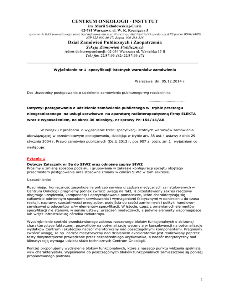 CENTRUM ONKOLOGII - INSTYTUT im. Marii Skłodowskiej-Curie 02-781 Warszawa, ul. W. K. Roentgena 5 wpisane do KRS prowadzonego przez Sąd Rejonowy dla m.st. Warszawy, XIII Wydział Gospodarczy KRS pod nr 0000144803 NIP 525-000-80-57; Regon 000-288-336 Dział Zamówień Publicznych i Zaopatrzenia Sekcja Zamówień Publicznych Adres do korespondencji: 02-034 Warszawa ul. Wawelska 15 B Tel./ fax. 22/57-09-462; 22/57-09-474 ________________________________________________________________ Wyjaśnienie nr 1 specyfikacji istotnych warunków zamówienia Warszawa dn. 05.12.2014 r. Do: Uczestnicy postępowania o udzielenie zamówienia publicznego-wg rozdzielnika ……………………………….. Dotyczy: postępowania o udzielenie zamówienia publicznego w trybie przetargu nieograniczonego na usługi serwisowe na aparaturę radioterapeutyczną firmy ELEKTA wraz z wyposażeniem, na okres 36 miesięcy, nr sprawy Pn-154/14/AR W związku z prośbami o wyjaśnienie treści specyfikacji istotnych warunków zamówienia obowiązującej w przedmiotowym postępowaniu, działając w trybie art. 38 ust.4 ustawy z dnia 29 stycznia 2004 r. Prawo zamówień publicznych (Dz.U.2013 r. poz.907 z późn. zm.), wyjaśniam co następuje: Pytanie 1 Dotyczy Załącznik nr 5a do SIWZ oraz odnośne zapisy SIWZ Prosimy o zmianę sposobu podziału i grupowania w zakresie konfiguracji sprzętu objętego przedmiotem postępowania oraz stosowne zmiany w całości SIWZ w tym zakresie. Uzasadnienie: Rozumiejąc konieczność zaspokojenia potrzeb serwisu urządzeń medycznych zainstalowanych w Centrum Onkologii pragniemy jednak zwrócić uwagę na fakt, iż przedstawiony zakres rzeczowy obejmuje urządzenia, komponenty i oprzyrządowanie pomocnicze, które charakteryzują się całkowicie odmiennym sposobem serwisowania i wymaganiami faktycznymi w odniesieniu do czasu reakcji, naprawy, częstotliwości przeglądów, podejścia do części zamiennych i polityki handlowoserwisowej producentów w/w elementów specyfikacji. W istocie, część z omawianych elementów specyfikacji nie stanowi, w sensie ustawy, urządzeń medycznych, a jedynie elementy wspomagające lub wręcz infrastrukturę ośrodka radioterapii. Wyodrębnienie spośród przedstawionego zakresu rzeczowego bloków funkcjonalnych o zbliżonej charakterystyce faktycznej, pozwoliłoby na optymalizację wyceny a w konsekwencji na optymalizację wydatków Centrum i skuteczny nadzór merytoryczny nad poszczególnymi komponentami. Pragniemy zwrócić uwagę, że np. nadzór merytoryczny nad działaniem akceleratorów jest realizowany poprzez testy dozymetryczne prowadzone przez bezpośredniego użytkownika, a nadzór merytoryczny nad klimatyzacją wymaga udziału służb technicznych Centrum Onkologii. Poniżej proponujemy wydzielenie bloków funkcjonalnych, które z naszego punktu widzenia spełniają w/w charakterystyki. Wyjaśnienia do poszczególnych bloków funkcjonalnych zamieszczone są poniżej proponowanego podziału. 1 Lp. Lokalizacja System Nazwa szczegółowa Nr seryjny Synergy (E1) #151144 Synergy (E2) #151449 Synergy (E3) #152298 Netgear RNDP6000 #2H0627R900 136 Monaco HP Z800 OncentraExternal Beam Serwer (DL380 G7) #40049795 CZC0379NMX #17206EF2 Z820 (OMP-FD) CZC3474JRJ Z820 (OMP-FG) CZC3474JRK Z620 (OMP-MC) CZC3460Q60 Z620 (OMP-DR) CZC3460Q62 Z620 (OMP-BK) CZC3460Q5Z Z620 (OMP-AD) CZC3460Q63 I. PRZYSPIESZACZE 1. 2. Wawelska Wawelska 3. Wawelska 3.1 Wawelska 4. 4.1 Przyspieszacz liniowy w konfiguracji: - przyspieszacz - stół terapeutyczny - PreciseTable - kolimator wielolistkowy - MLCi2 - system obrazowania EPID - iViewGT - system obrazowania CBCT - XVI Przyspieszacz liniowy w konfiguracji: - przyspieszacz - stół terapeutyczny - PreciseTable - kolimator wielolistkowy - MLCi2 - system obrazowania EPID - iViewGT - system obrazowania CBCT – XVI Przyspieszacz liniowy w konfiguracji: - przyspieszacz - stół terapeutyczny - PreciseTable - kolimator wielolistkowy - MLCi2 - system obrazowania EPID - iViewGT - system obrazowania CBCT - XVI Wyposażenie akceleratorów / archiwizacja i backup II. SYSTEMY PLANOWANIA LECZENIA Wawelska System Planowania Leczenia:. Wawelska Monaco Serwer 5. Wawelska System Planowania Leczenia: 5.1 Wawelska Serwer 5.2 Wawelska 5.3 Wawelska 5.4 Wawelska 5.5 Wawelska 5.6 5.7 Wawelska 5.8 Wawelska 5.9 Wawelska klient planowanie zestaw komputerowy klient planowanie zestaw komputerowy klient konturowanie zestaw komputerowy klient konturowanie zestaw komputerowy klient konturowanie zestaw komputerowy klient konturowanie zestaw komputerowy klient konturowanie zestaw komputerowy Z620 (OMP-GB) CZ2042GNXV CZC3460Q5Y 2 5.10 Wawelska 5.11 Wawelska 6. 7. Brachyterapia Brachyterapia klient konturowanie zestaw komputerowy klient - dane helax zestaw komputerowy System planowania Leczenia w konfiguracji: - Serwer - 1szt. - Oncentra Brachy - klient - 3szt. System planowania Leczenia Brachyterapii HDR Prostaty Z620 (OMPKONT) CZC3460Q61 xw6200 CZC6151Y97 OncentraBrachy #1128B127 OncentraProstat e #70094 OncentraMaster Plan #2417B4D1 Z800 Z800 Z800 FF825AV FF825AV FF825AV System planowania leczenia w konfiguracji: - MasterPlan serwer - 1 szt. (Proliant DL380 G7) 8. Roentgena 8.1 8.2 8.3 Roentgena Roentgena Roentgena MasterPlan-klient zestaw komputerowy MasterPlanzestaw komputerowy MasterPlanzestaw komputerowy III. WYPOSAŻENIE DODATKOWE SYSTEMÓW PLANOWANIA LECZENIA 9. Brachyterapi a Archiwum DICOM - DICOM Serwer wraz z oprogramowaniem Archiwum DICOM #BT001 10. Wawelska Archiwum DICOM - DICOM Serwer wraz z oprogramowaniem Archiwum DICOM #003 11. Roentgena Archiwum DICOM - DICOM Serwer wraz z oprogramowaniem Archiwum DICOM #007 12 12.1 12.2 12.3 12.4 IV.SYSTEM WERYFIKACJI I ZARZĄDZANIA - KONFIGURACJA PODSTAWOWA System R&V MOSAIQ Wawelska #MCI001F Linksys 7PI00G40405 Wawelska macierz techniczna NSS4000 1 Serwer do klastra Mosaiq Wawelska Serwer CZC8480C44 górny (DL380G5) Serwer do klastra Mosaiq Wawelska Serwer CZC8480BXL górny (DL380G5) Wawelska Maci